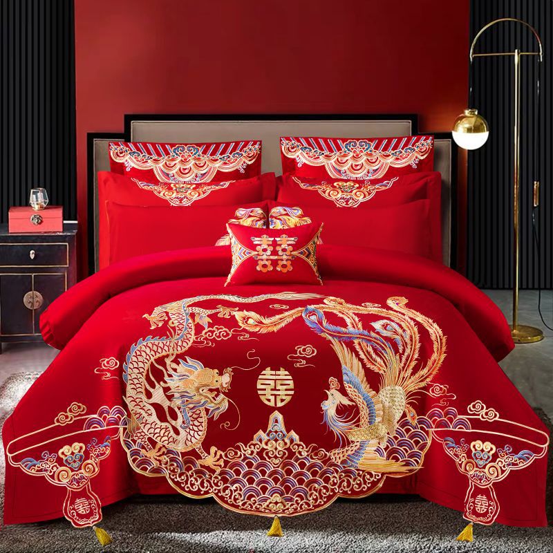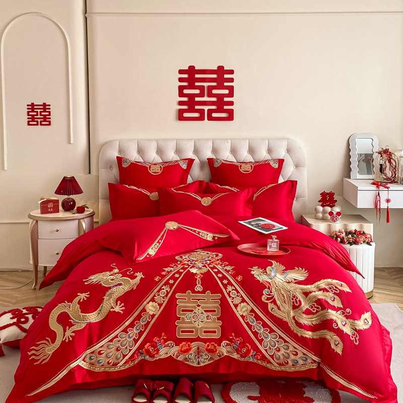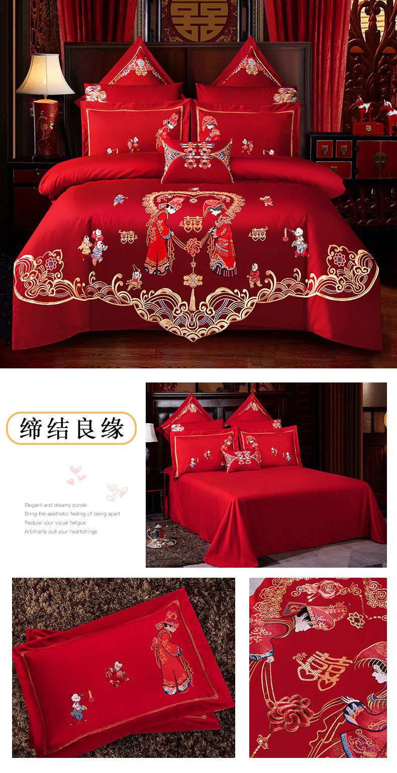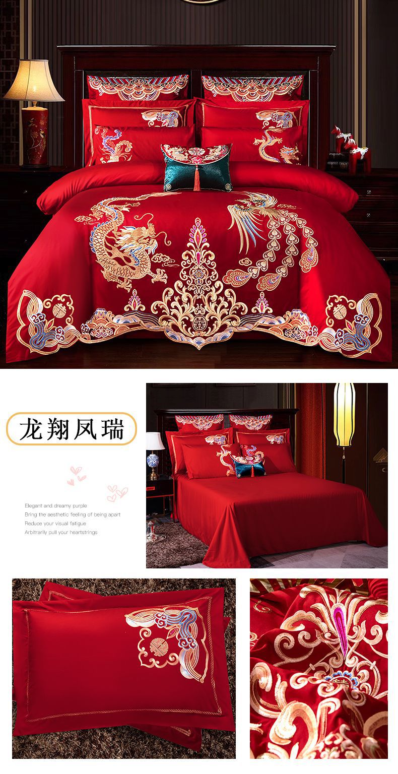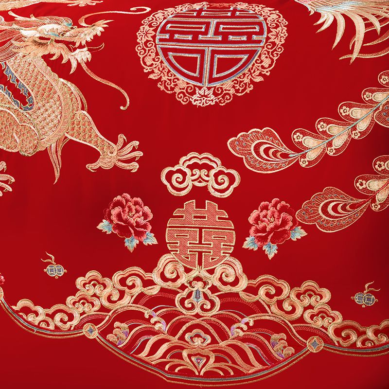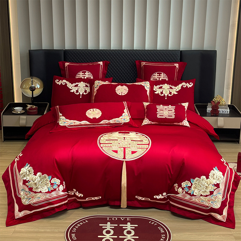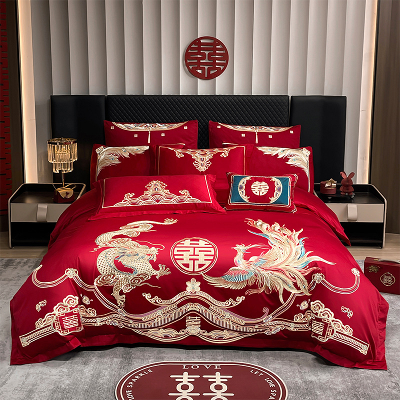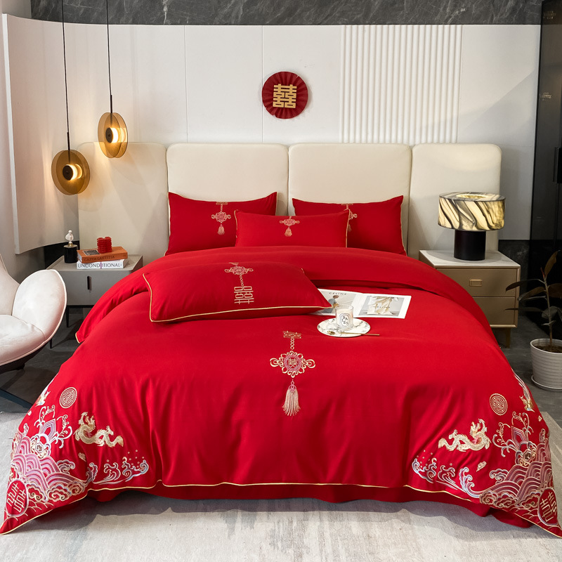 Китайский свадебный комплект из четырех предметов, красное вышитое свадебное одеяло для спальни, вышитый свадебный пододеяльник, комплект постельного белья из шести предметов
