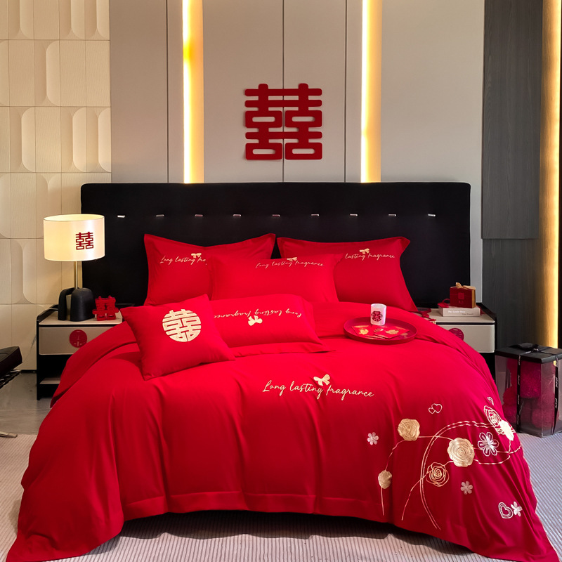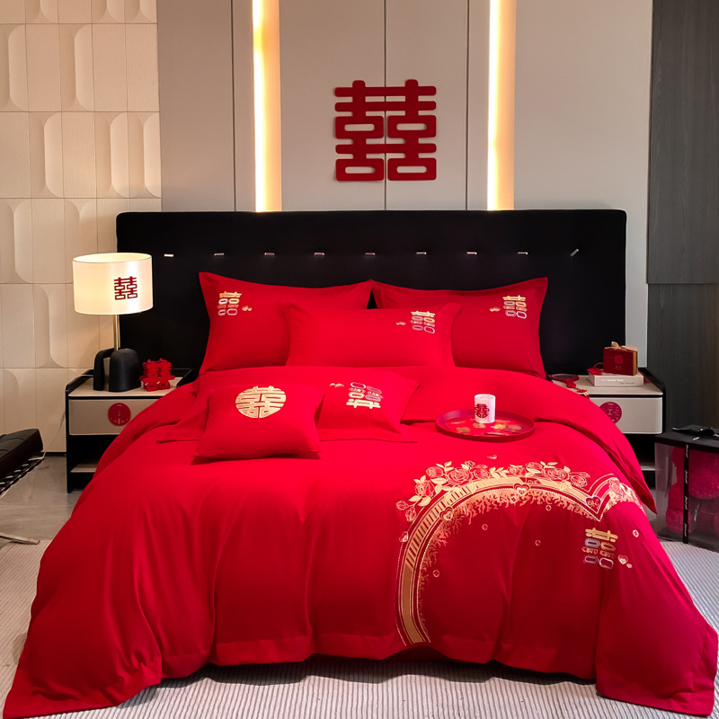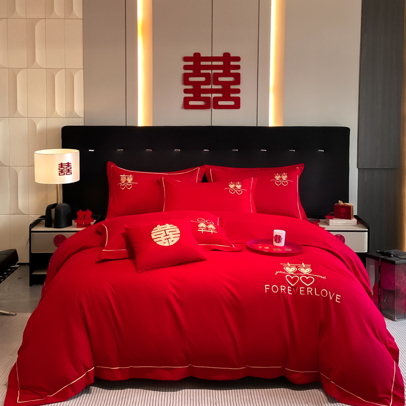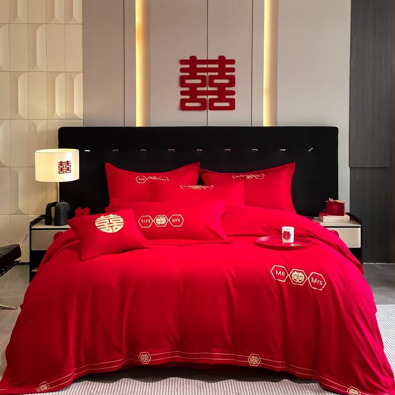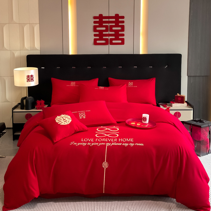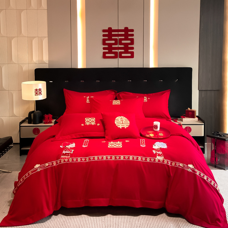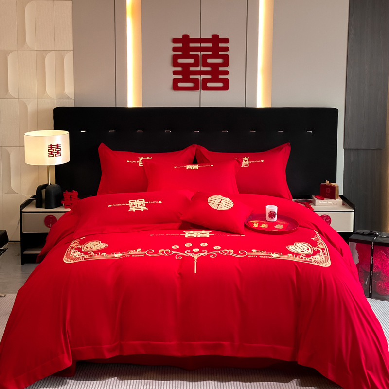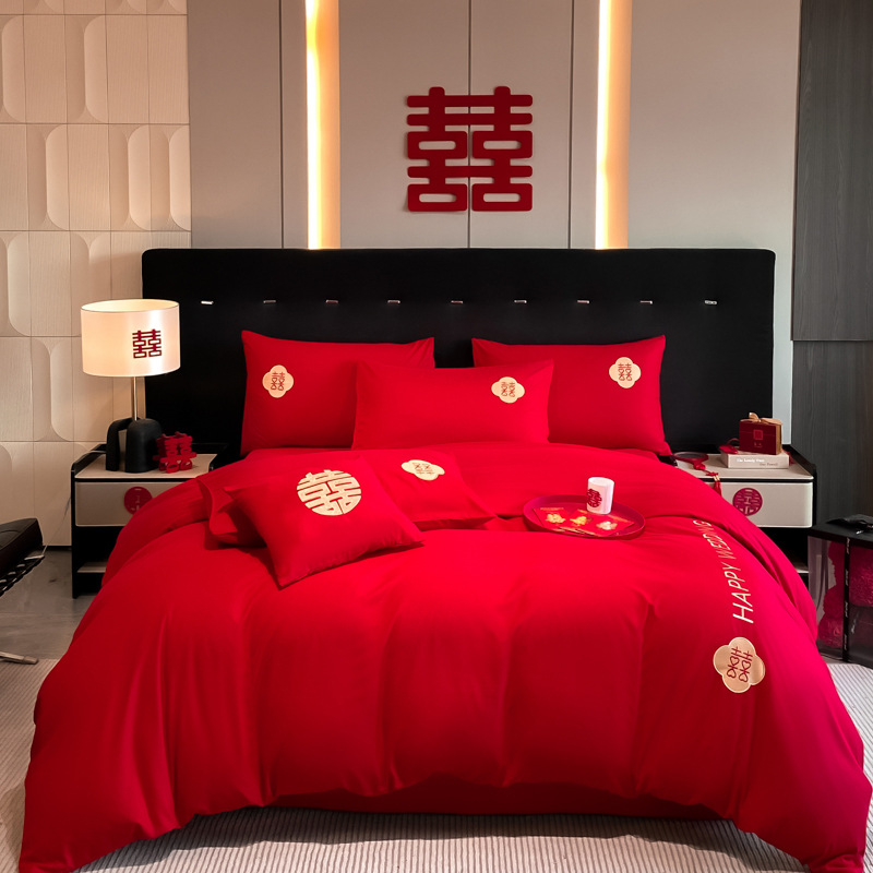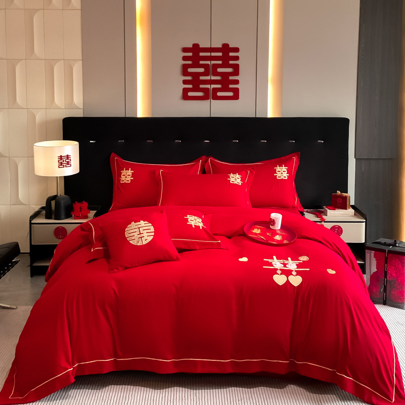 Свадебный комплект из четырех предметов из чистого хлопка, ярко-красное свадебное постельное белье, постельное белье для молодоженов, покрывало для свадебной комнаты, оптовая продажа свадебных покрывал