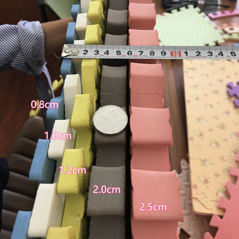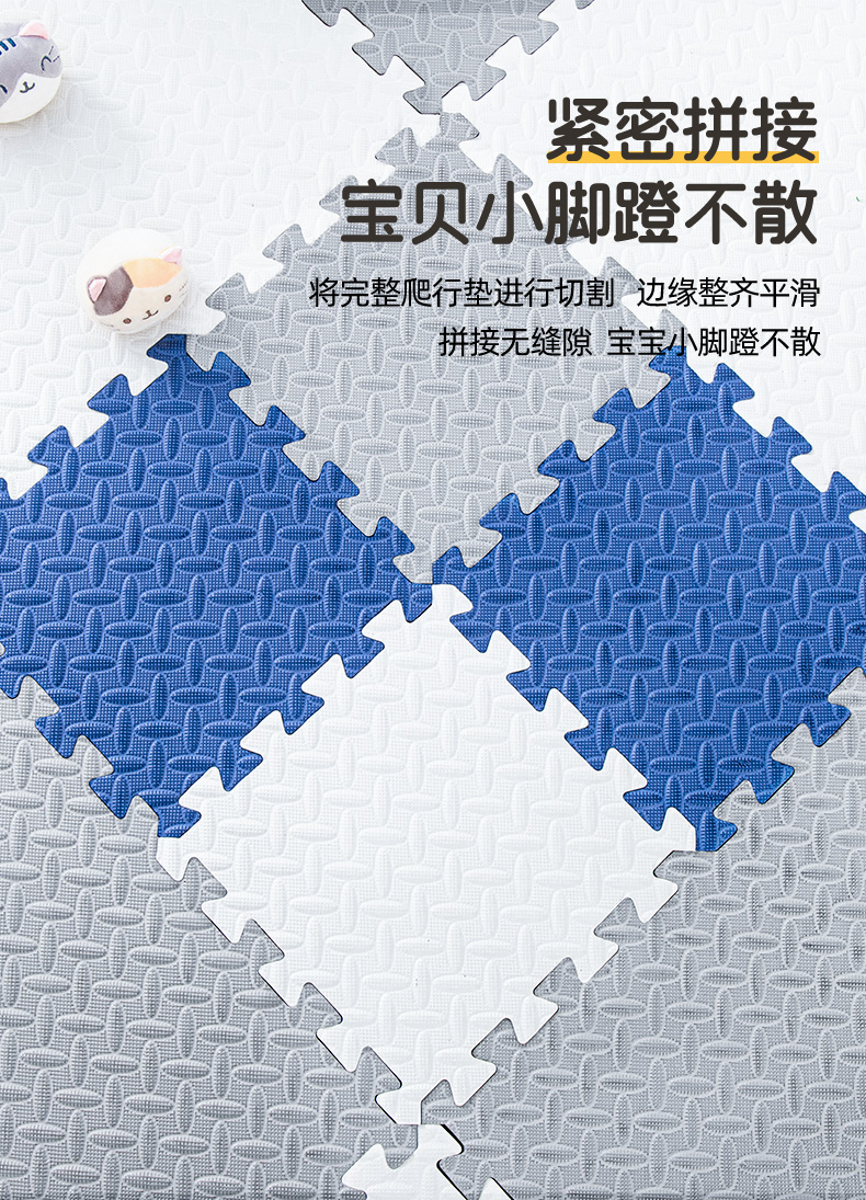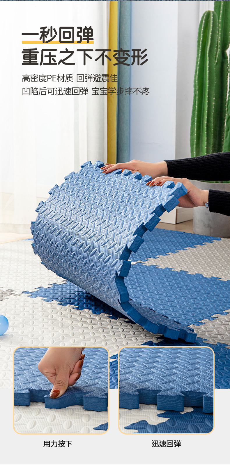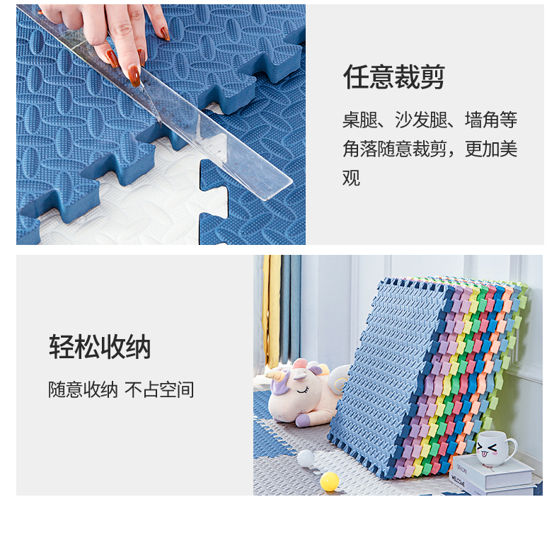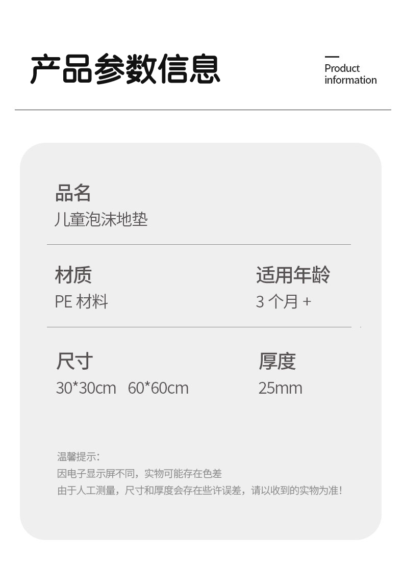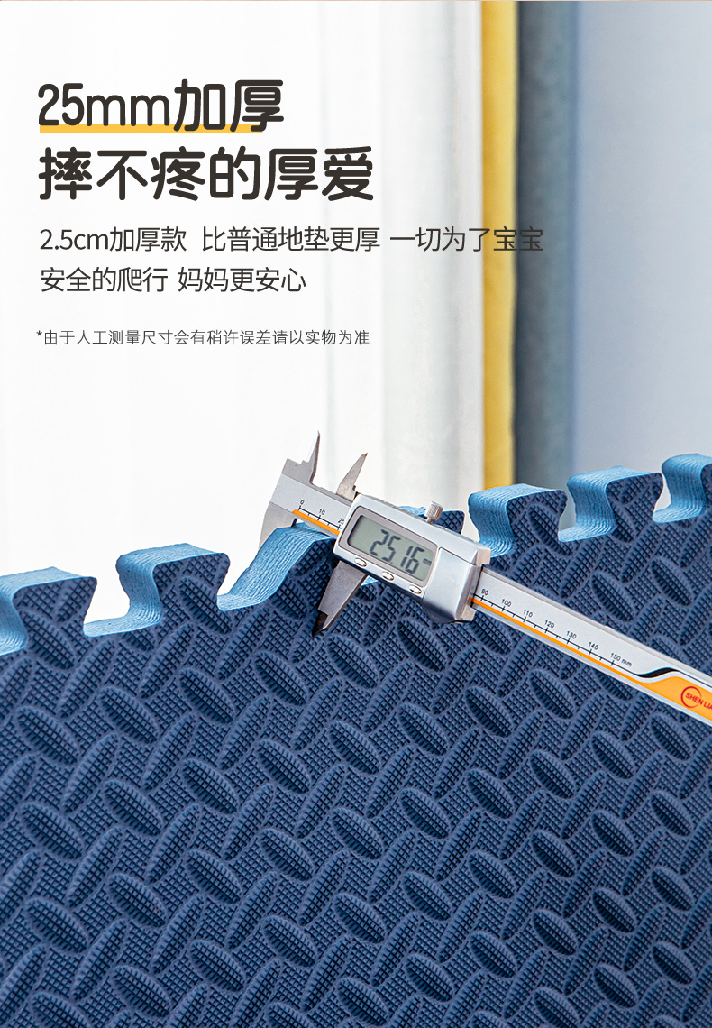 关于尺寸:地垫高温发泡一次成型,厚度会有1-2mm的工业误差,没法避免,用直尺或者卷尺测量建议把地垫摞起来测10个取平均厚度较为准确;长宽尺寸由于手工测量可能存在1-3cm的误差;对尺寸要求精准的亲慎拍。