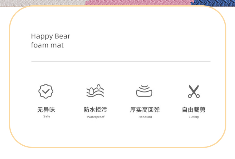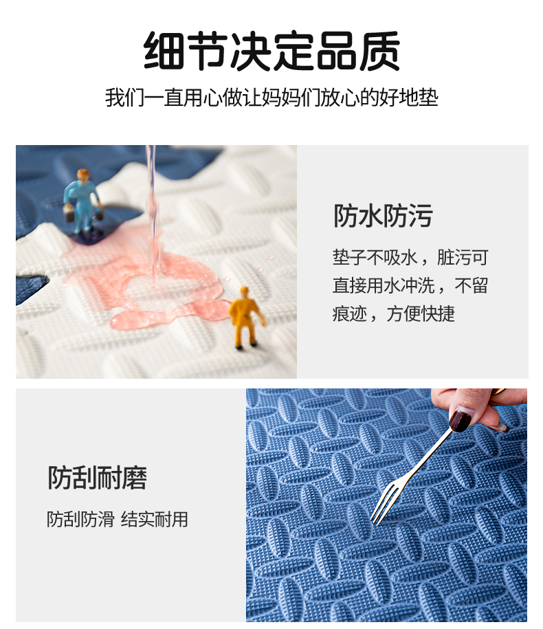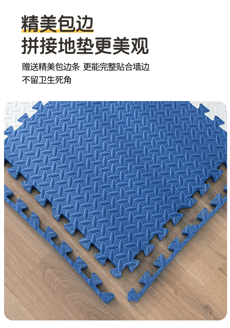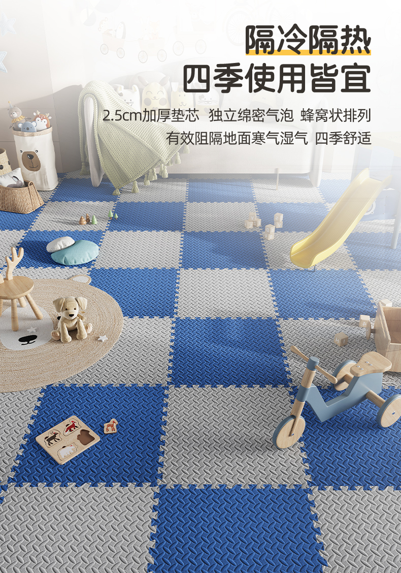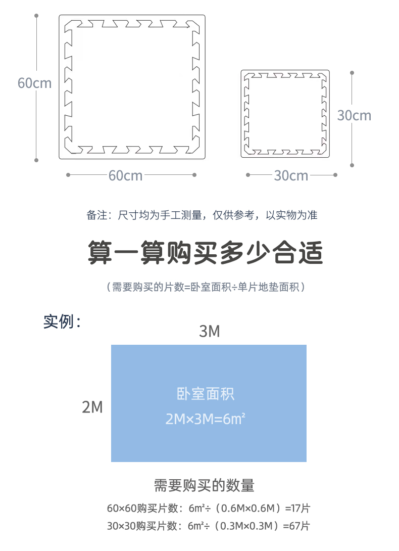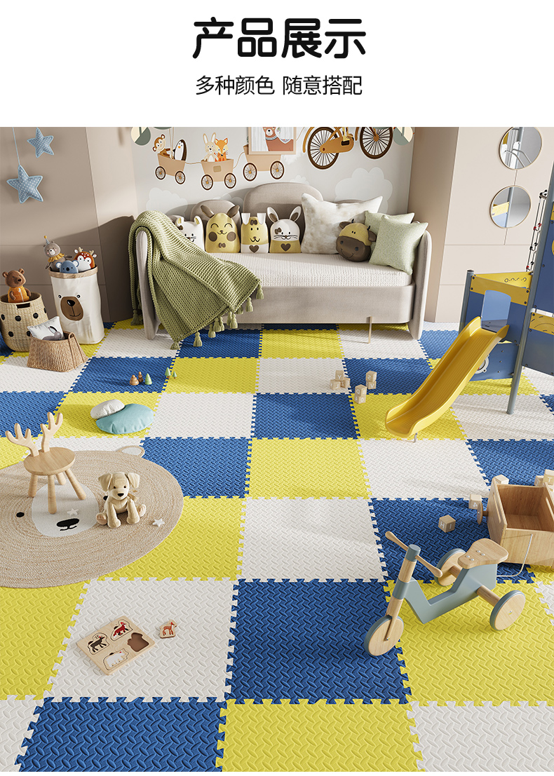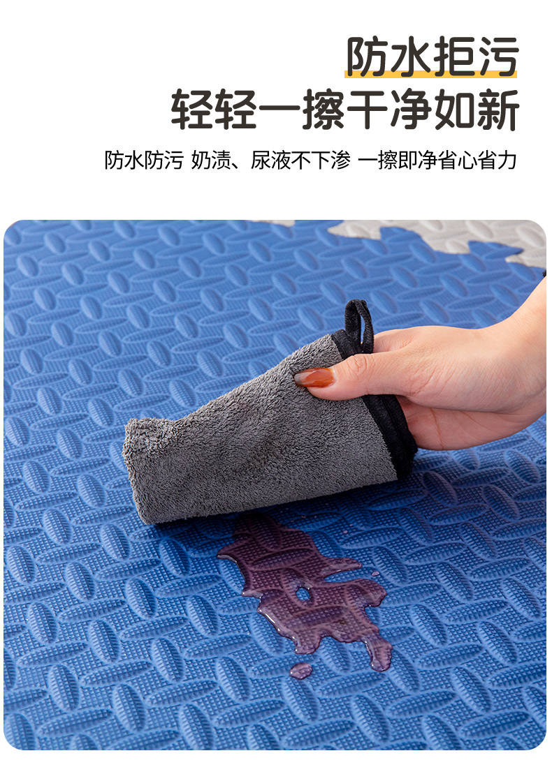 关于尺寸:地垫高温发泡一次成型,厚度会有1-2mm的工业误差,没法避免,用直尺或者卷尺测量建议把地垫摞起来测10个取平均厚度较为准确;长宽尺寸由于手工测量可能存在1-3cm的误差;对尺寸要求精准的亲慎拍。