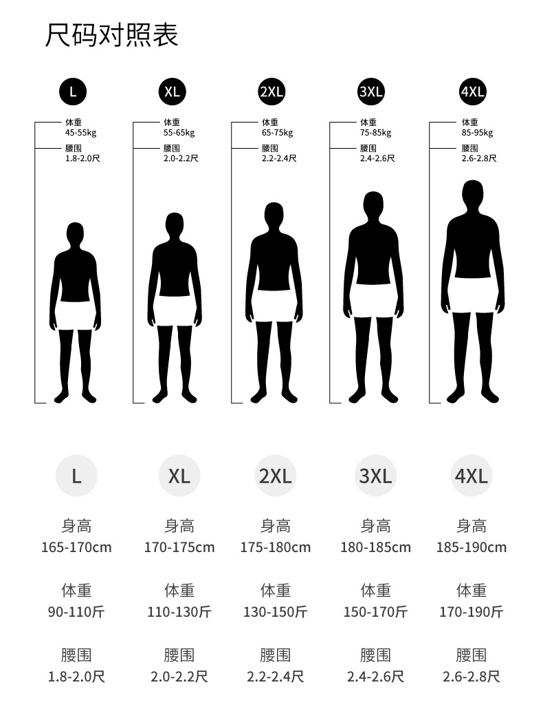L 45-55kg; XL 50-65kg; 2XL 65-75kg; 3XL 75-85kg; 4XL 85-95kg