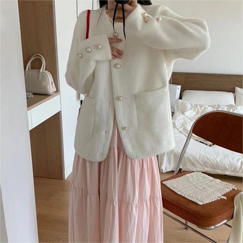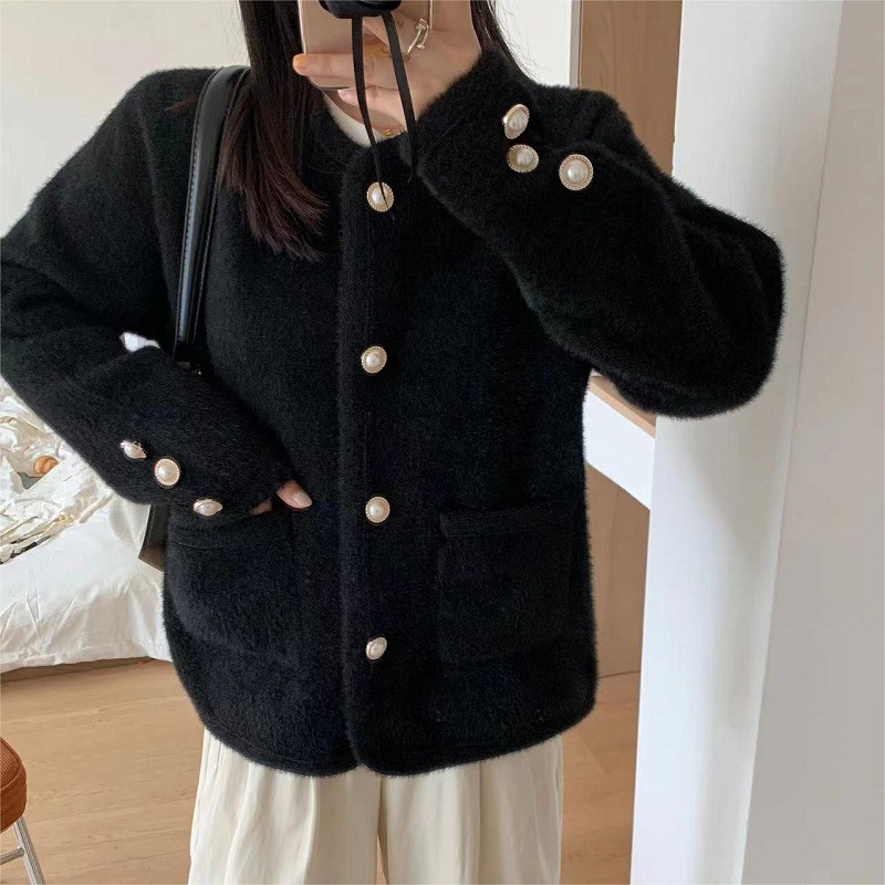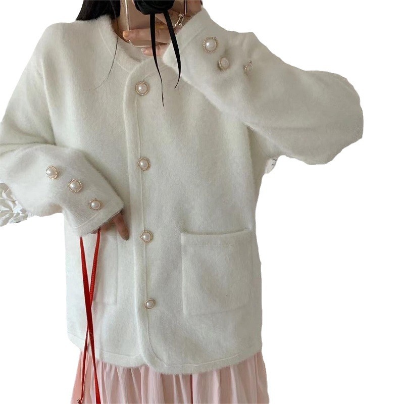 Французский маленький ароматный ветер светская жемчужная пряжка трикотажный кардиган с круглым вырезом