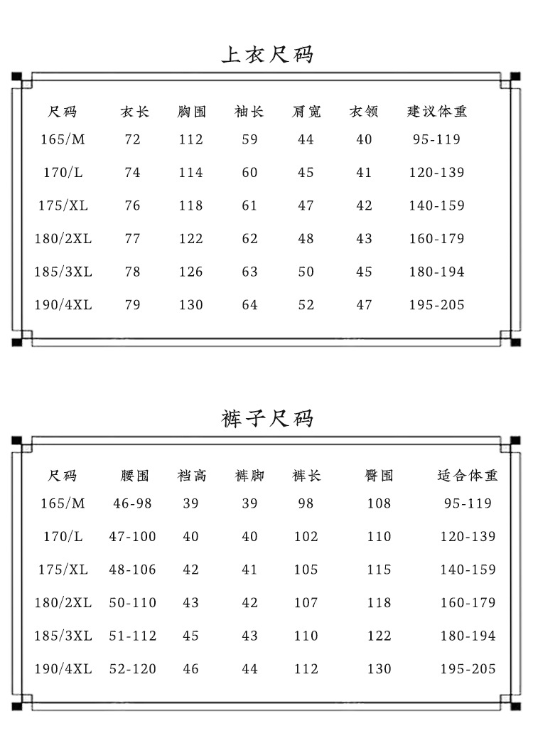165/M; 170/L; 175/XL; 180/2XL; 185/3XL; 190/4XL