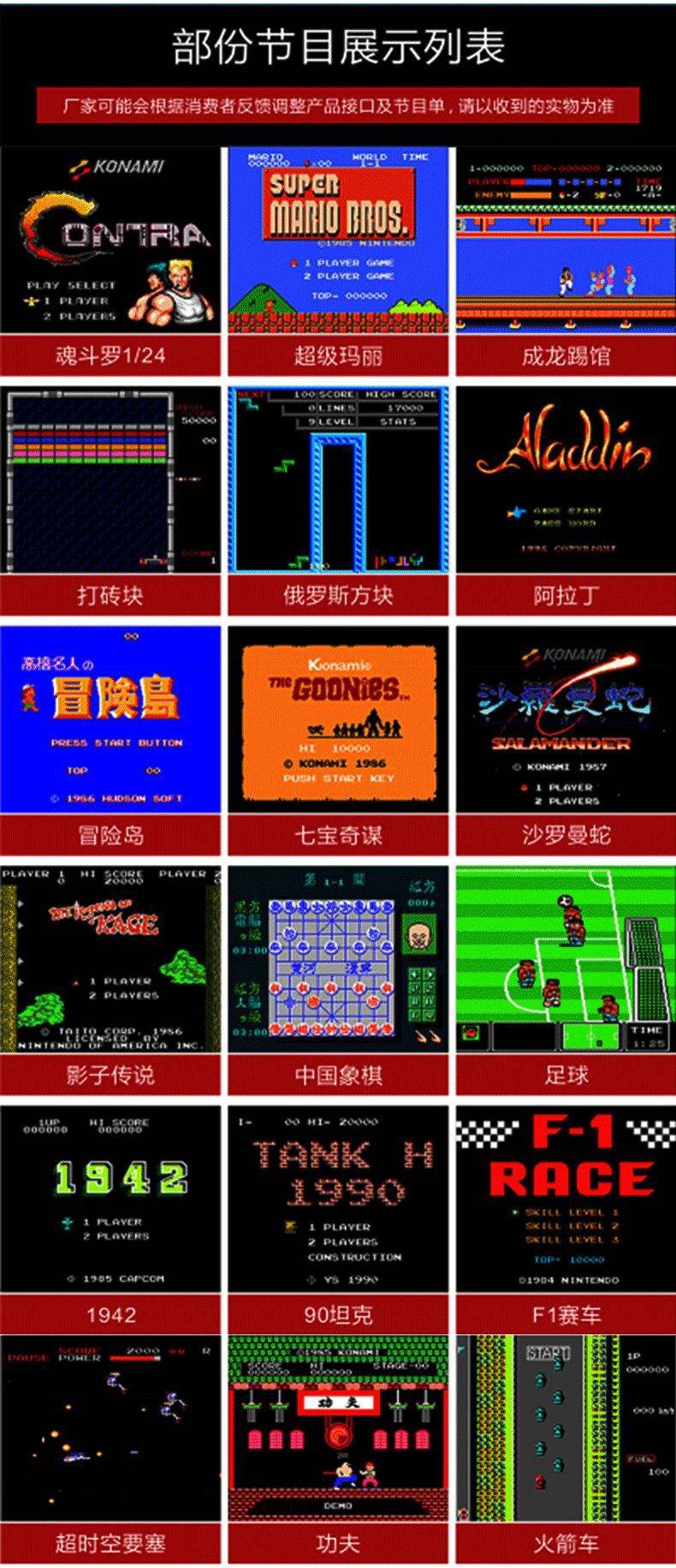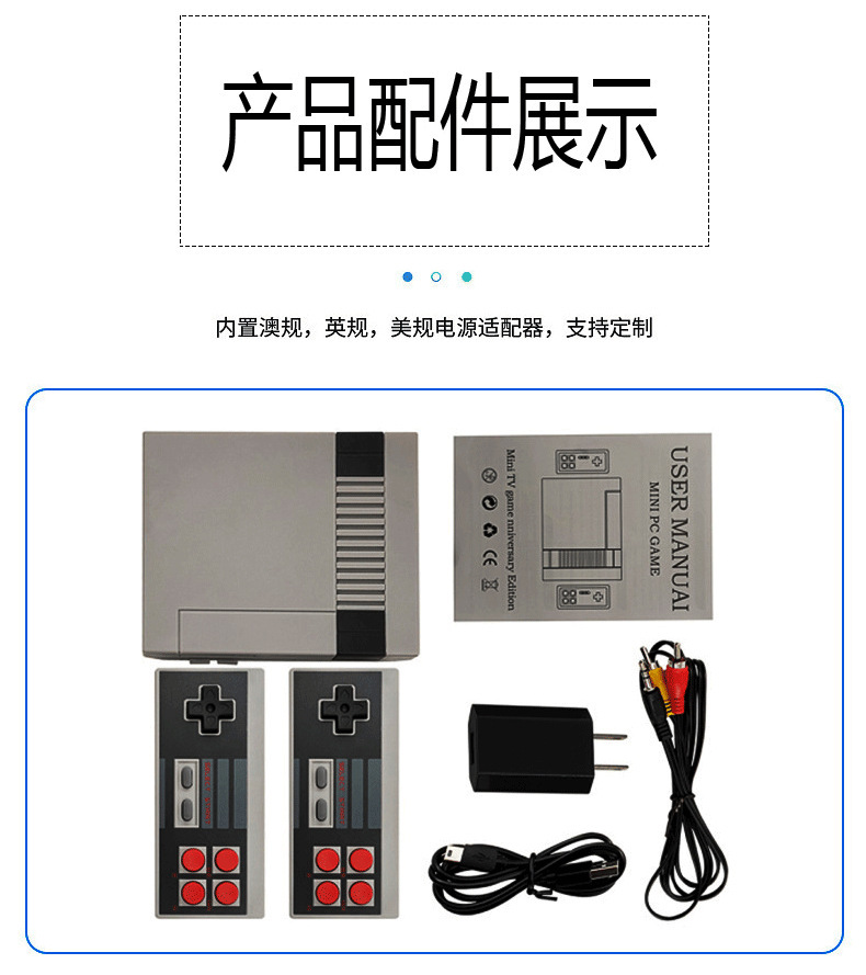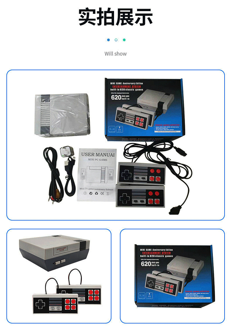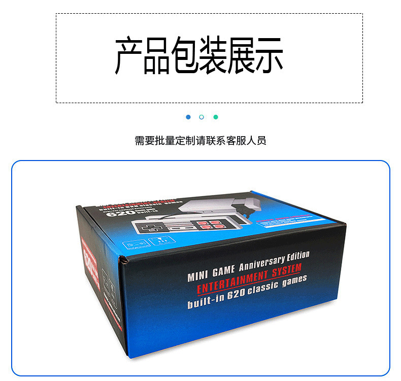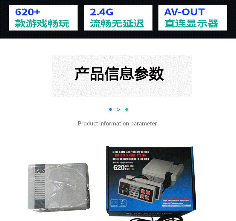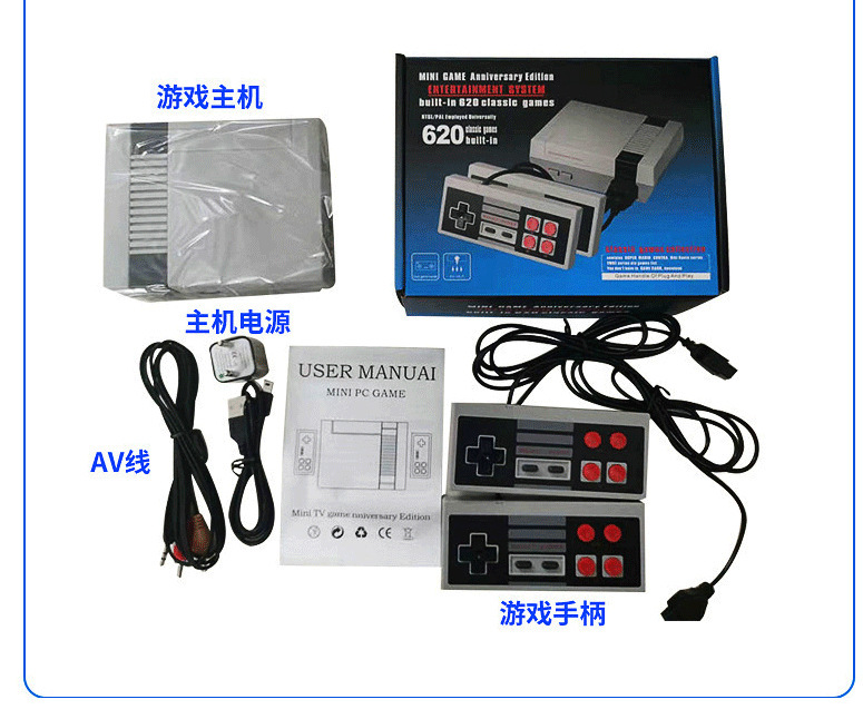 (8位游戏机,内置620个经典游戏。AV线0.8米,不支持插卡)