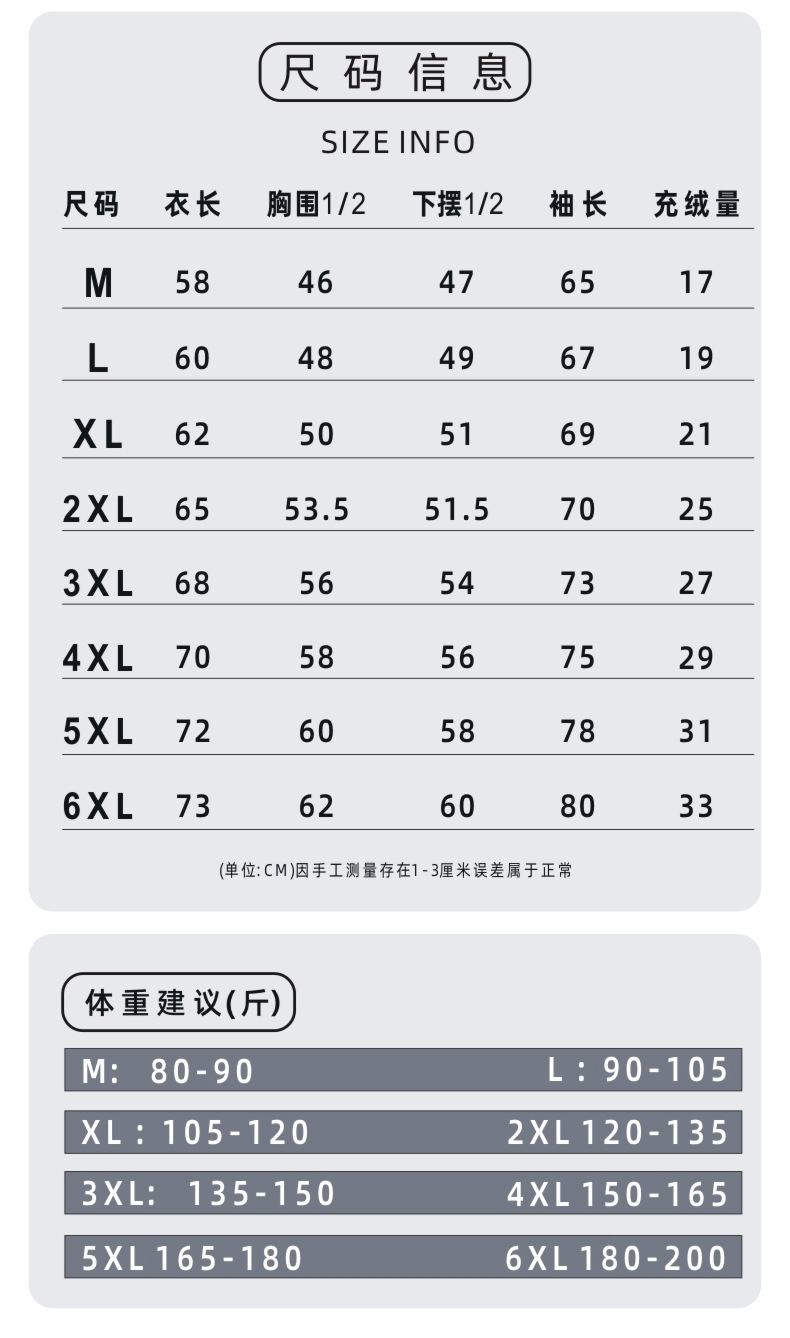 М( 40-45kg ); Л( 45-52.5kg ); XL( 52.5-60kg ); XXL( 60-67.5kg ); XXXL( 67.5-75kg ); XXXXL( 75-82.5kg ); 5XL( 82.5-90kg ); 6XL( 90-100kg )