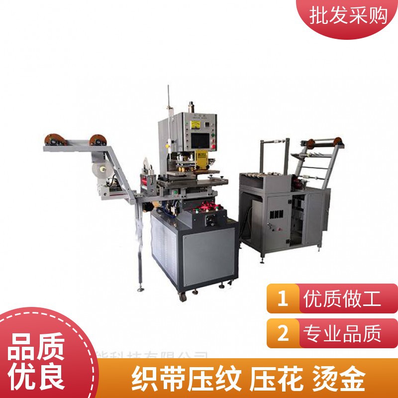 全自动织带压字机,也叫全自动压纹机主要用于尼龙带、PP带、包边带、箱包带、安全带、织带、内衣肩带、弹力带、服装商标等产品表面LOGO压痕加工,同时此机还具备烫金的功能。带有自动进带系统和收带系统,独立稳定的张力控制系统,可实现弹力织带、无弹力织带的自动张力调节,针对不同材质的带子,此机具有热压和高频自动切换功能,保证产品不会损坏,确保达到洗水不反弹的效果。