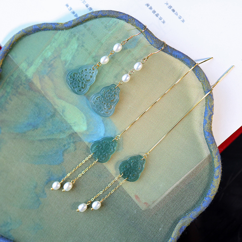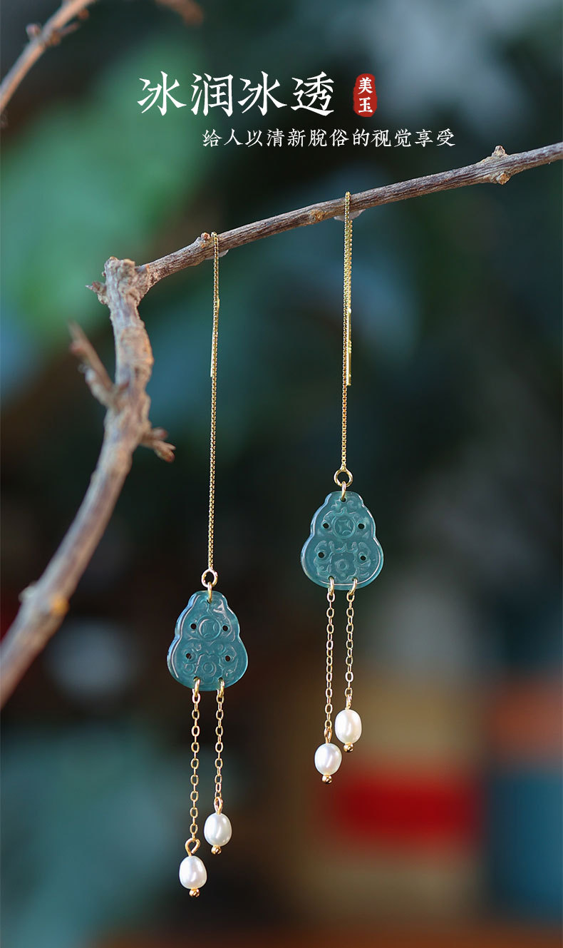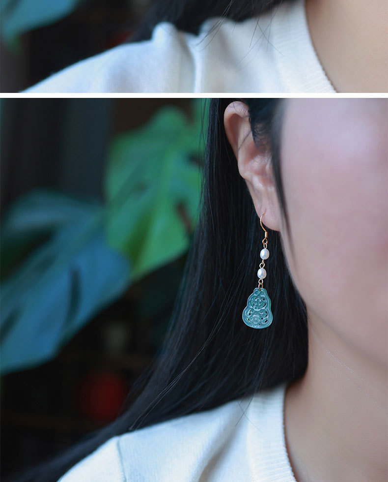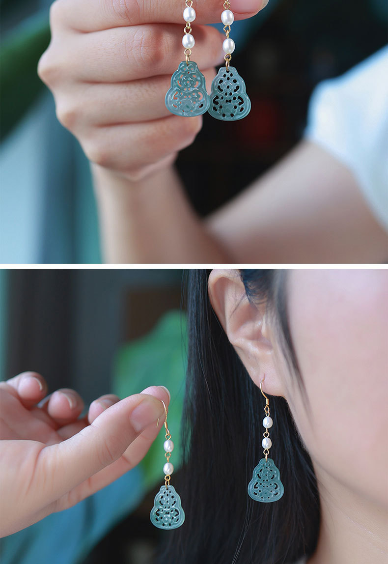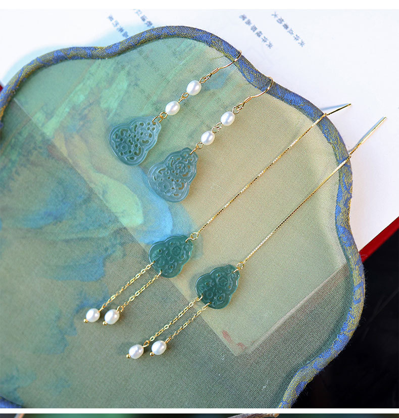 Полый нефрит из ледяного нефрита + жемчуг [полное тело, серебро 925 пробы, позолоченная проволока для ушей]; 2 полые серьги из ледяного нефрита + жемчуга [позолоченные серьги из серебра 925 пробы]