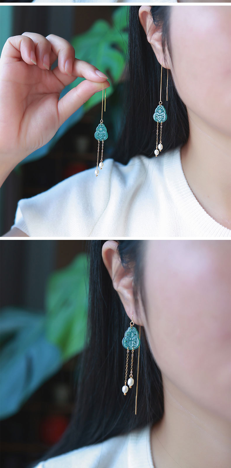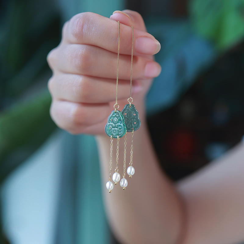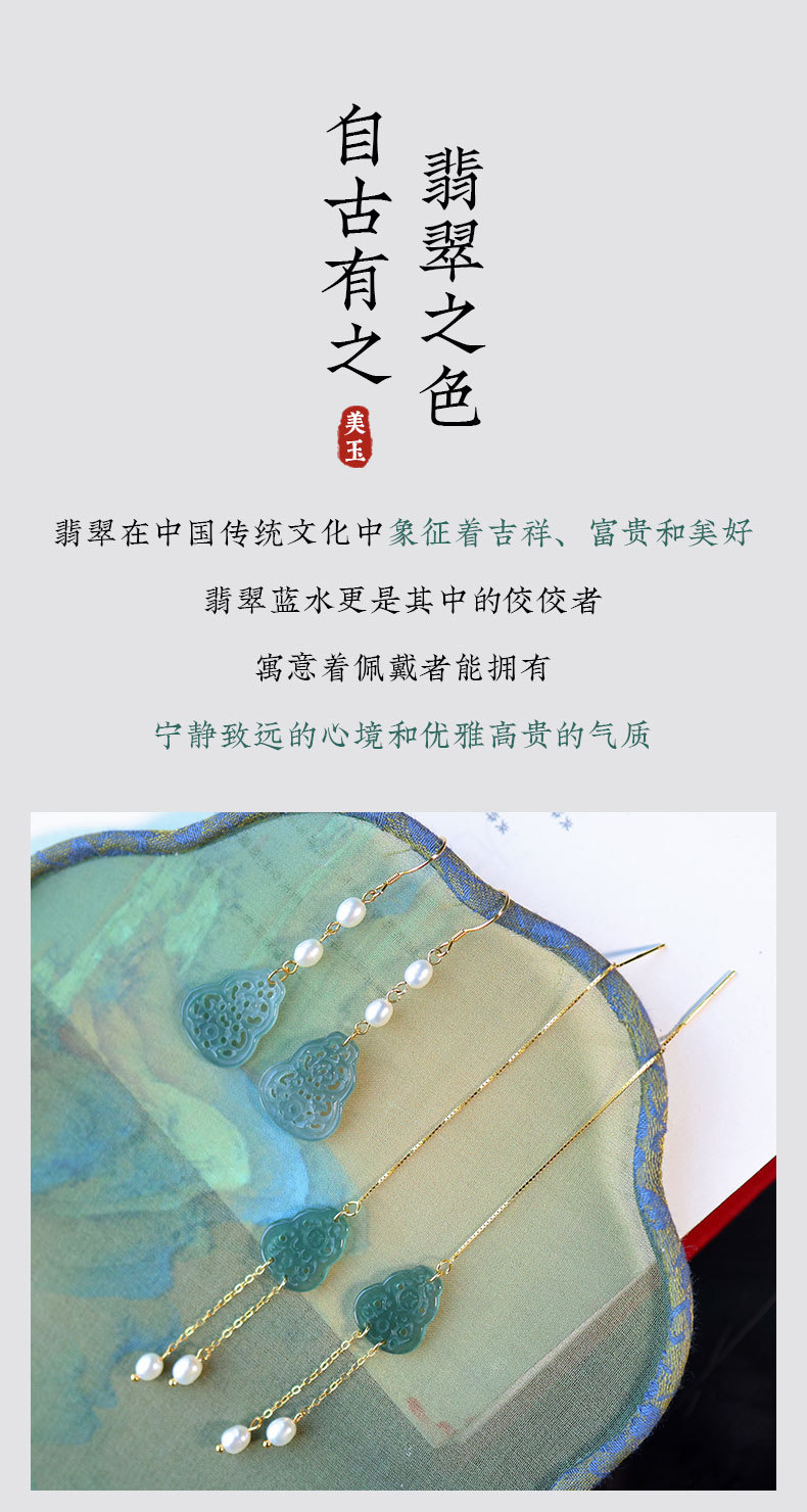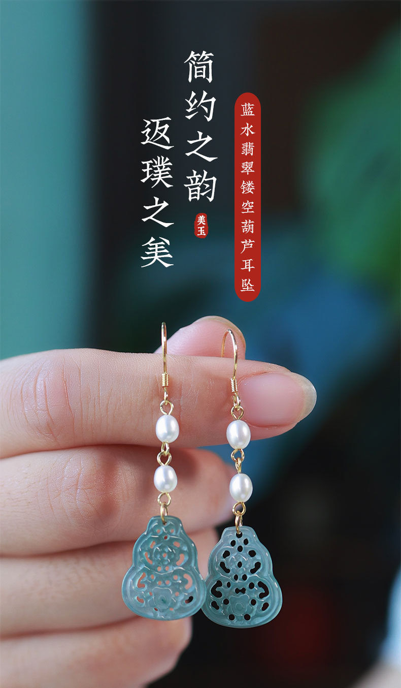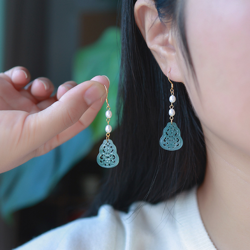 Полый нефрит из ледяного нефрита + жемчуг [полное тело, серебро 925 пробы, позолоченная проволока для ушей]; 2 полые серьги из ледяного нефрита + жемчуга [позолоченные серьги из серебра 925 пробы]