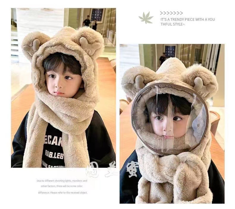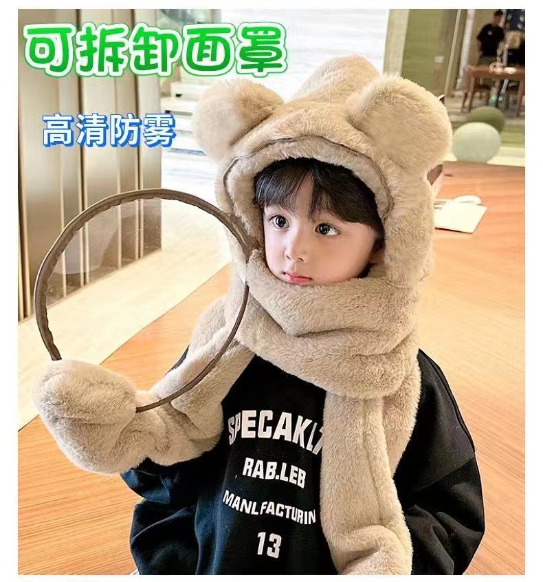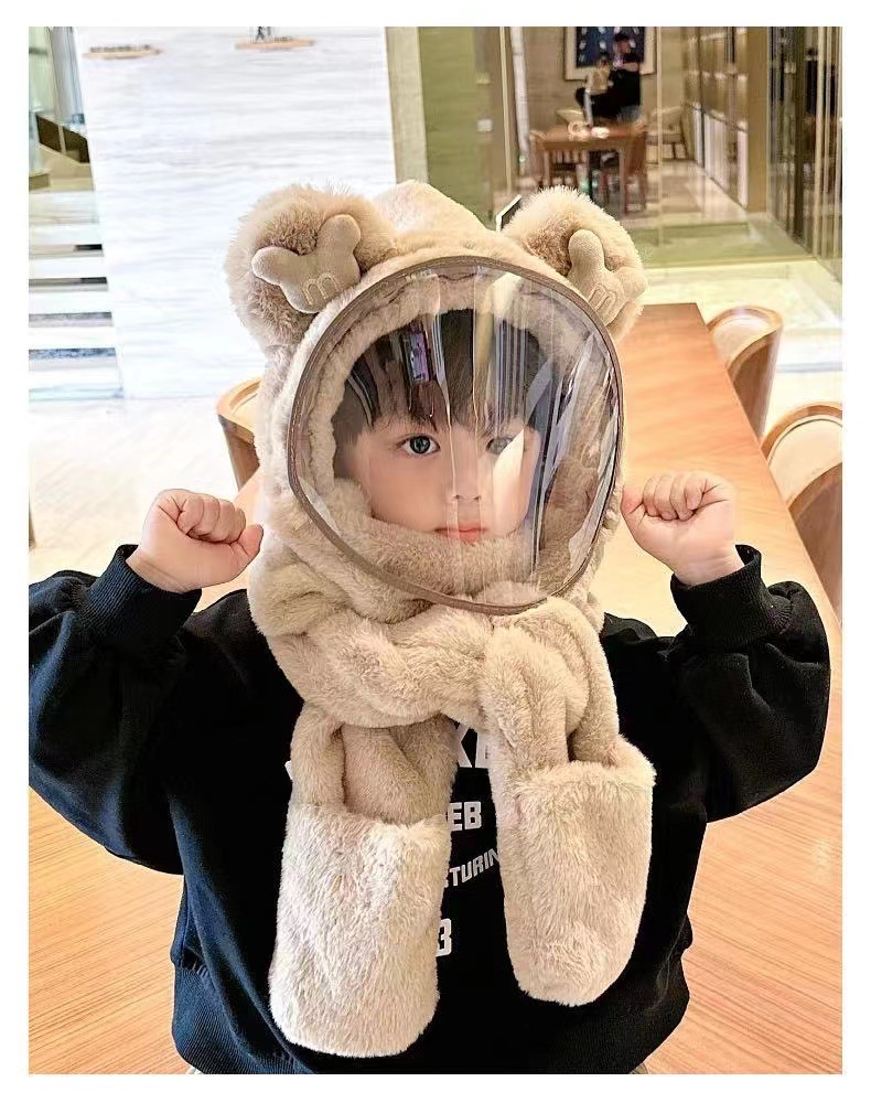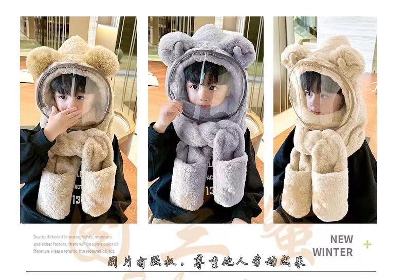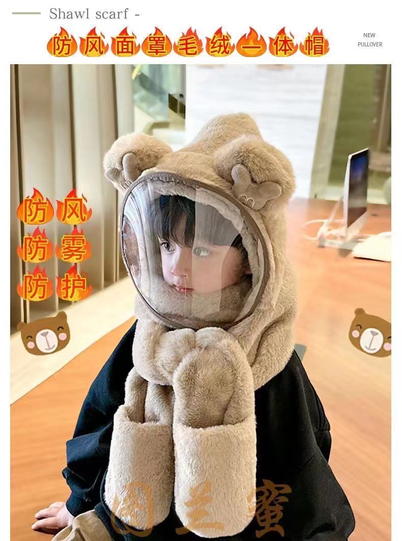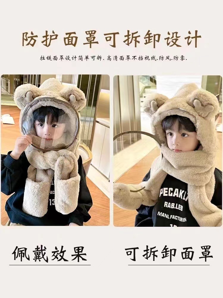 Детская шляпа Зимняя езда Тепловая плюшевая шляпа для мужчин и женщин Детская защитная маска для лица Детский шарф перчатки в одном шапке Ветрозащитный