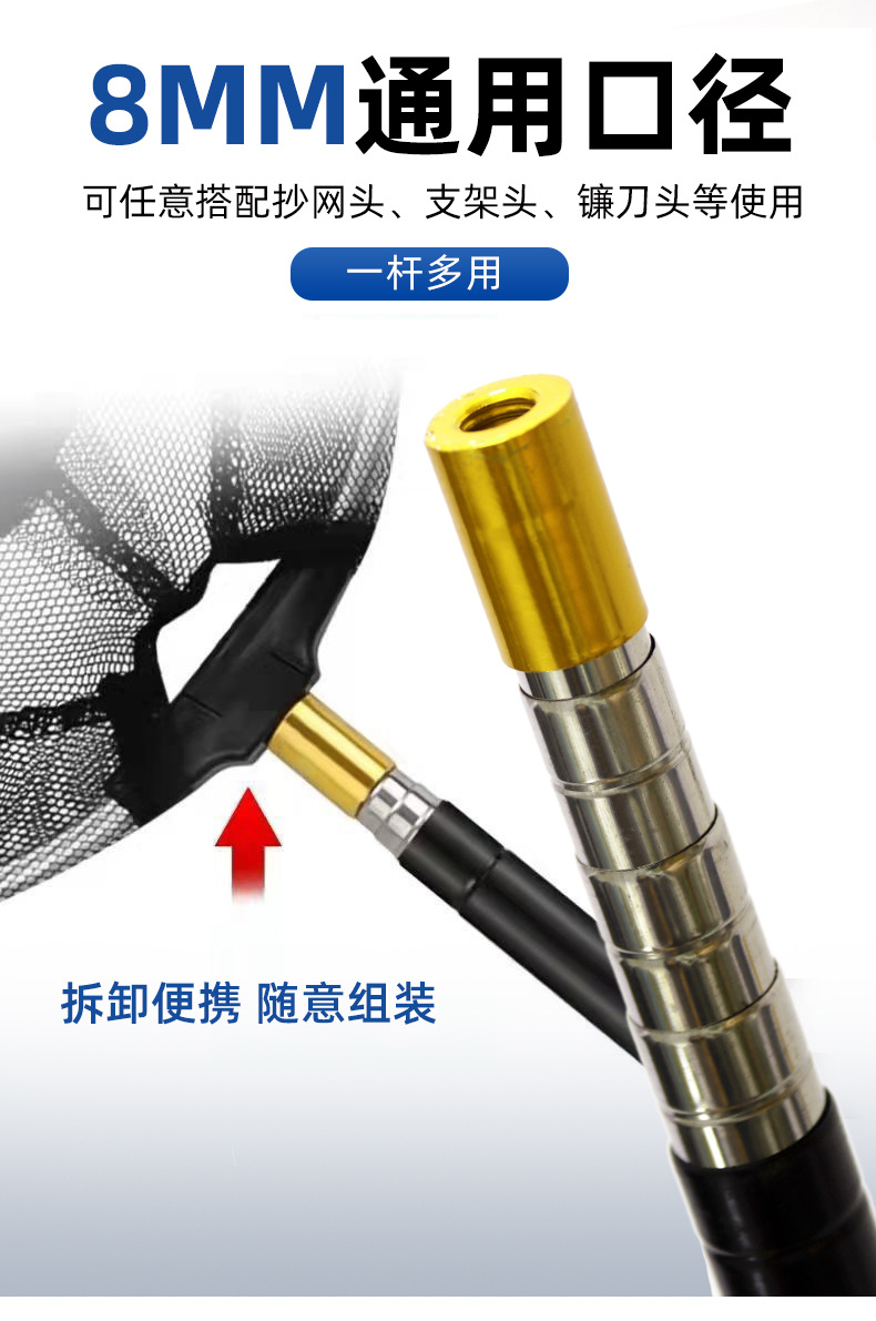 链接为迷你款抄网杆,共有长短两个规格,短款拉开后约68厘米,收缩后约25厘米,约100克,长款拉开后约150厘米,收缩后约41厘米,约150克,均为五节不锈钢设计,橡胶握把,适配于八毫米接口,如打窝勺头,抄网头,镰刀头等,可按需下单,谢谢!
