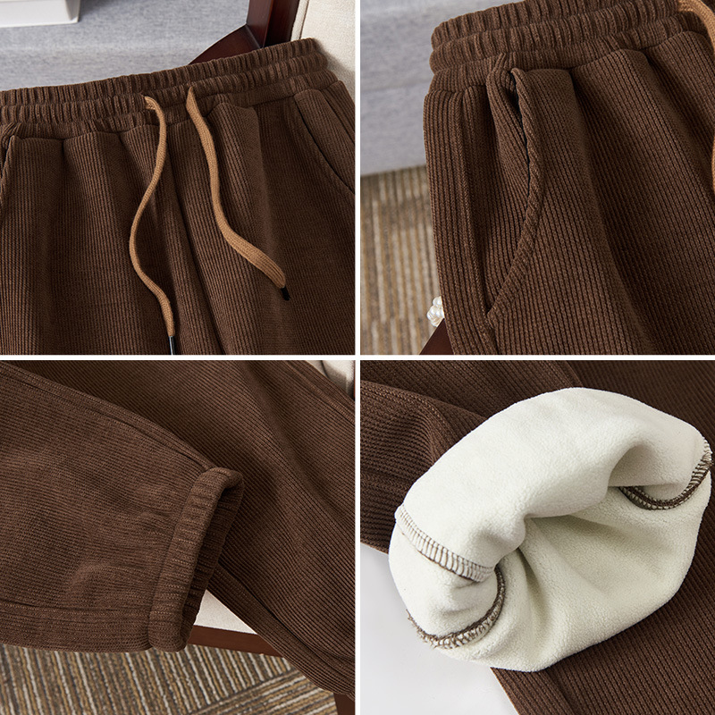 欧棉绒面料复合奥利绒,比较厚实,裤子有弹力,给大家跑量的,性价比很高的一款裤子哦