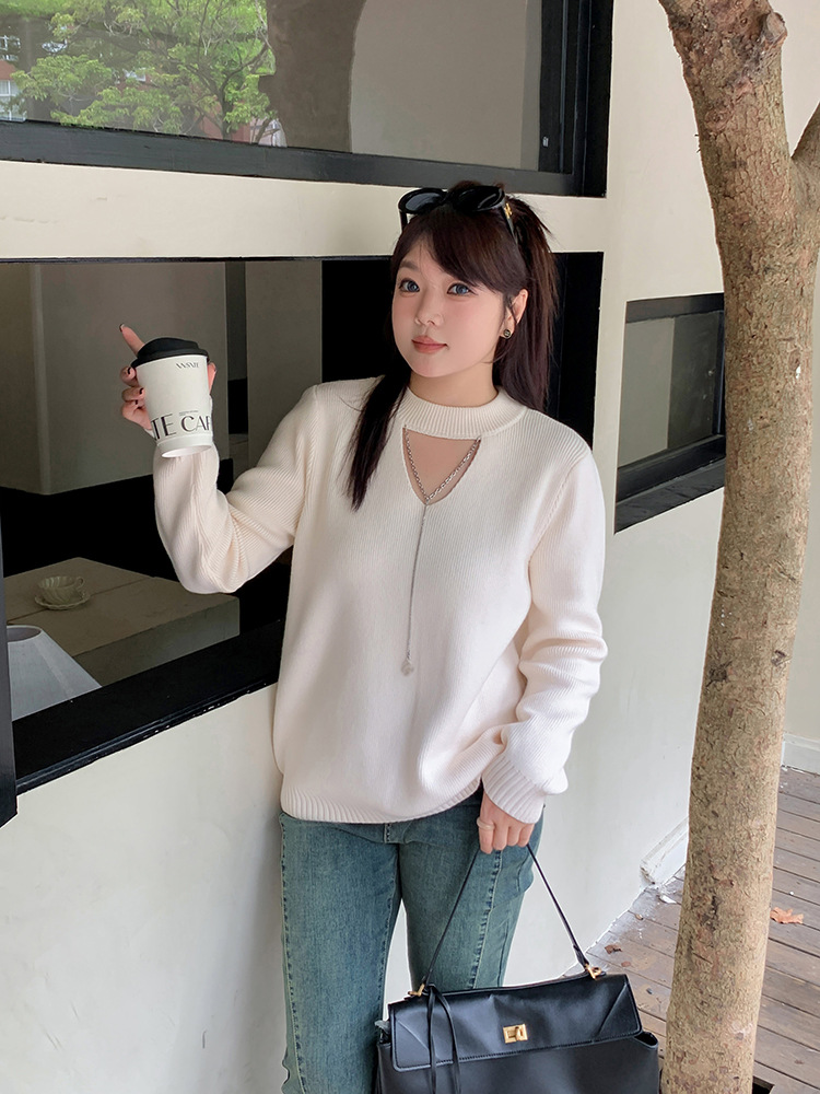 Новинка осенне-зимней коллекции 2025: Женский свитер больших размеров Shuangtian F239 для полных женщин, с вырезом и цепочкой на шее