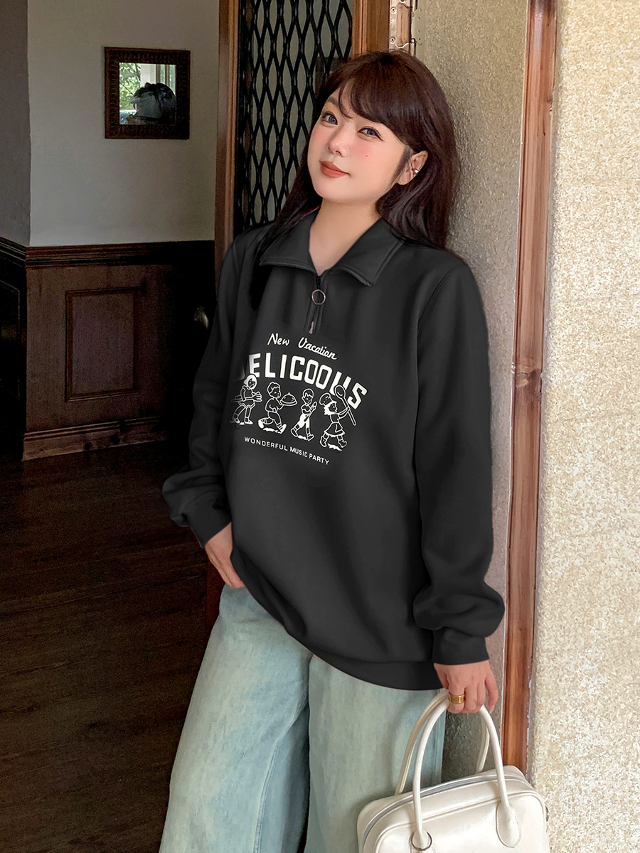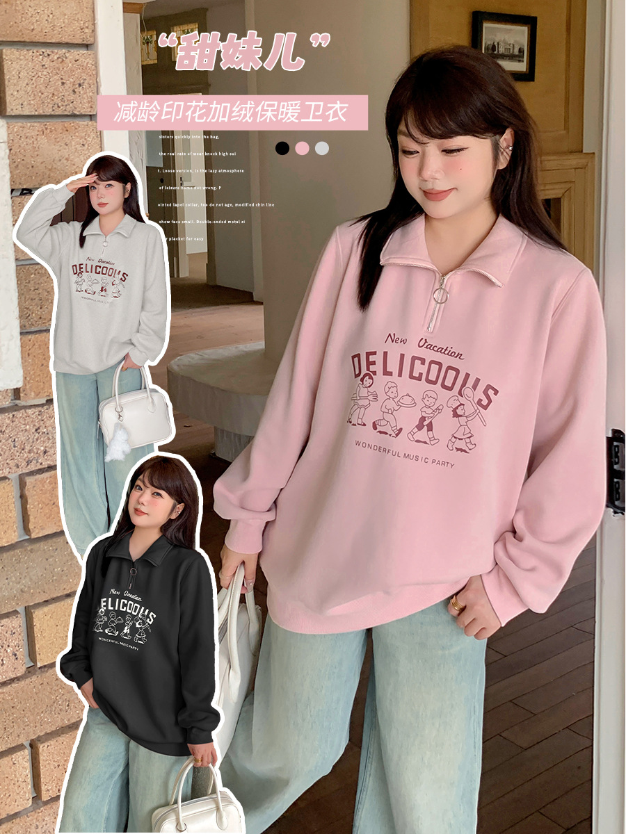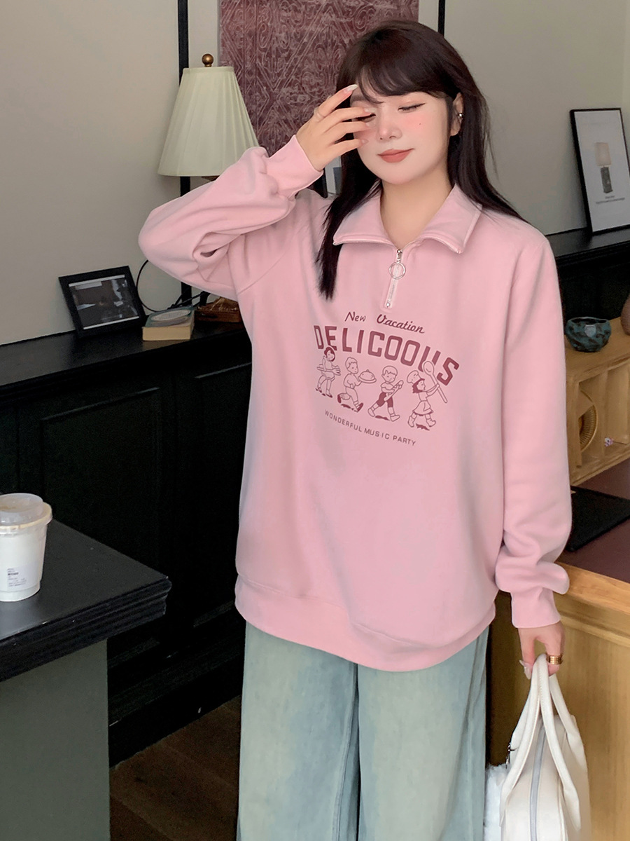 Yino Плюс размер женская полузастежка-молния на плече отворот повседневного свободного тонкого принта с пушистым рукавием 341860