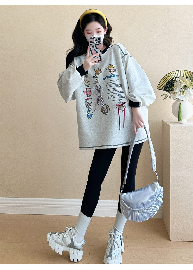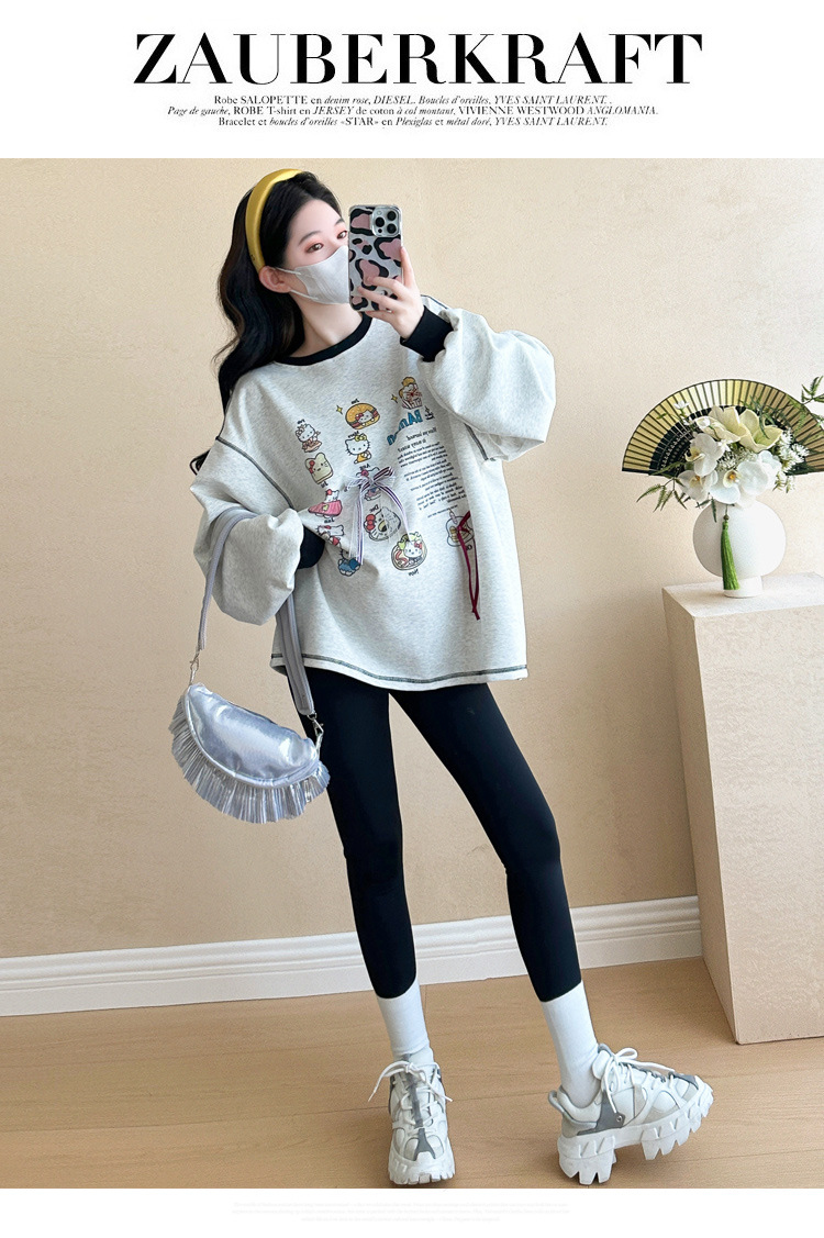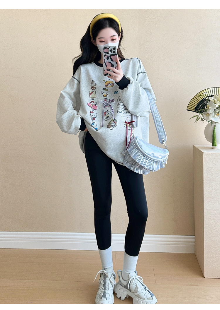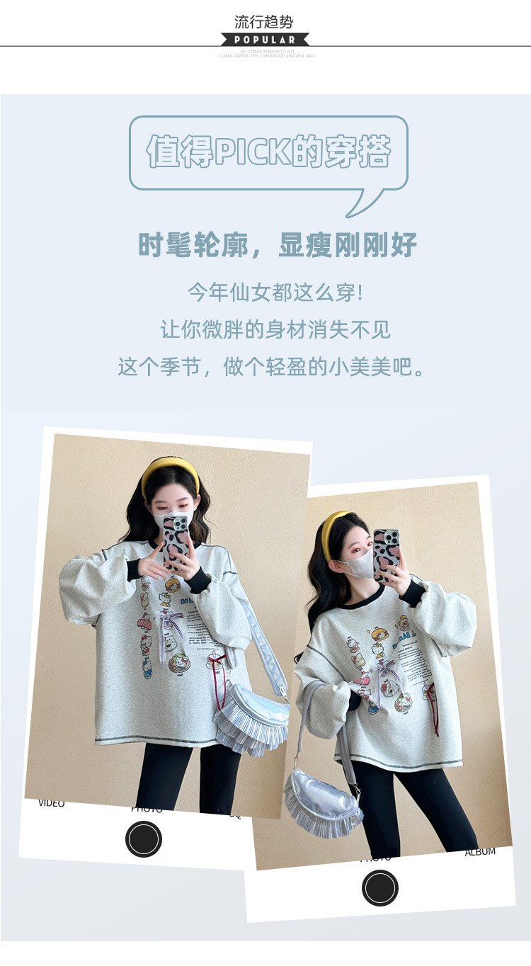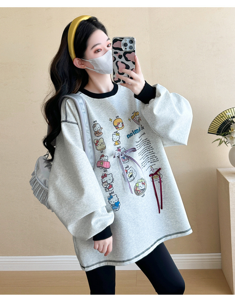 Свитера для беременных 2024 осень-зима новая корейская версия мультфильма минус возраст принт свободный большой размер плюс длинный бархатный топ