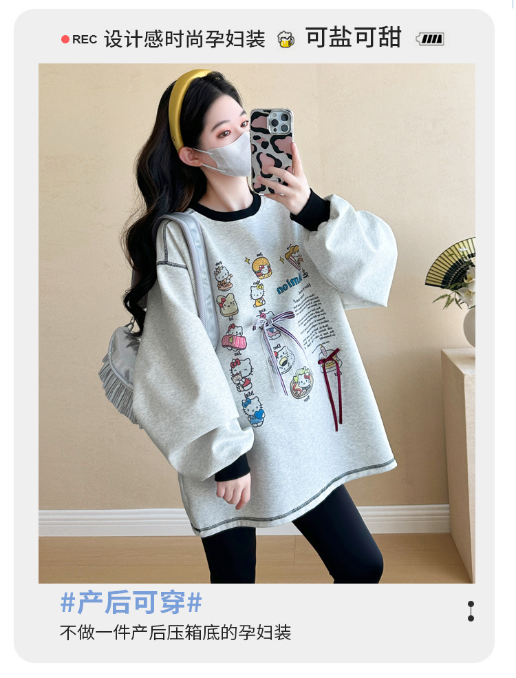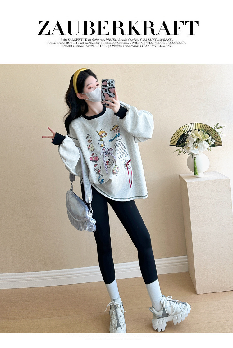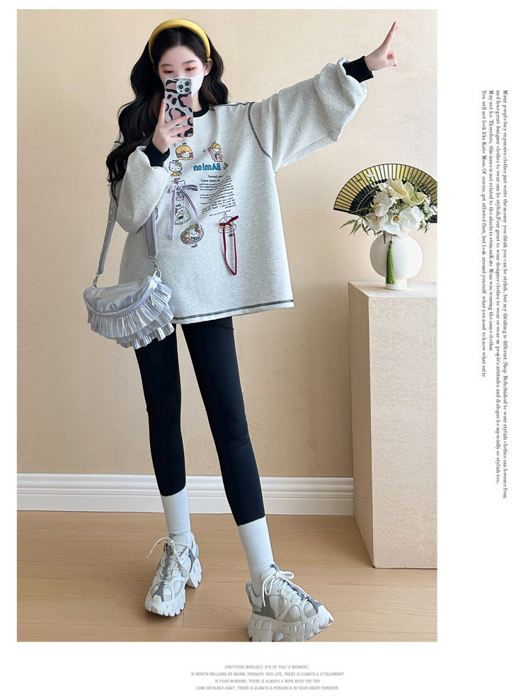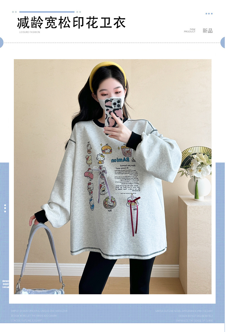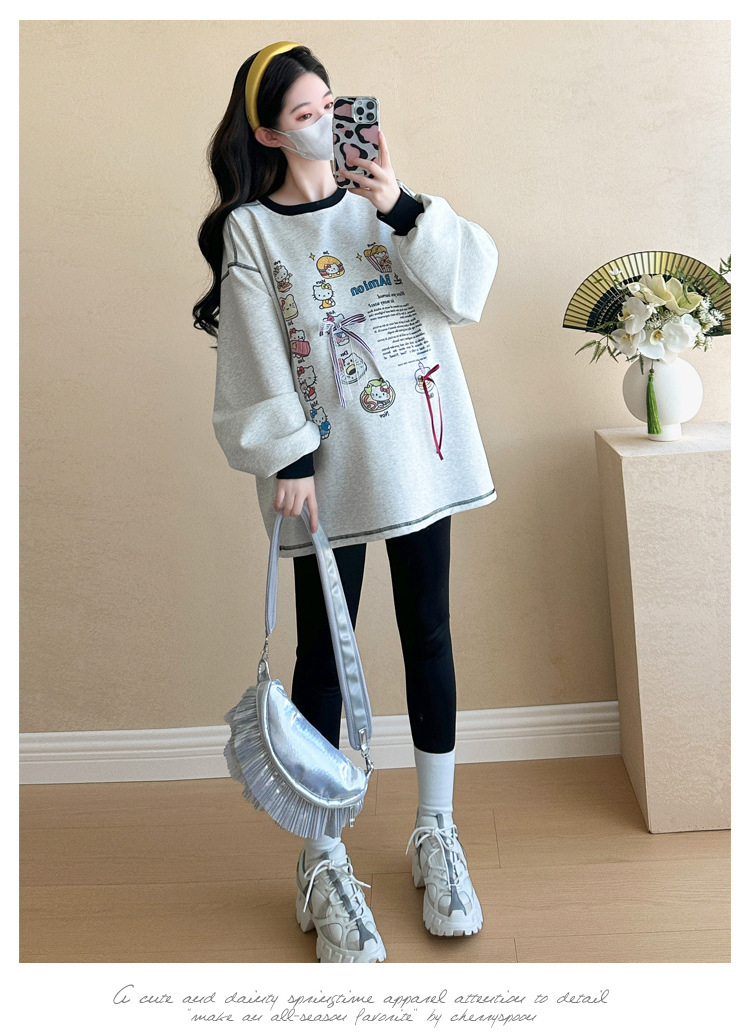 Свитера для беременных 2024 осень-зима новая корейская версия мультфильма минус возраст принт свободный большой размер плюс длинный бархатный топ