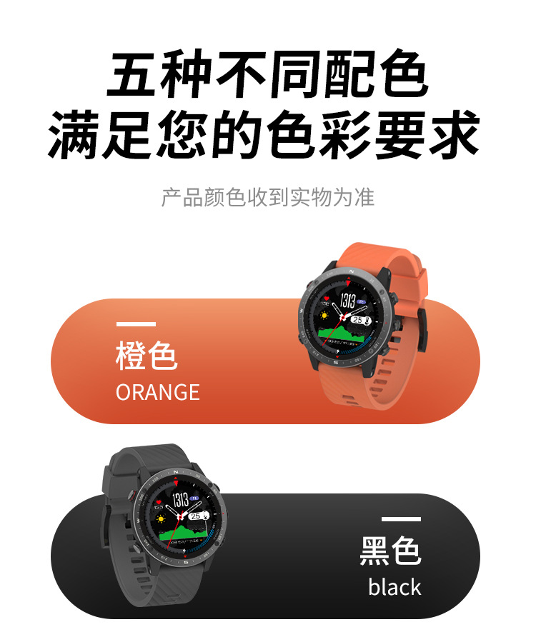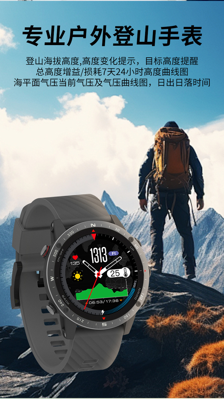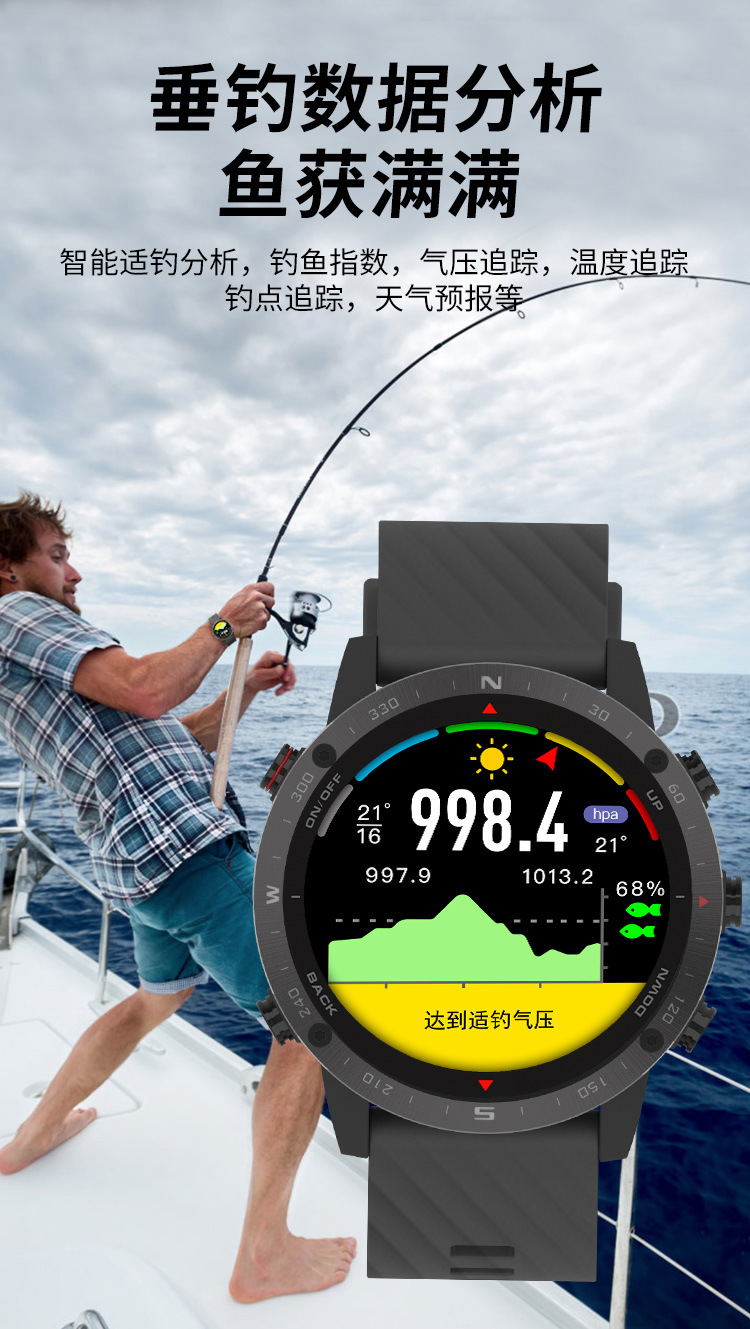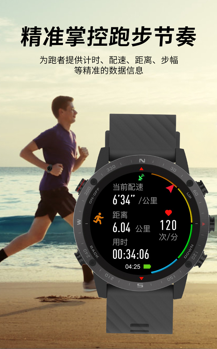 3. 专业运动数据分析:跑步、自行车、登山、铁人三项,浮潜、游泳、钓鱼、指南针、天气预报、动态心率、血氧,海拔高度,气压,最佳个人记录、历史数据存储等。