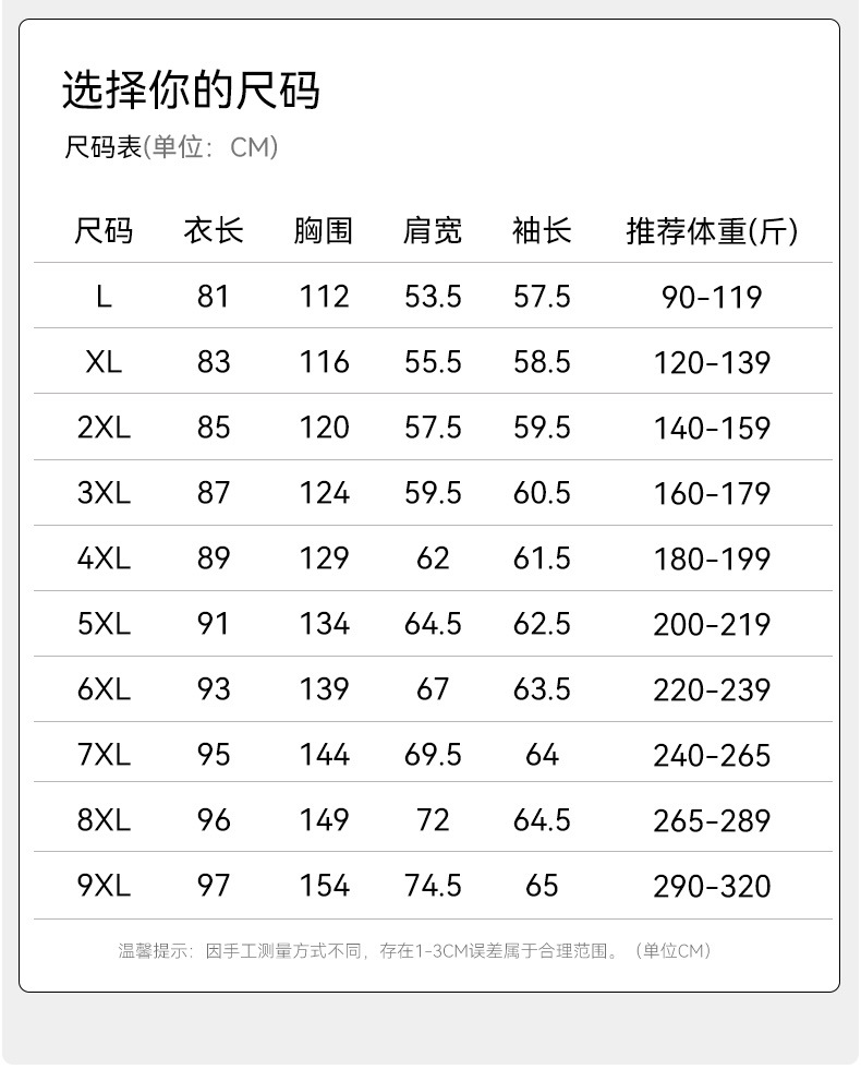 L; XL; 2XL; 3XL; 4XL; 5XL; 6XL; 7XL; 8XL; 9XL
