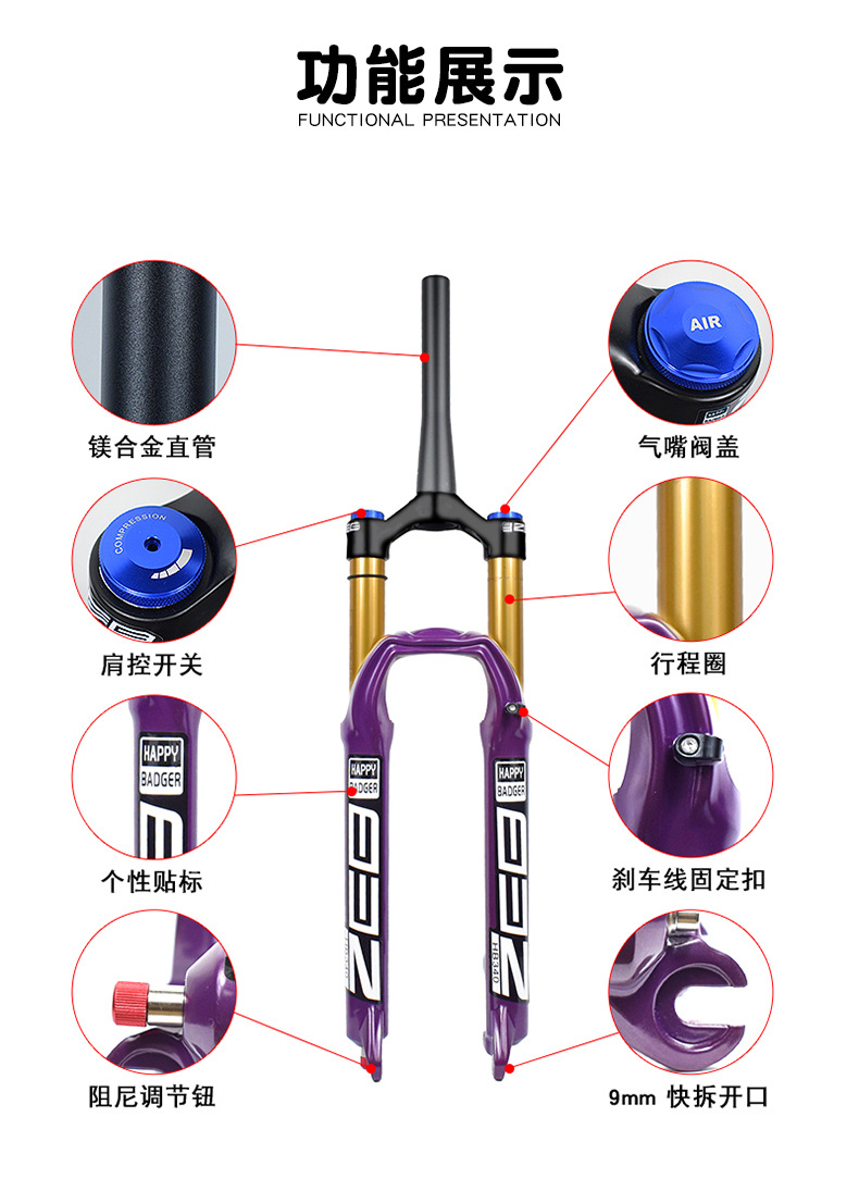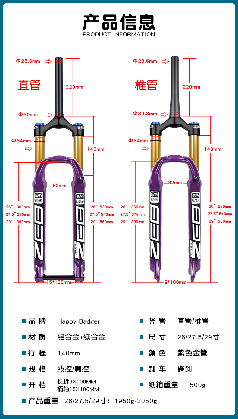 26inch Трубка из фиолетового золота, ход 140 мм, диаметр трубы 34; 27.5inch Трубка из фиолетового золота, ход 140 мм, диаметр трубы 34; 29inch Трубка из фиолетового золота, диаметр ходовой трубы 140 мм