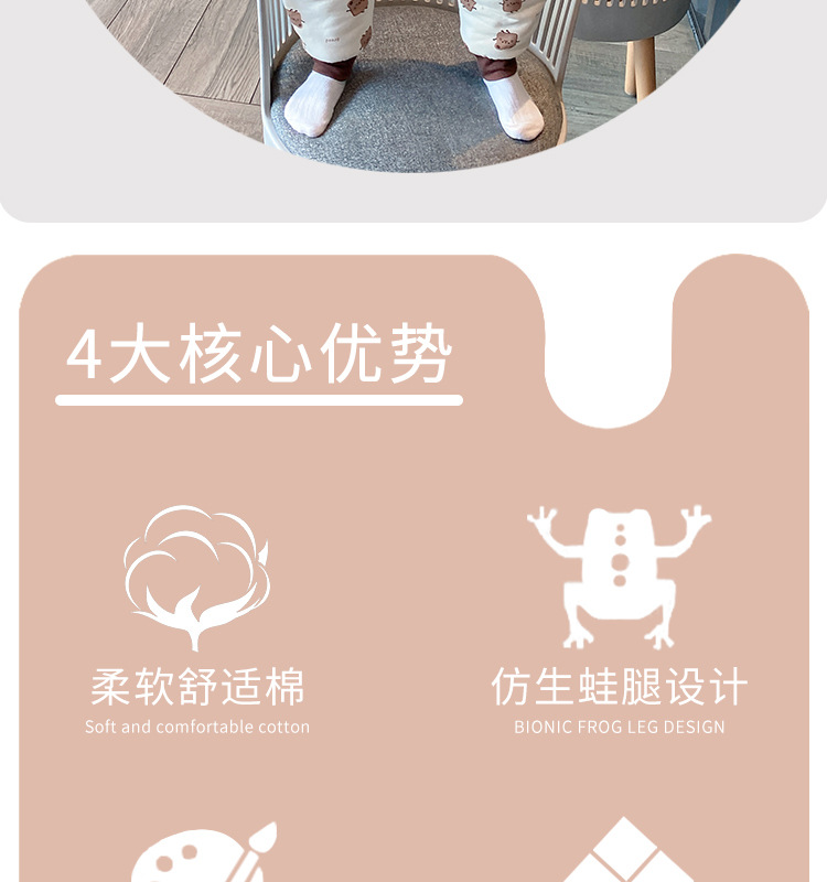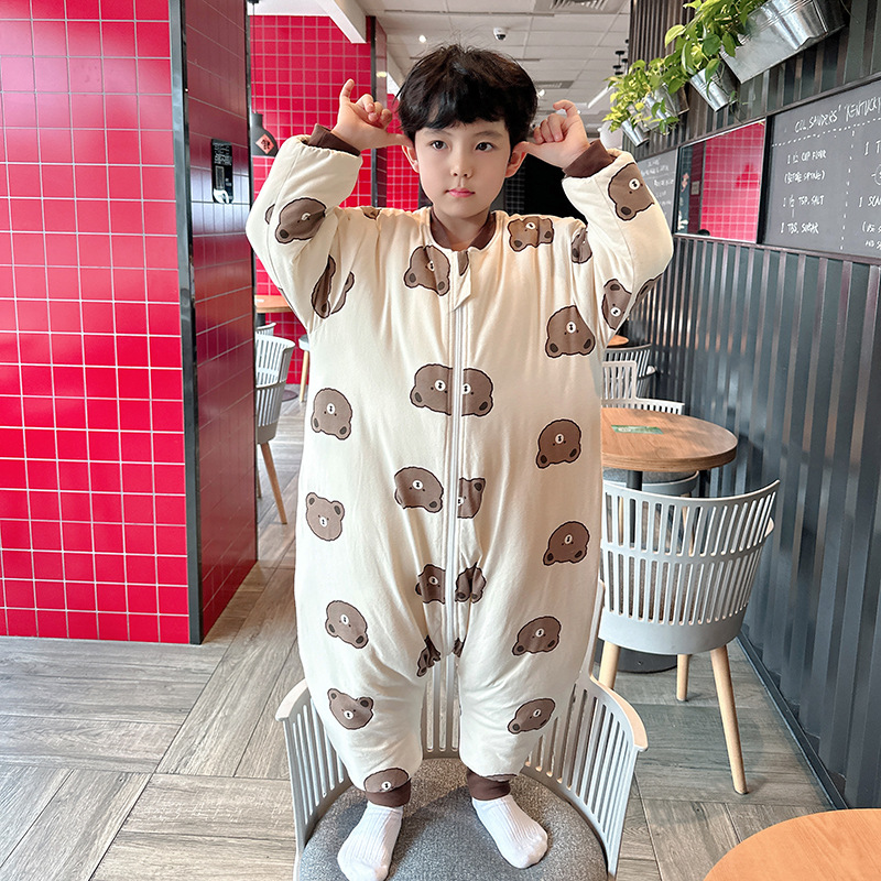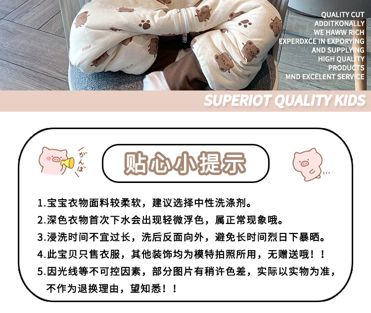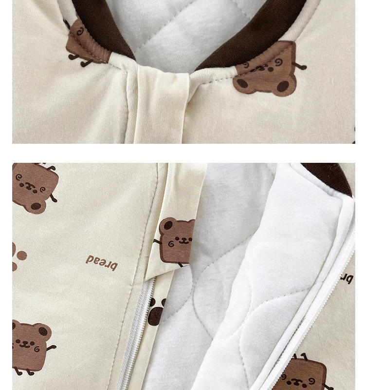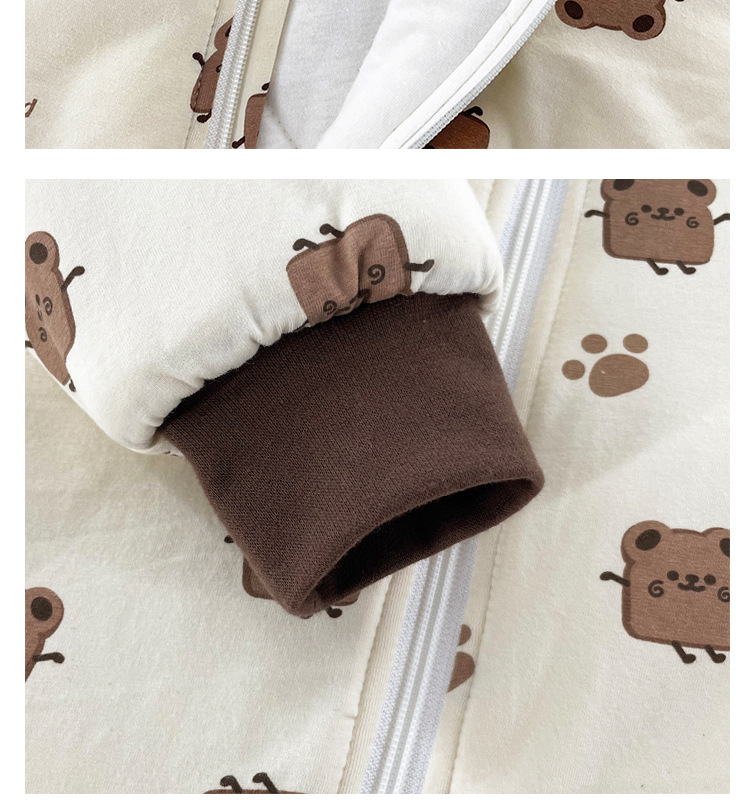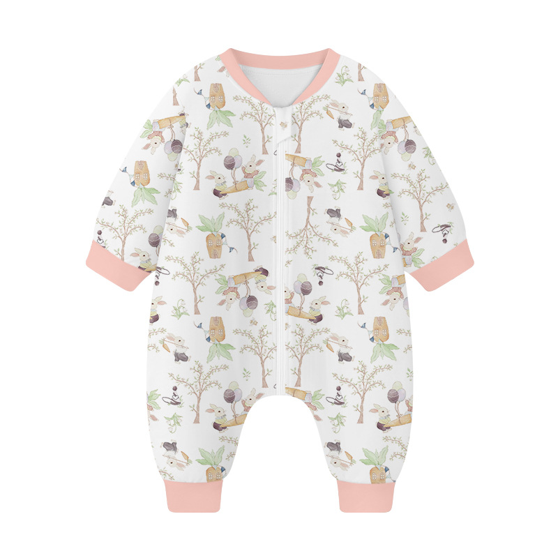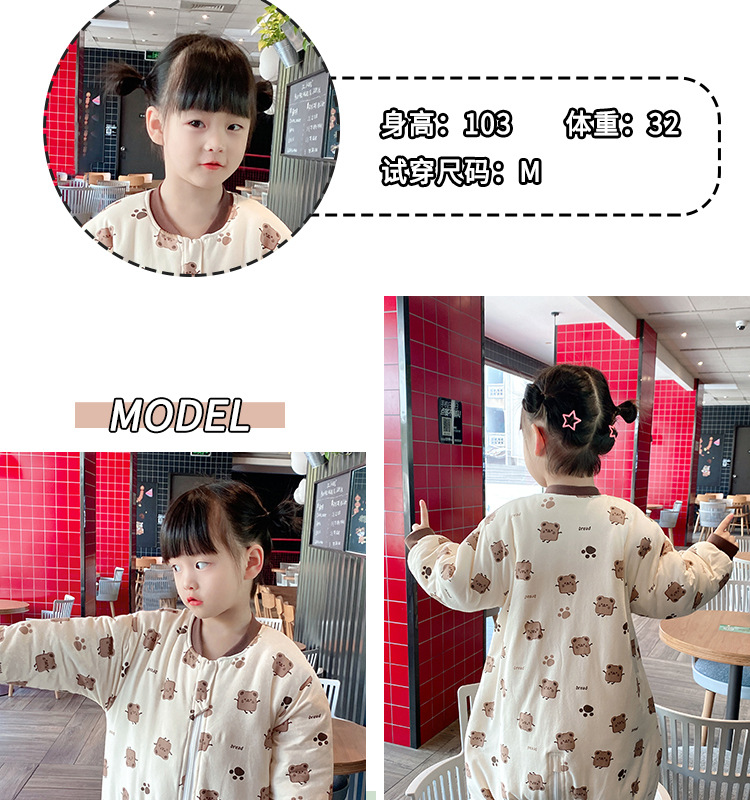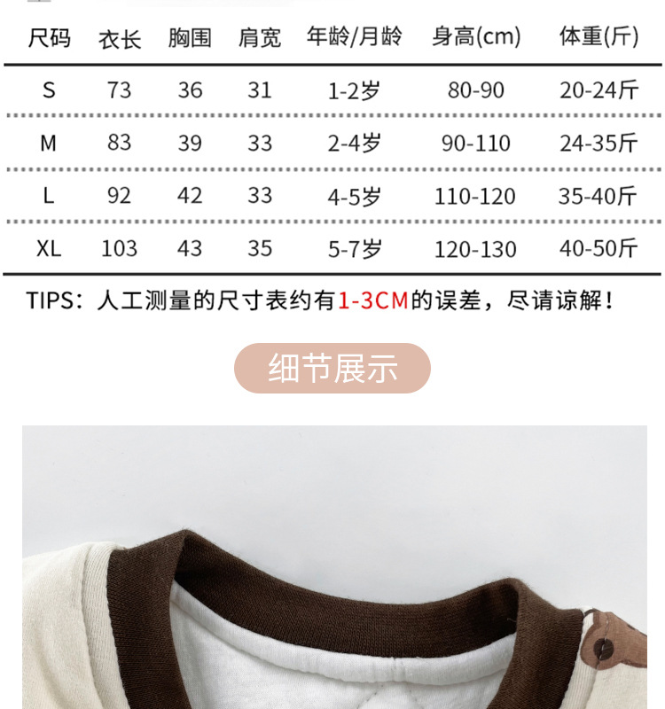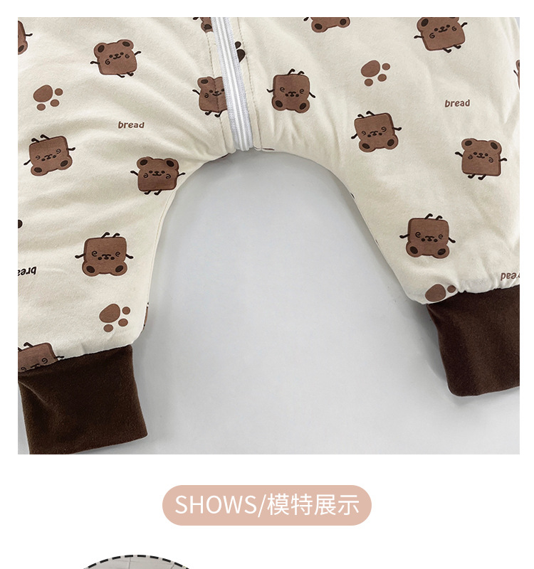 【尺码】:S-M-L-XL 【款式】:宽松&拉链型 【图案】:采用德国活性印染(7款) 亨利熊、玫瑰兔、机械车、小国宝、吐司熊、胖胖鹅、原始龙 【产品功能】:采用纯棉面料,细腻柔软; 拉链设计方便宝宝穿脱; 加大裆设计,宽松舒适 宝宝活动自如;