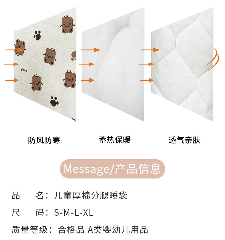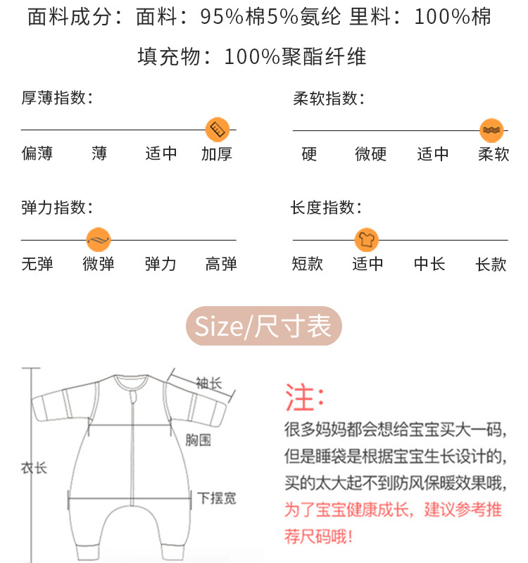 【品名】:220g棉分腿睡袋 【材质】: 面料:95%棉5%氨纶 里料:100%棉 填充物:100%聚酯纤维