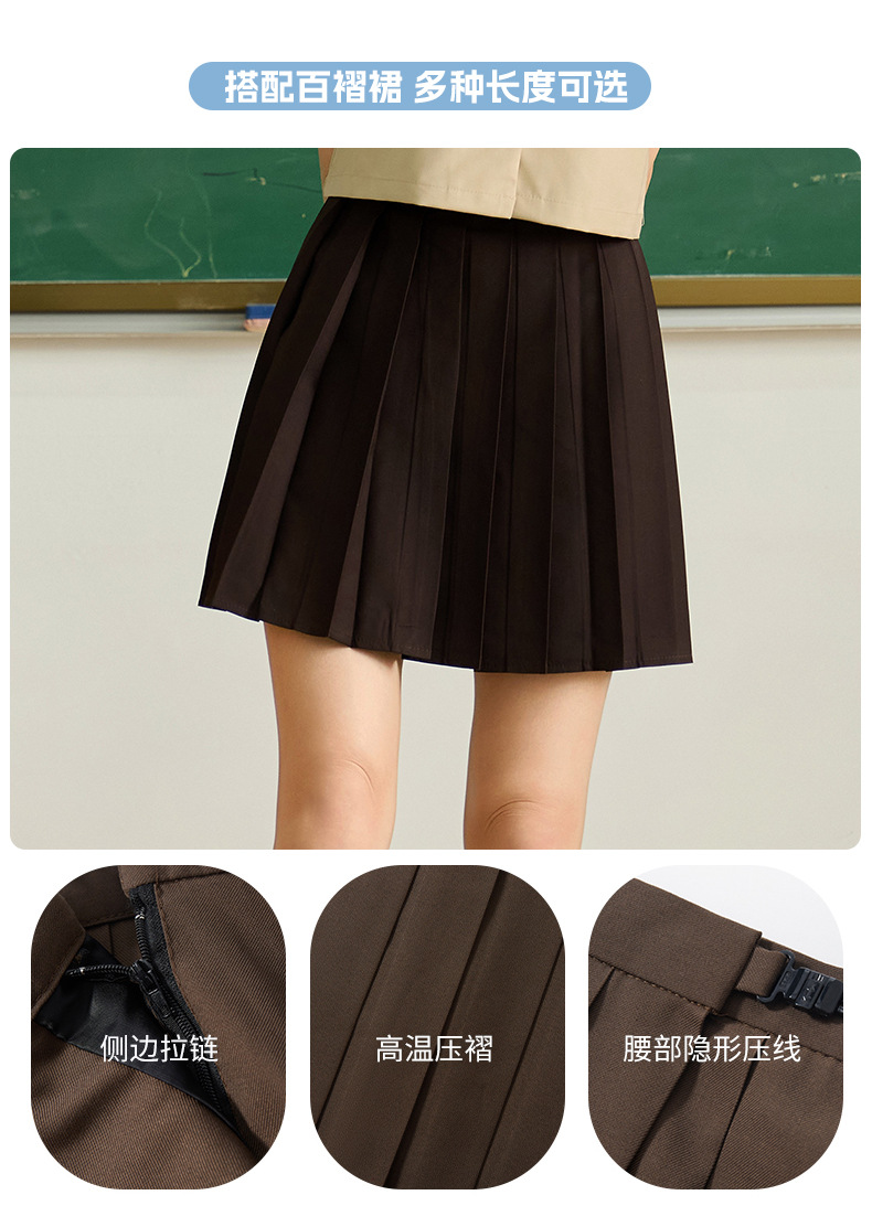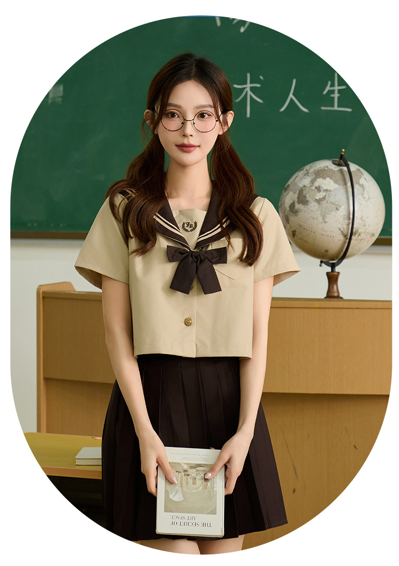 Топ с короткими рукавами (в комплекте кофейный галстук); Топ с длинными рукавами (в комплект входит кофейный галстук); Костюм с короткими рукавами (в комплекте с кофейной галстуком); Костюм с длинными рукавами (в комплекте с кофейной галстуком); Юбка 43см