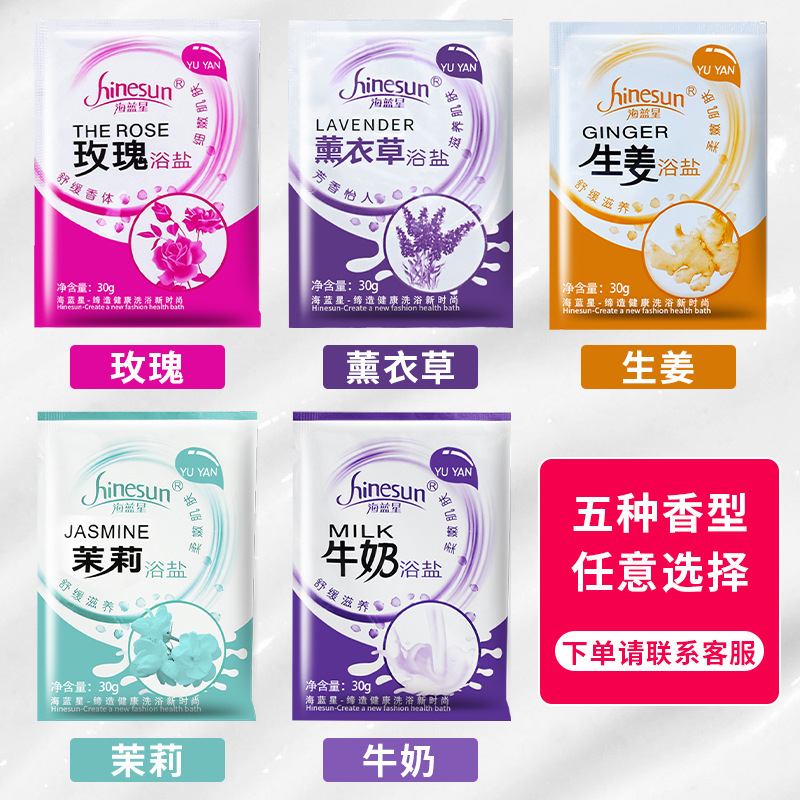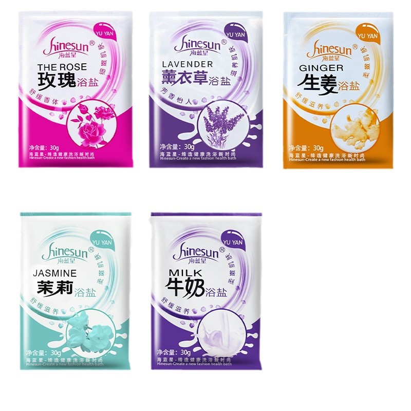 Соль для ванны с молочным ароматом [30г]; Соль для ванны с ароматизатором розы [30г]; Соль для ванны с лавандовым ароматом [30г]; Соль для ванны с ароматом имбиря [30 г]; Соль для ванны с ароматом жасмина [30 г]