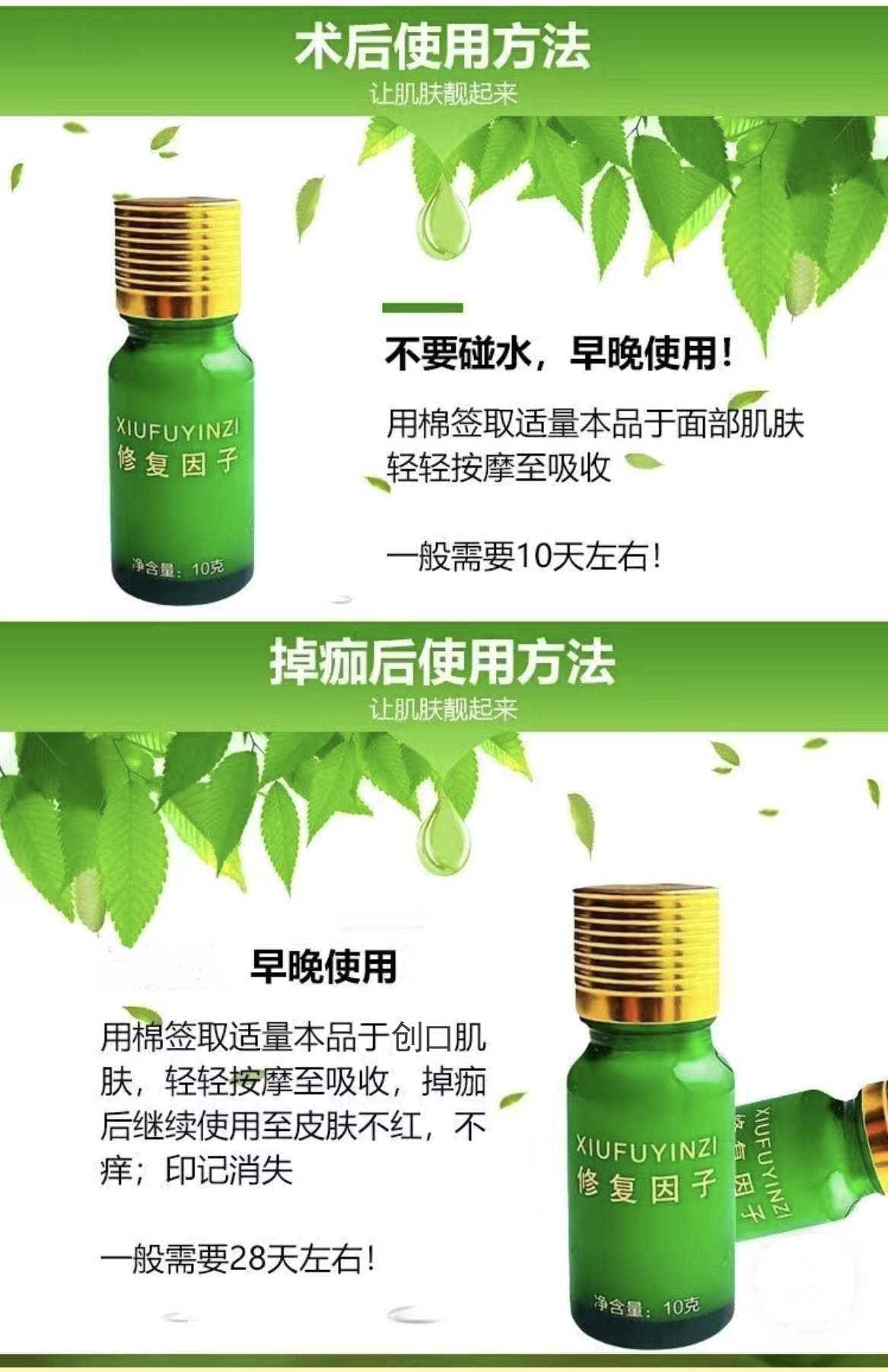 用法:结痂后或掉痂后使用,用棉签粘取少量涂上,每天2,3次即可。适合于美容行业点志,点斑,皮秒,激光,纹身纹绣等等术后修复,效果呱呱的。