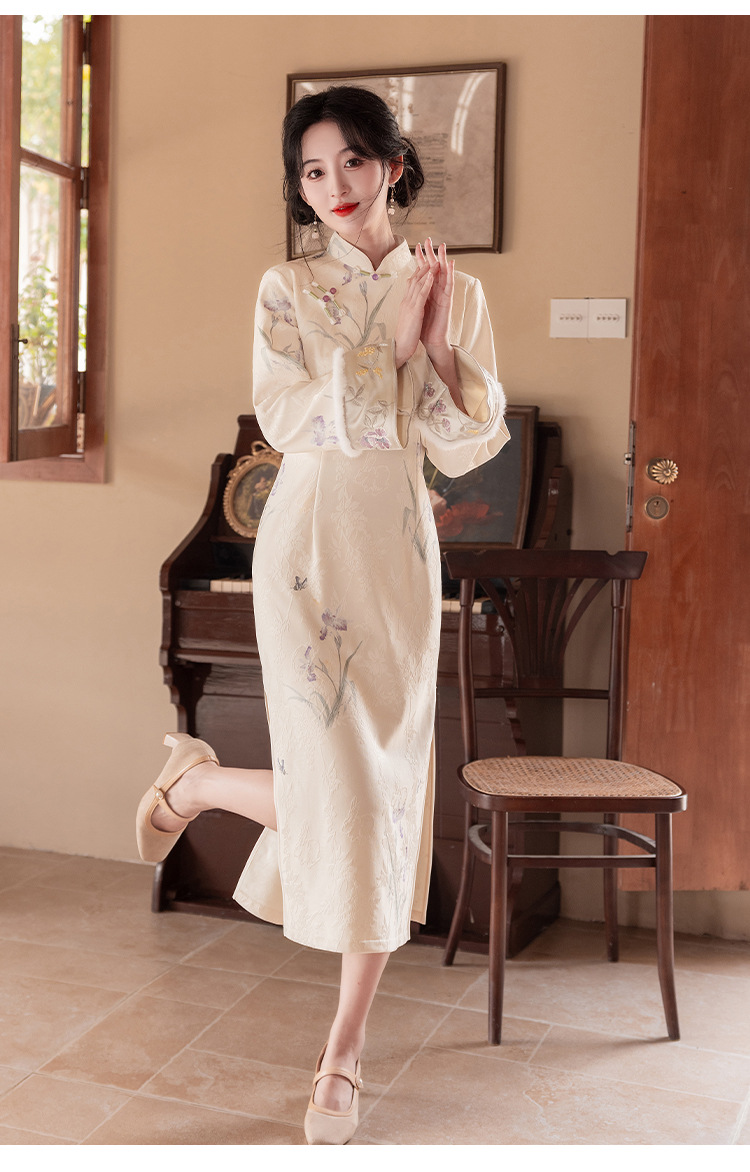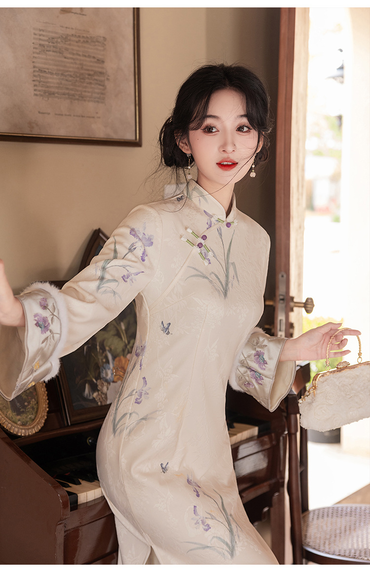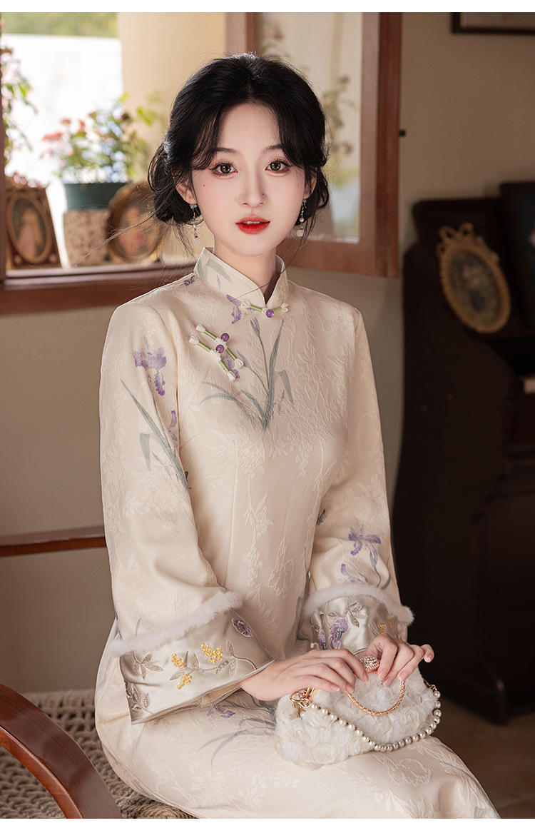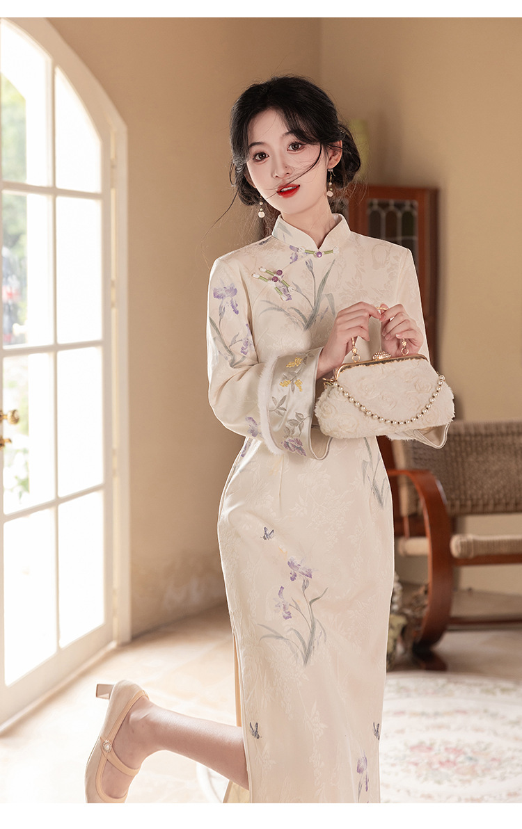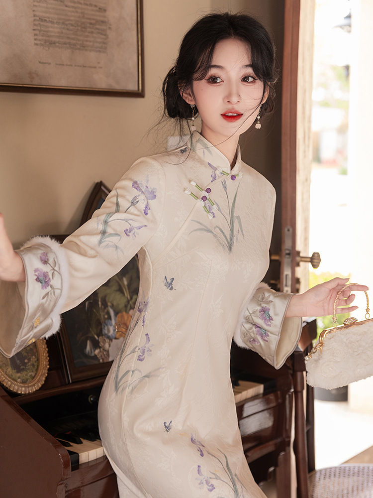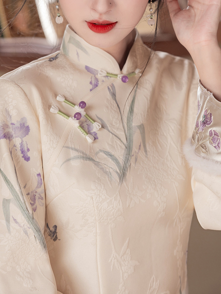 Сиреневый цветочный чонсам осень-зима 2024 новый высококачественный стройный, улучшенный темперамент Новый китайский повседневный