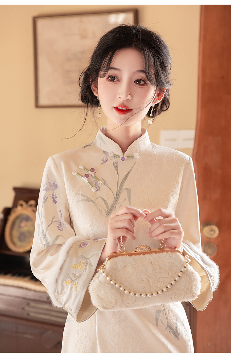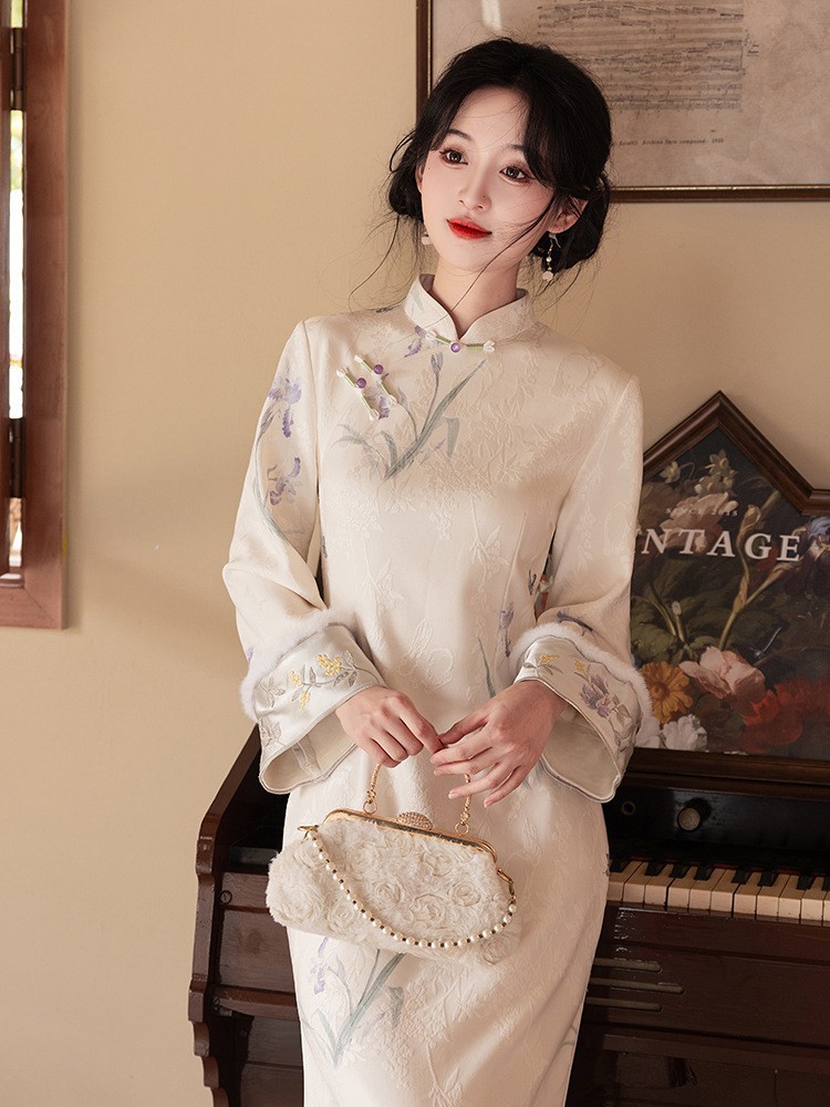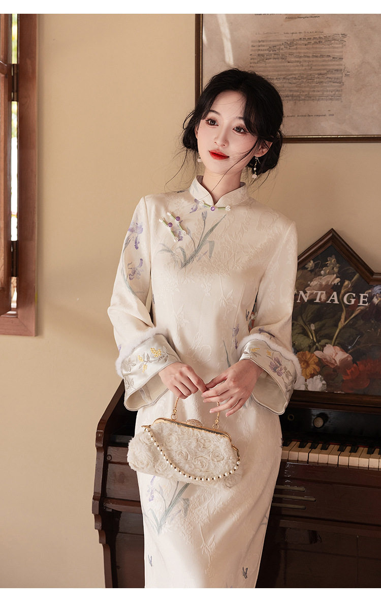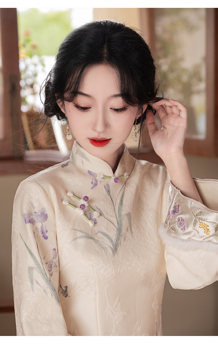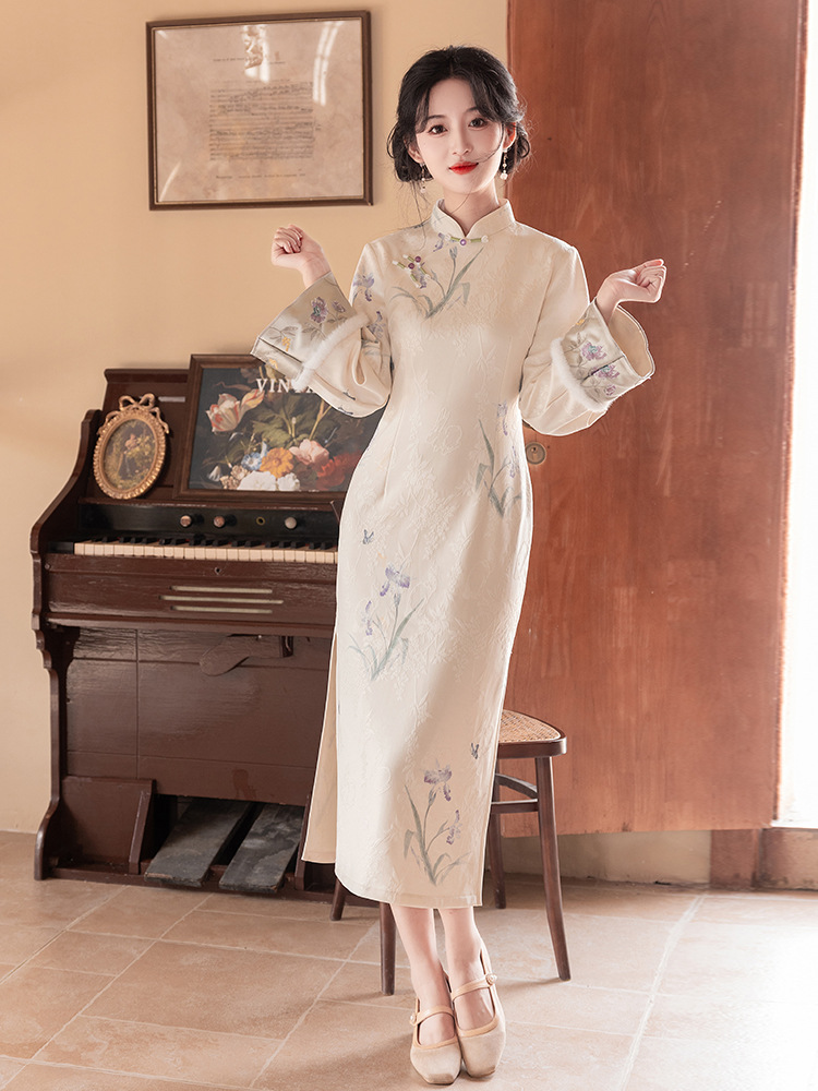 Сиреневый цветочный чонсам осень-зима 2024 новый высококачественный стройный, улучшенный темперамент Новый китайский повседневный