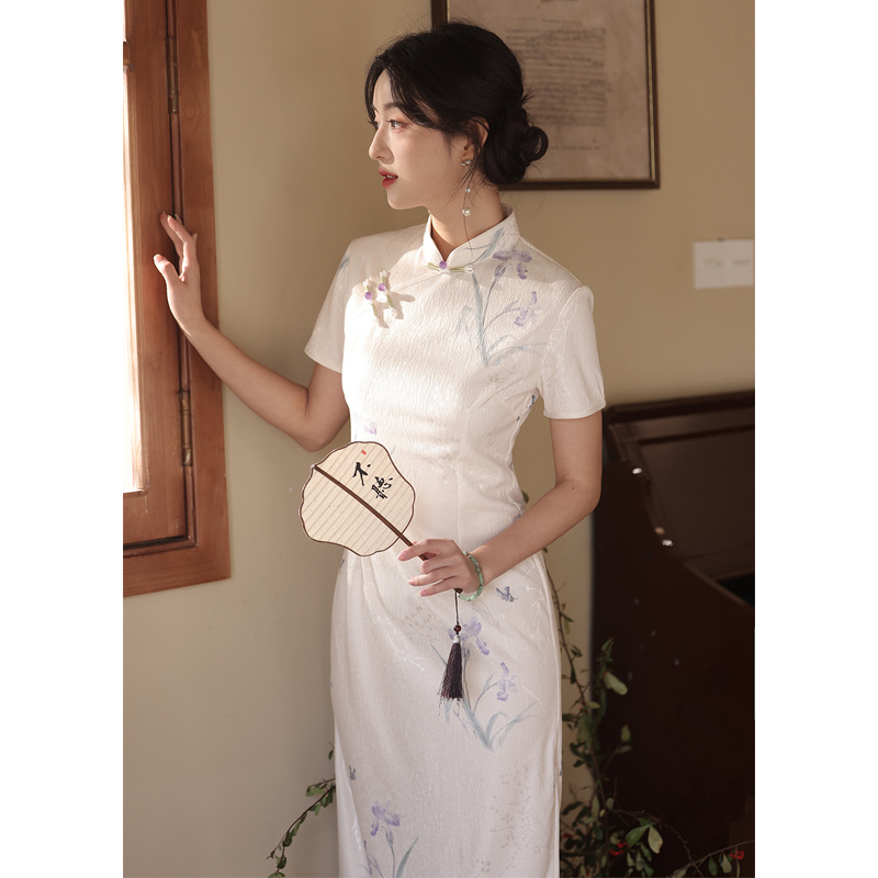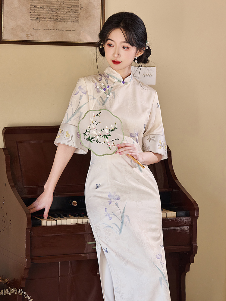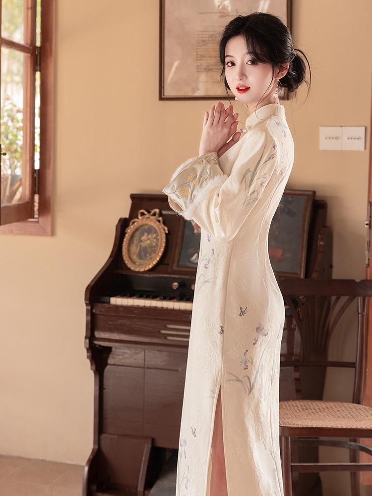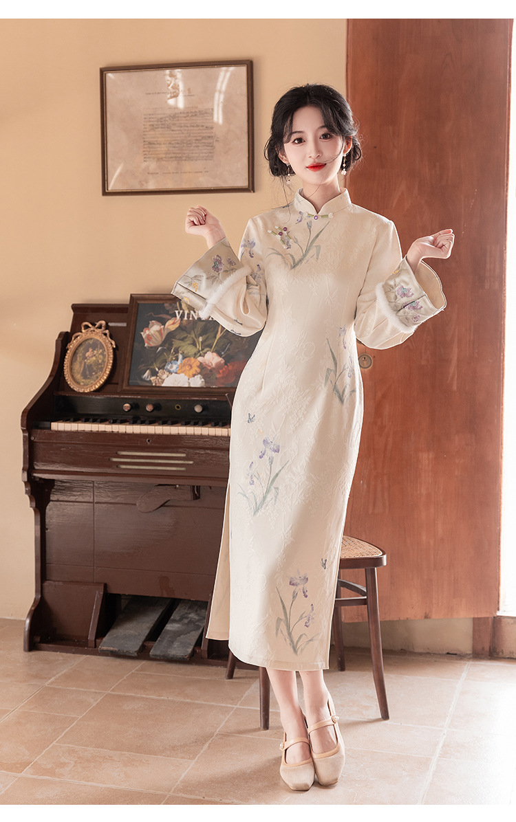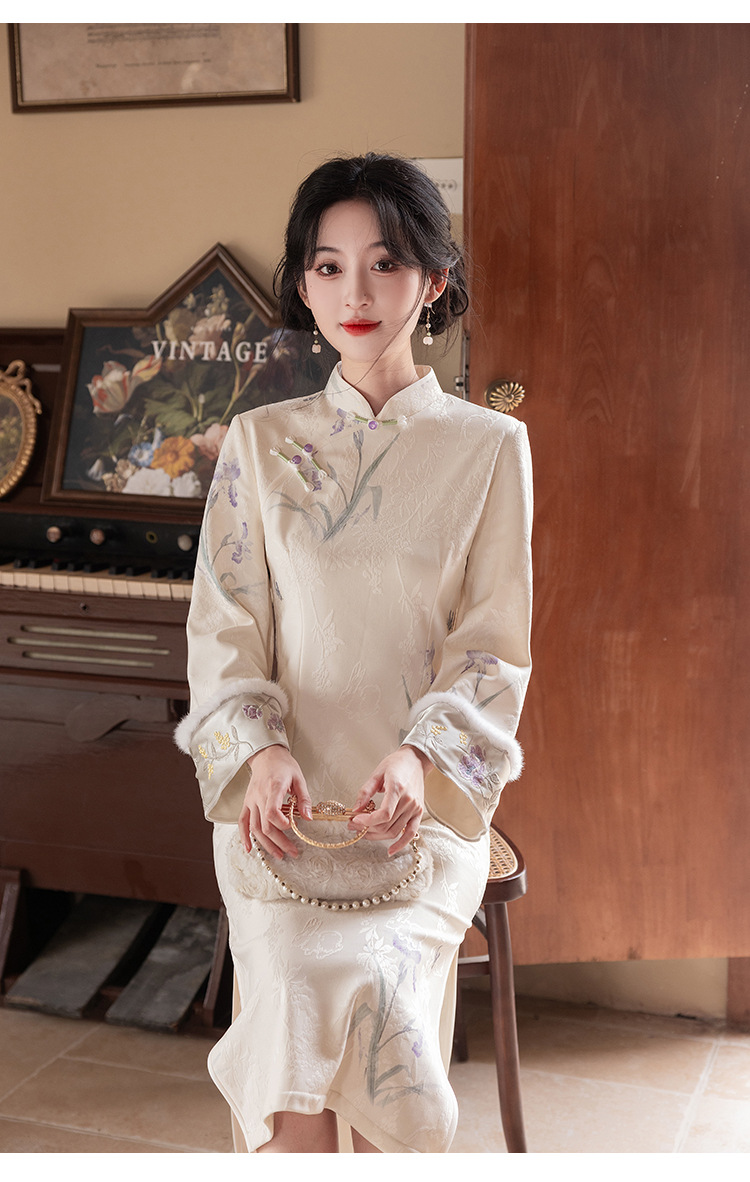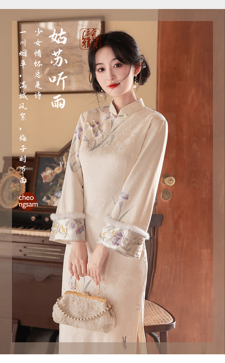 Сиреневый цветочный чонсам осень-зима 2024 новый высококачественный стройный, улучшенный темперамент Новый китайский повседневный