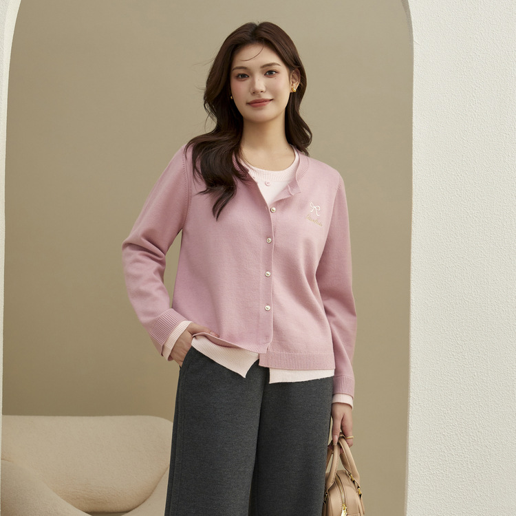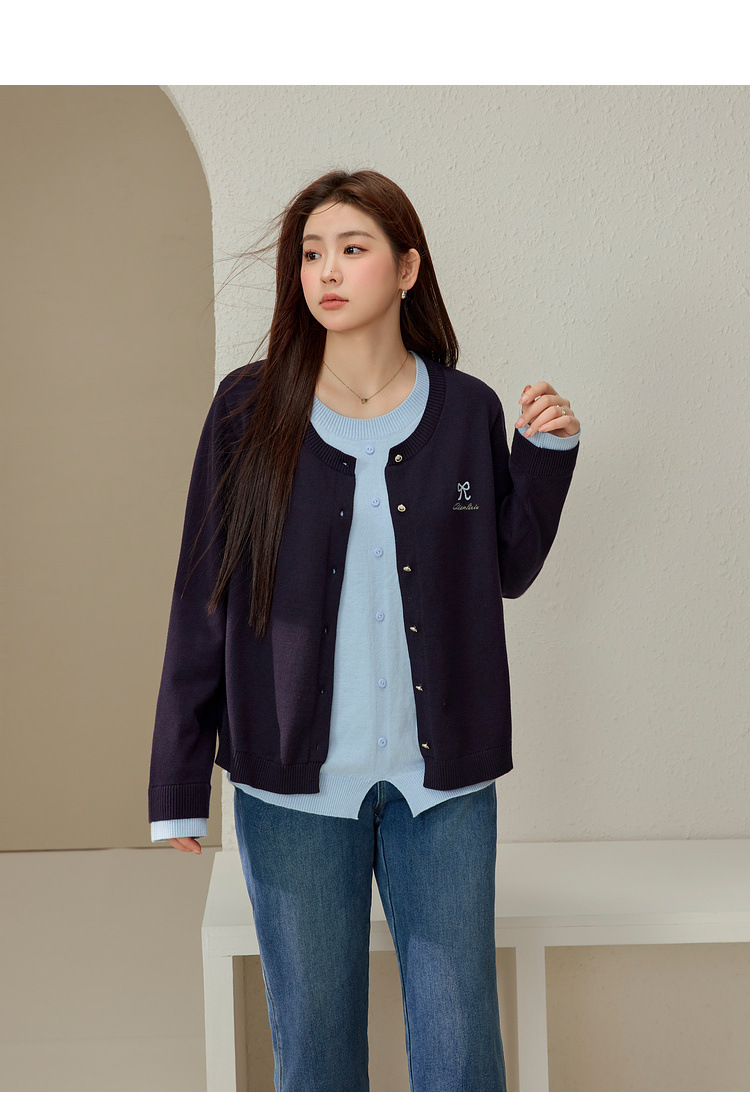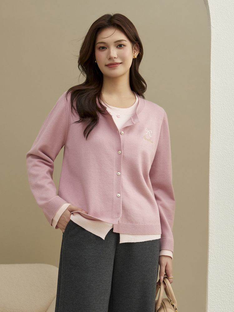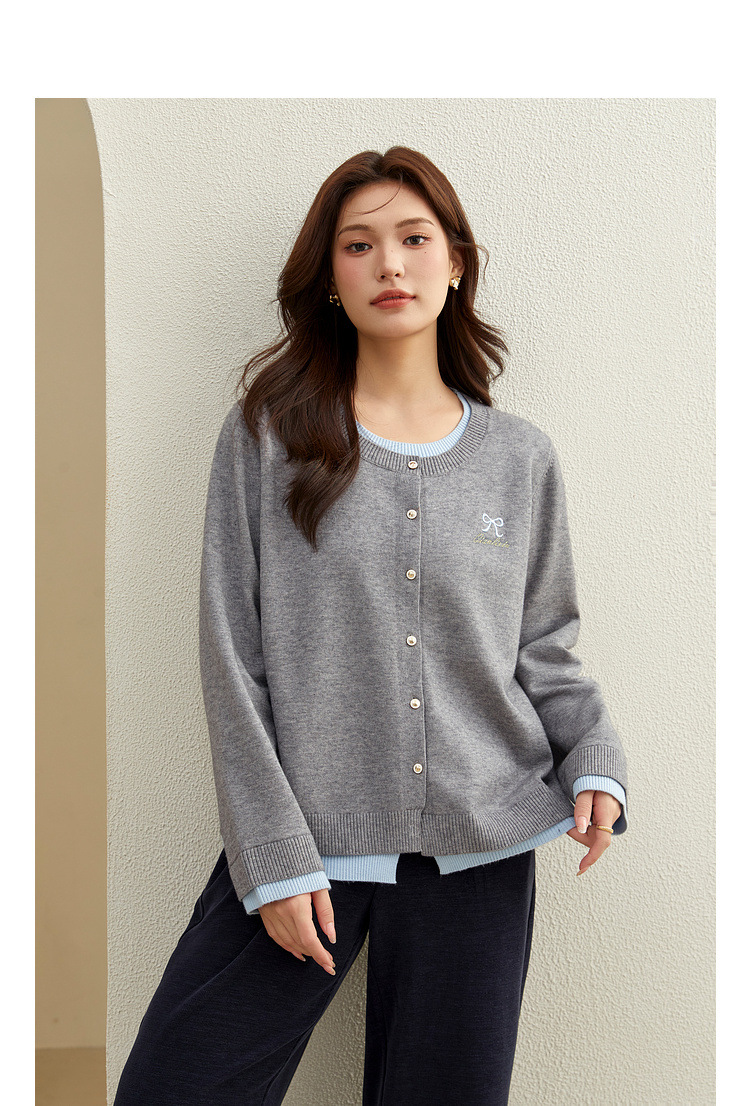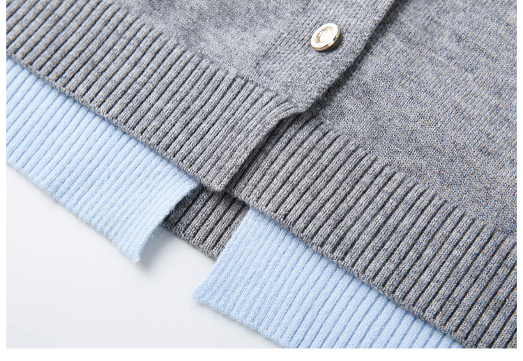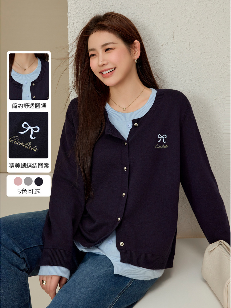 Цветное шоу большого размера женская корейская нежная, простой с круглым вырезом, контрафактные два поддельных свитера жирный mm2024 зимний новый