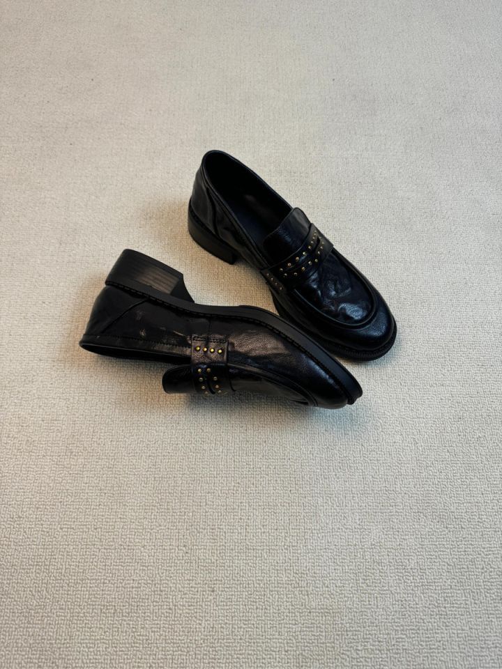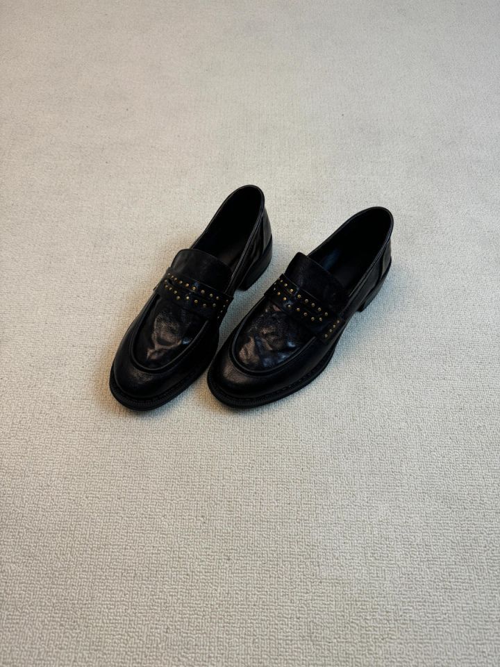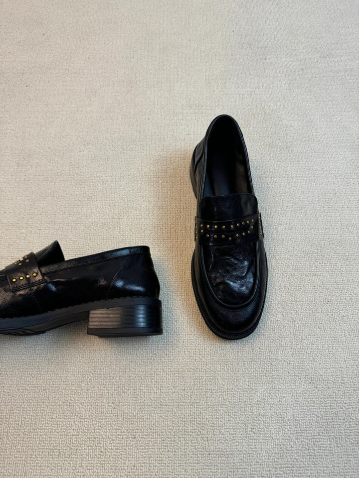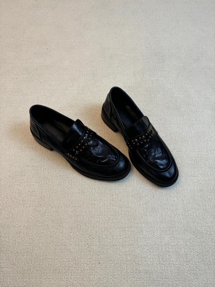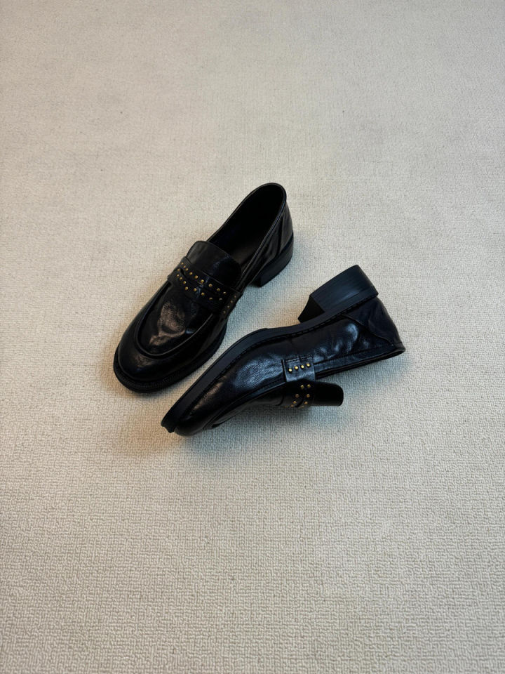 Новинка 2023 года, женские лоферы в британском стиле в стиле ретро, плиссированные черные маленькие кожаные туфли без шнуровки на толстом каблуке с круглым носком и заклепками