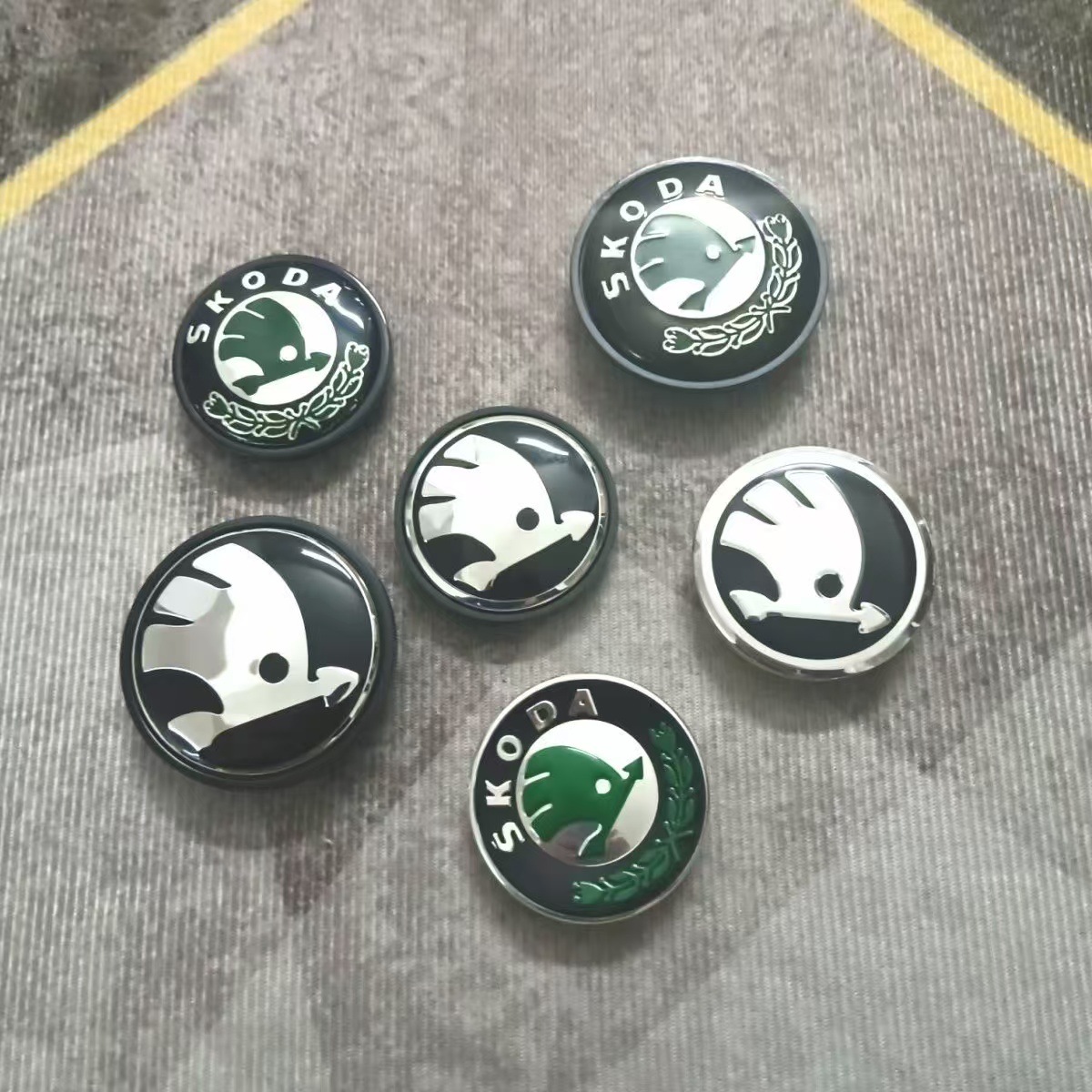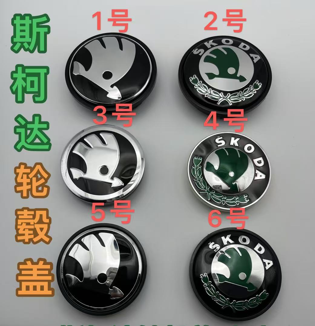 Skoda 56 мм вогнутая маркировка зеленого цвета; Skoda серебряная этикетка 56 мм.; Skoda 56 мм выпуклая зеленая этикетка; Skoda 56 мм выпуклая серебряная этикетка; Skoda 65 мм выпуклая зеленая этикетка; Skoda 65 мм выпуклая серебряная этикетка