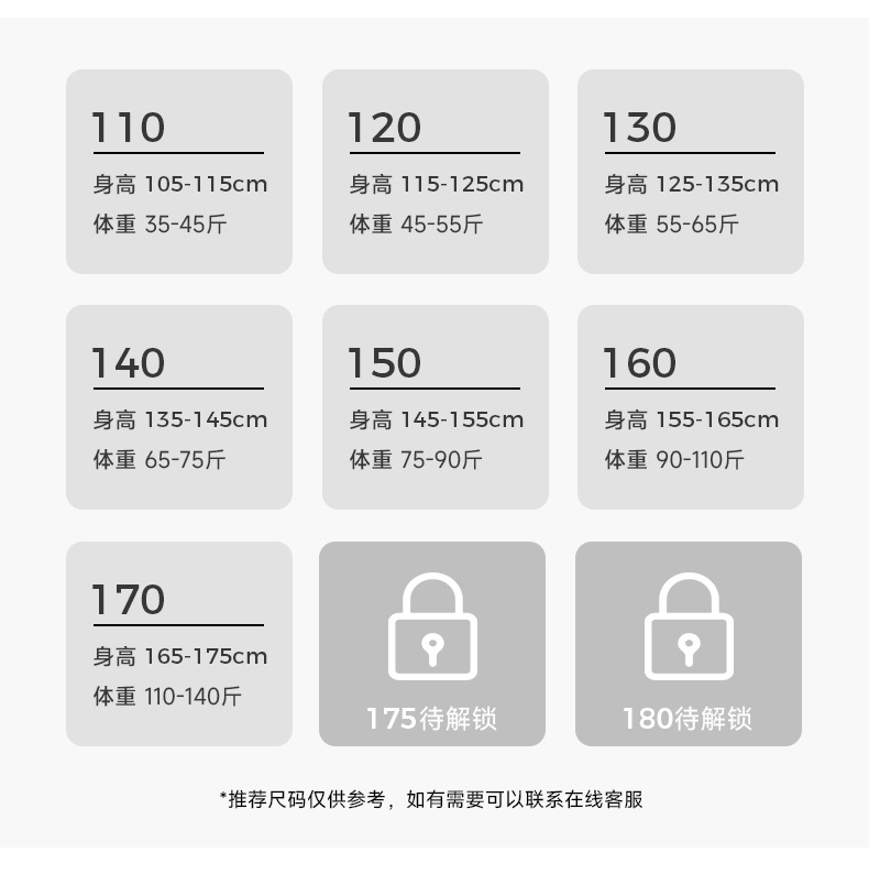 110cm; 120cm; 130cm; 140cm; 150cm; 160cm; 170cm