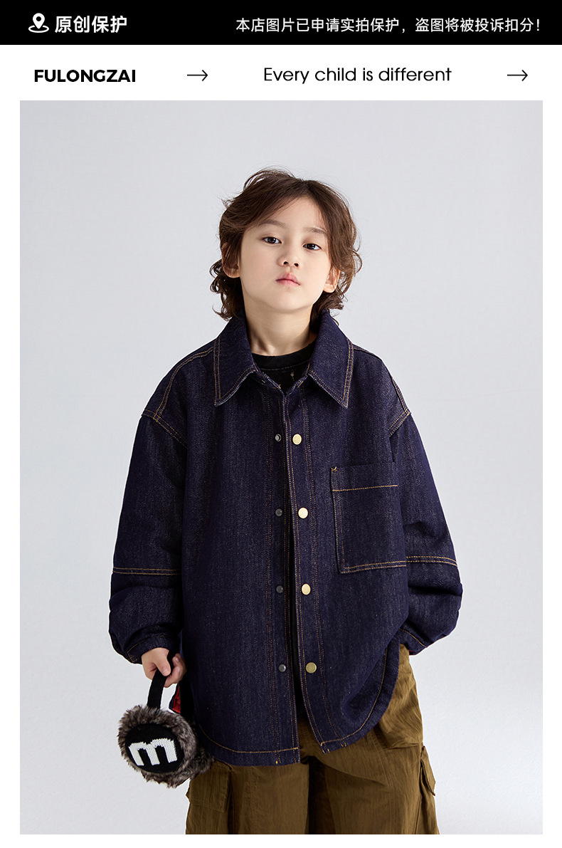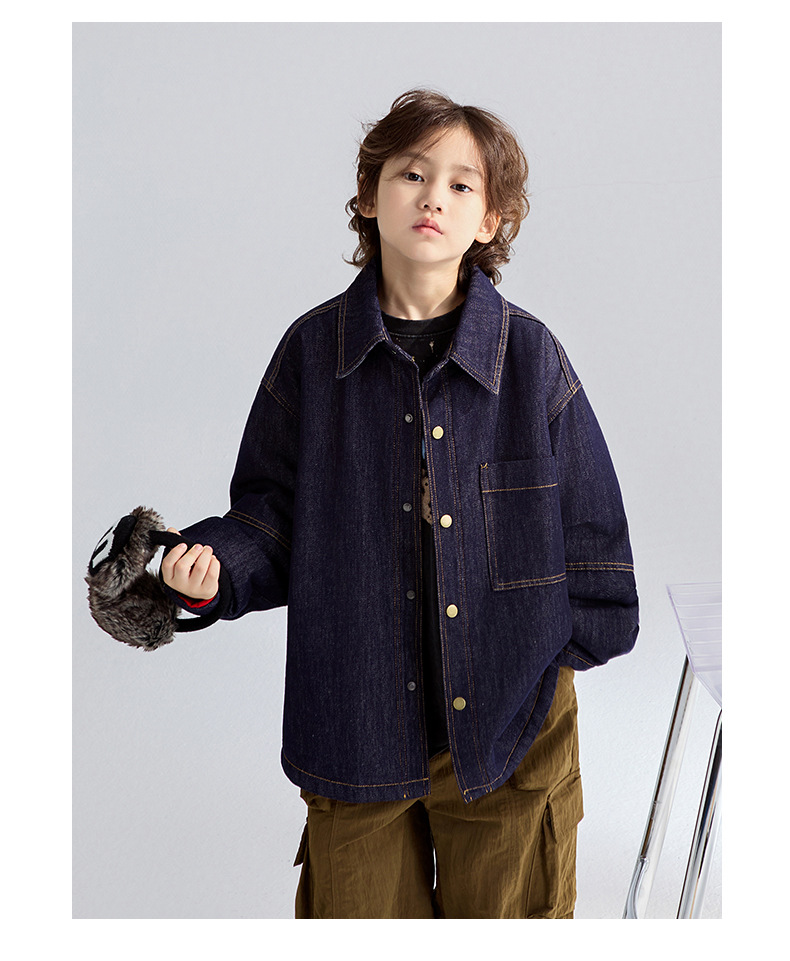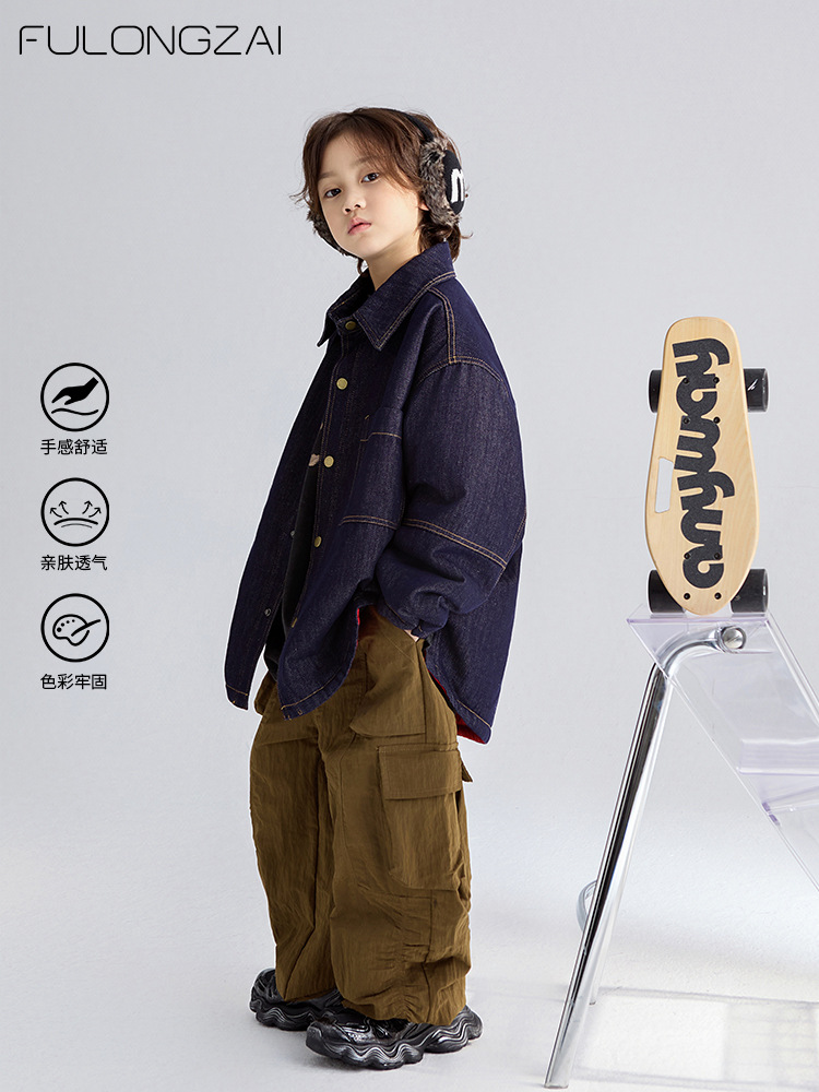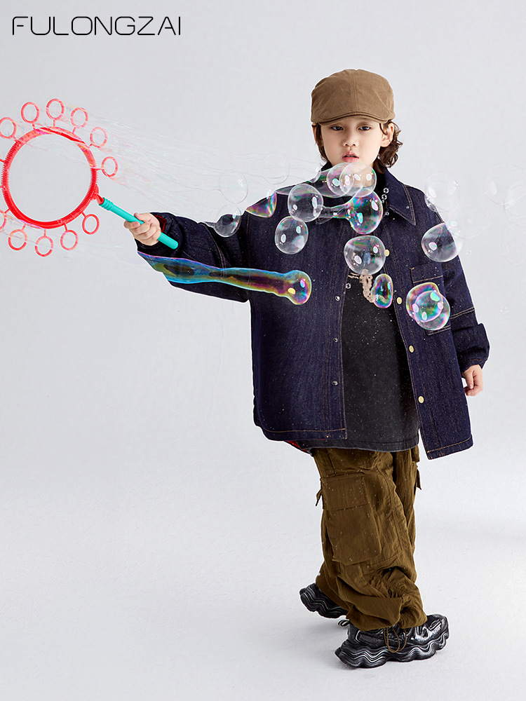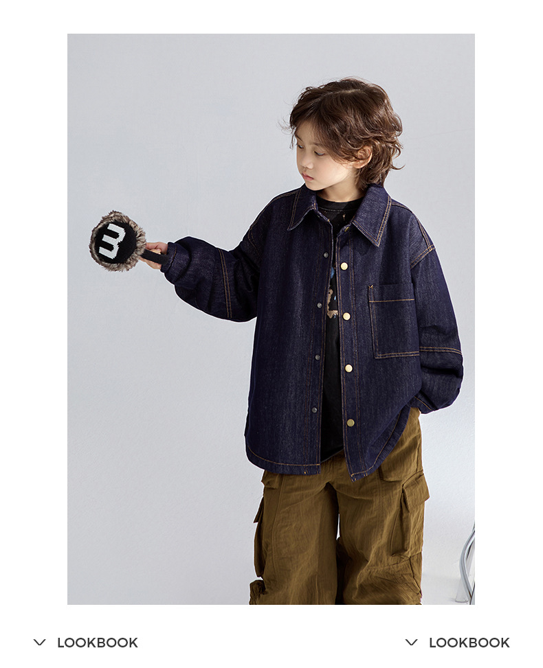 Детская одежда для родителей и детей, зима 2024, новый стиль для мальчиков и девочек, свободные и стильные детские джинсовые рубашки среднего и большого размера на флисовой подкладке и утолщенные детские джинсовые рубашки.