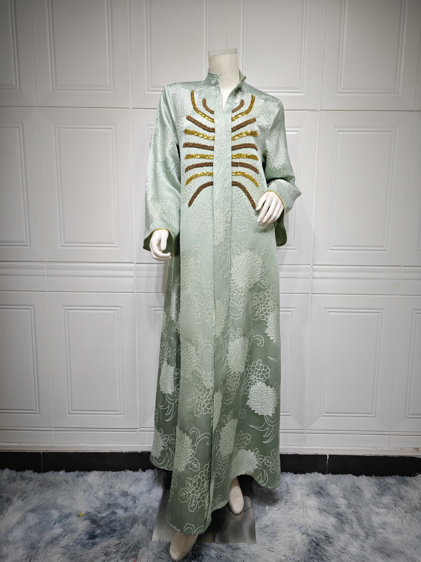AB402 跨境中东穆斯林长袍迪拜连衣裙V领提花钉珠新款亚马逊女装