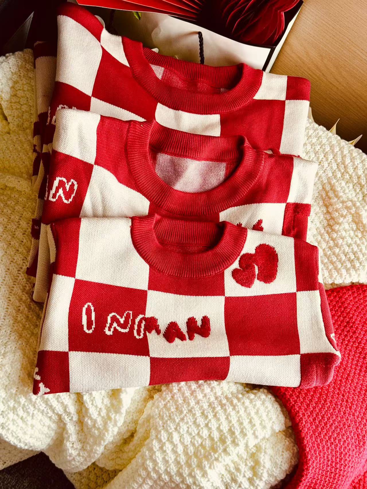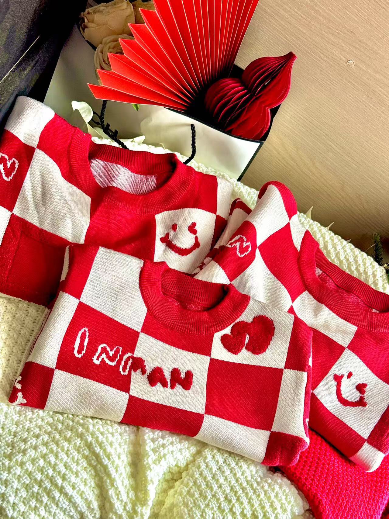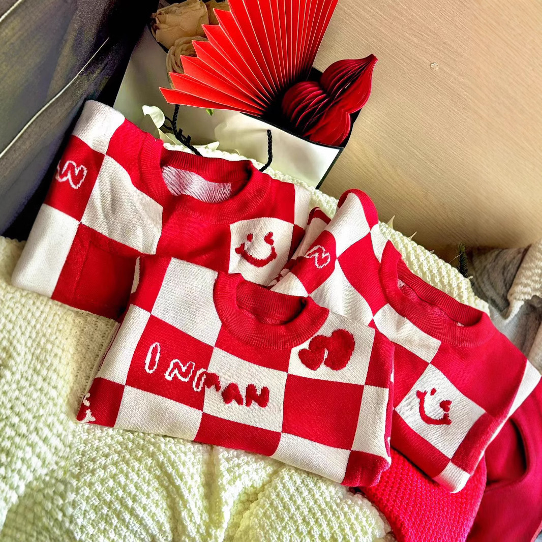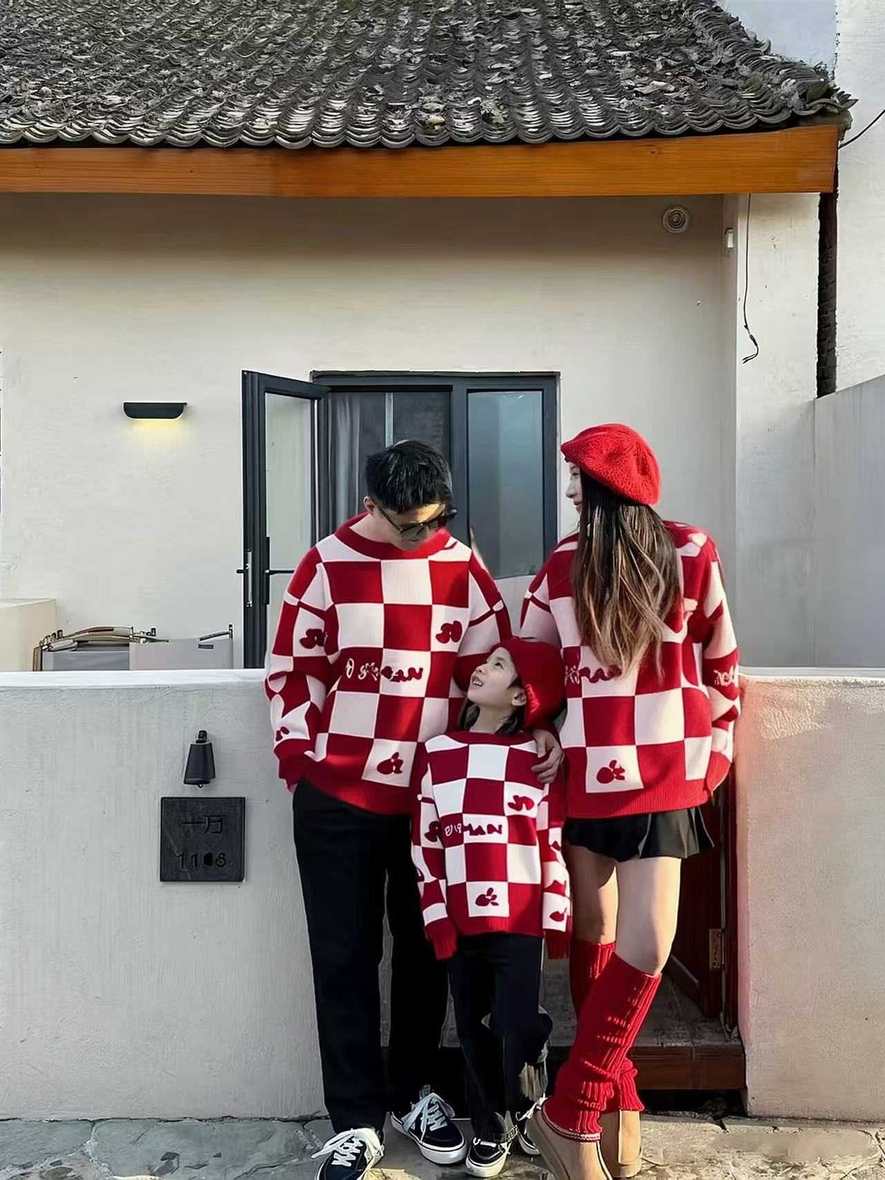 Родина и ребенок в красном любовном свитере