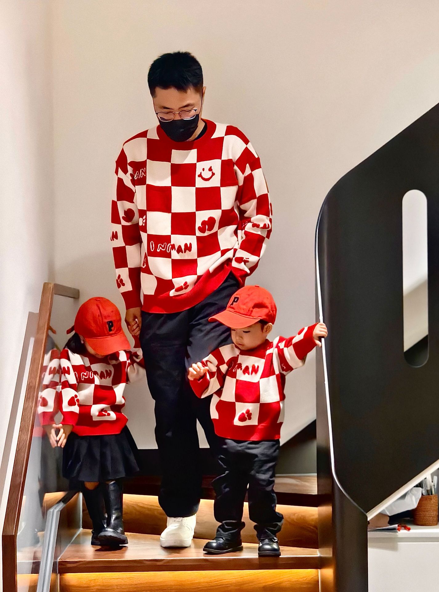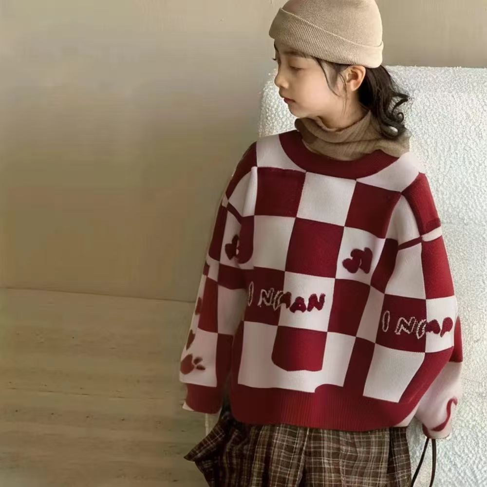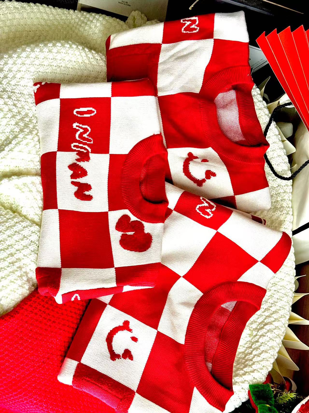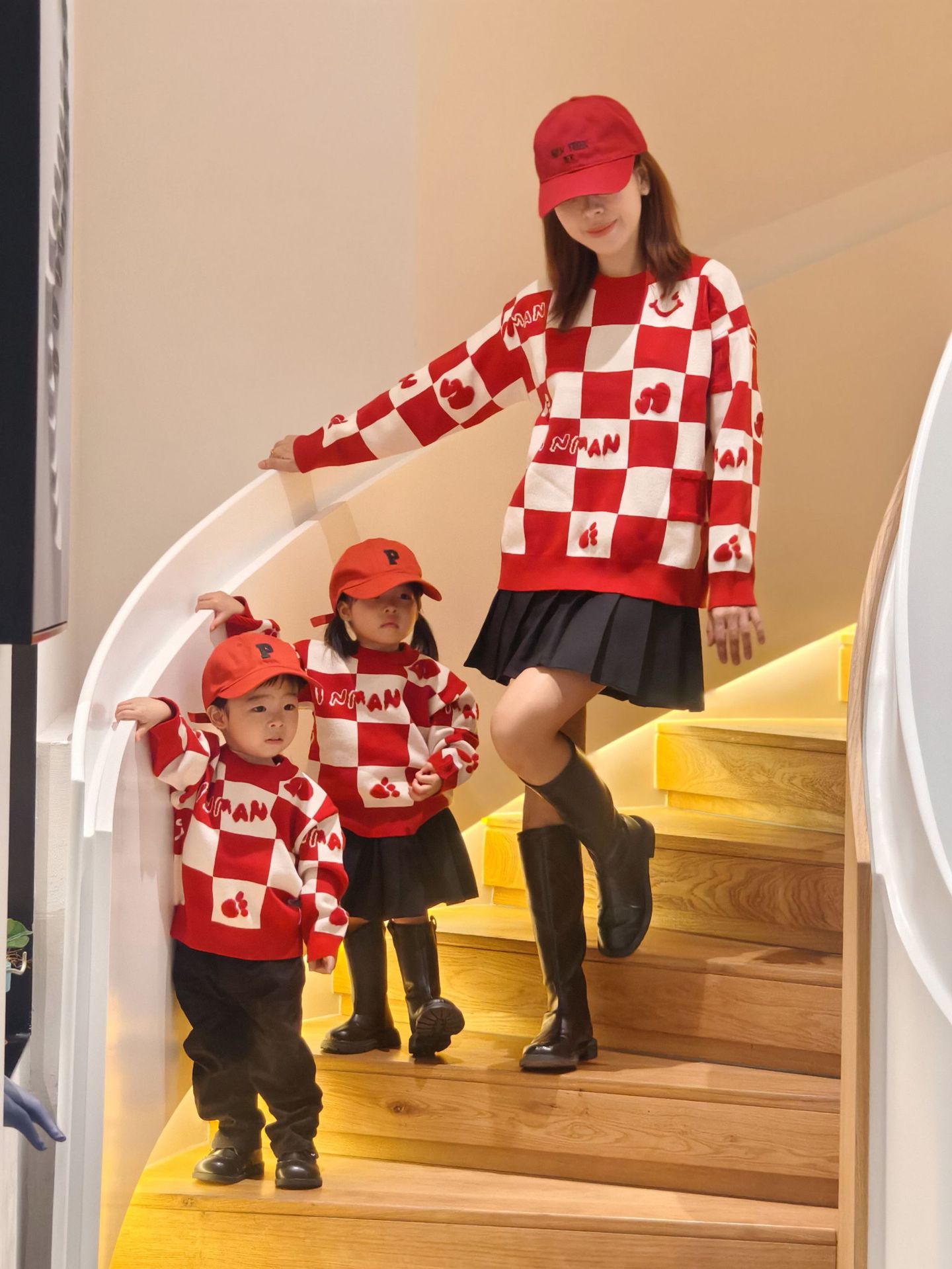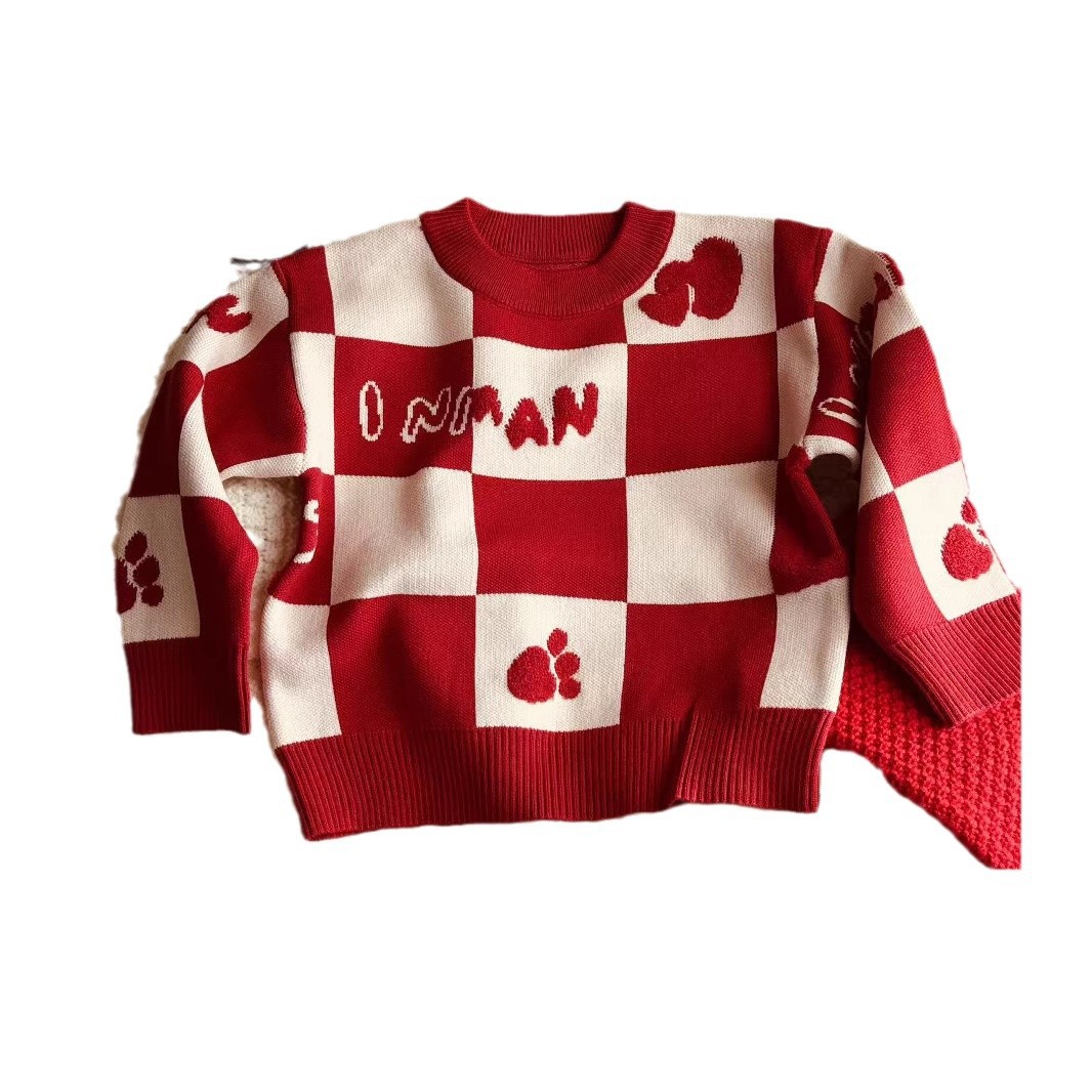 Родина и ребенок в красном любовном свитере
