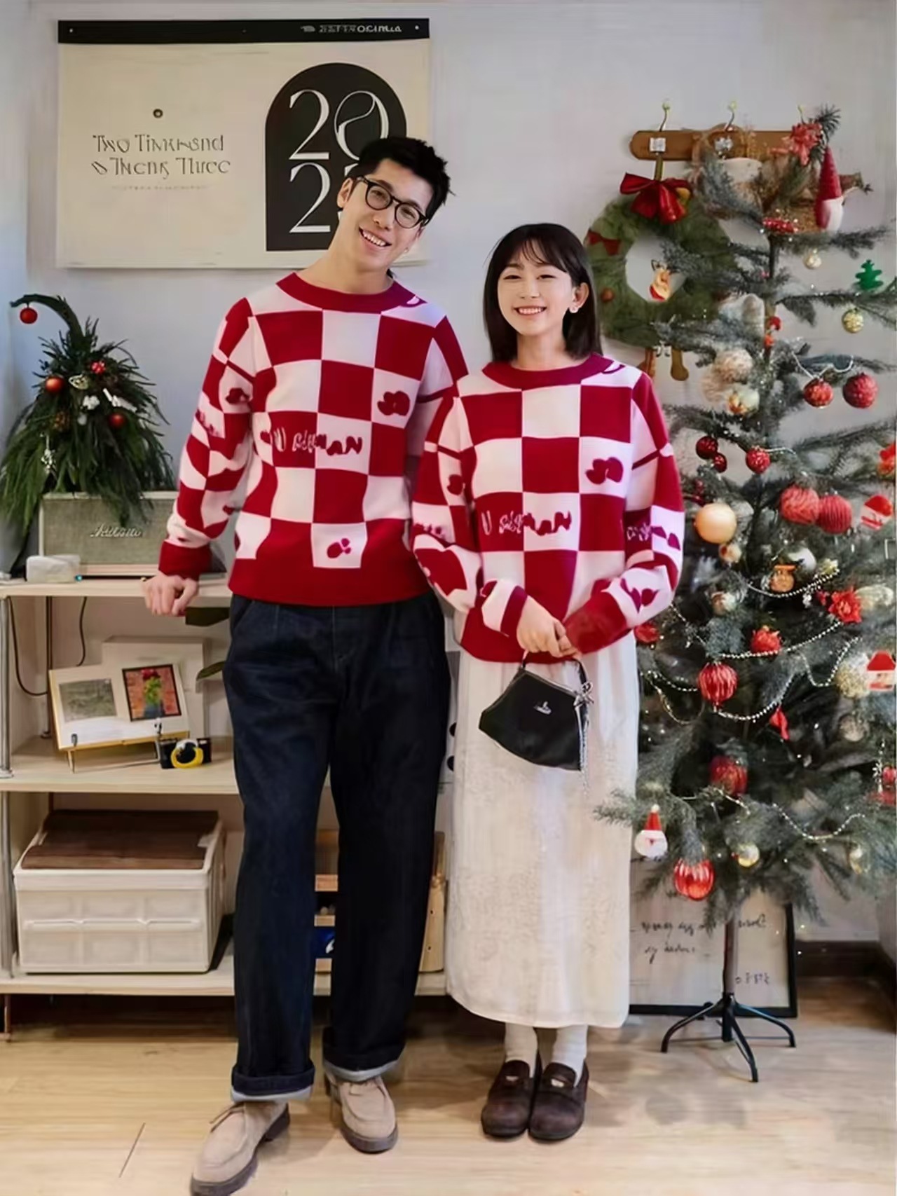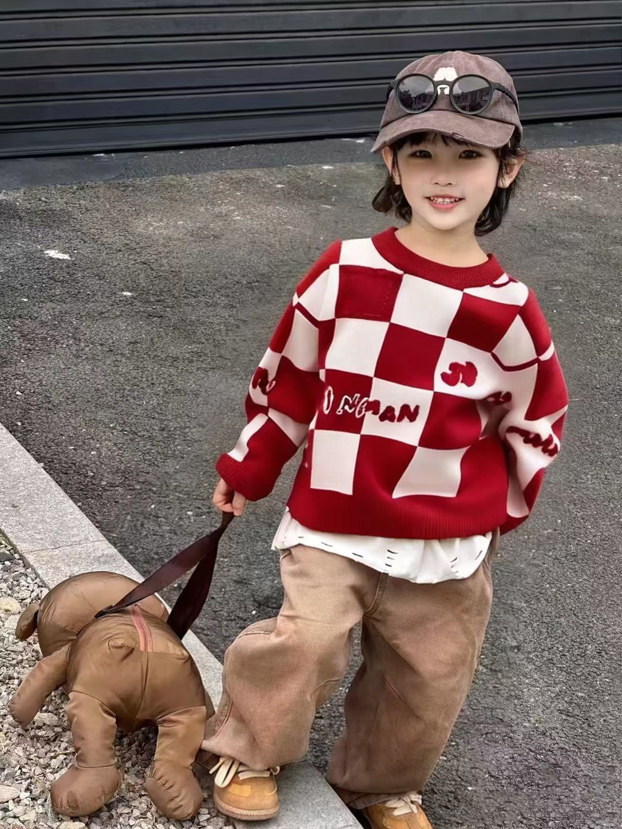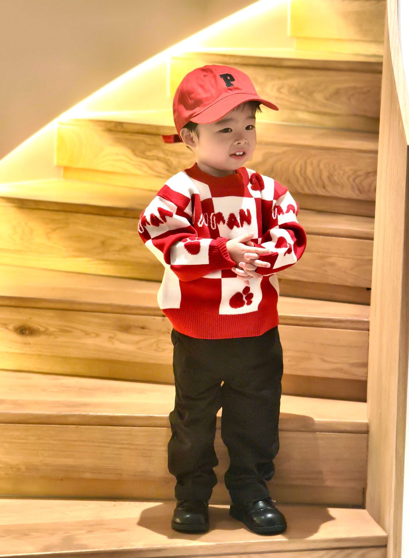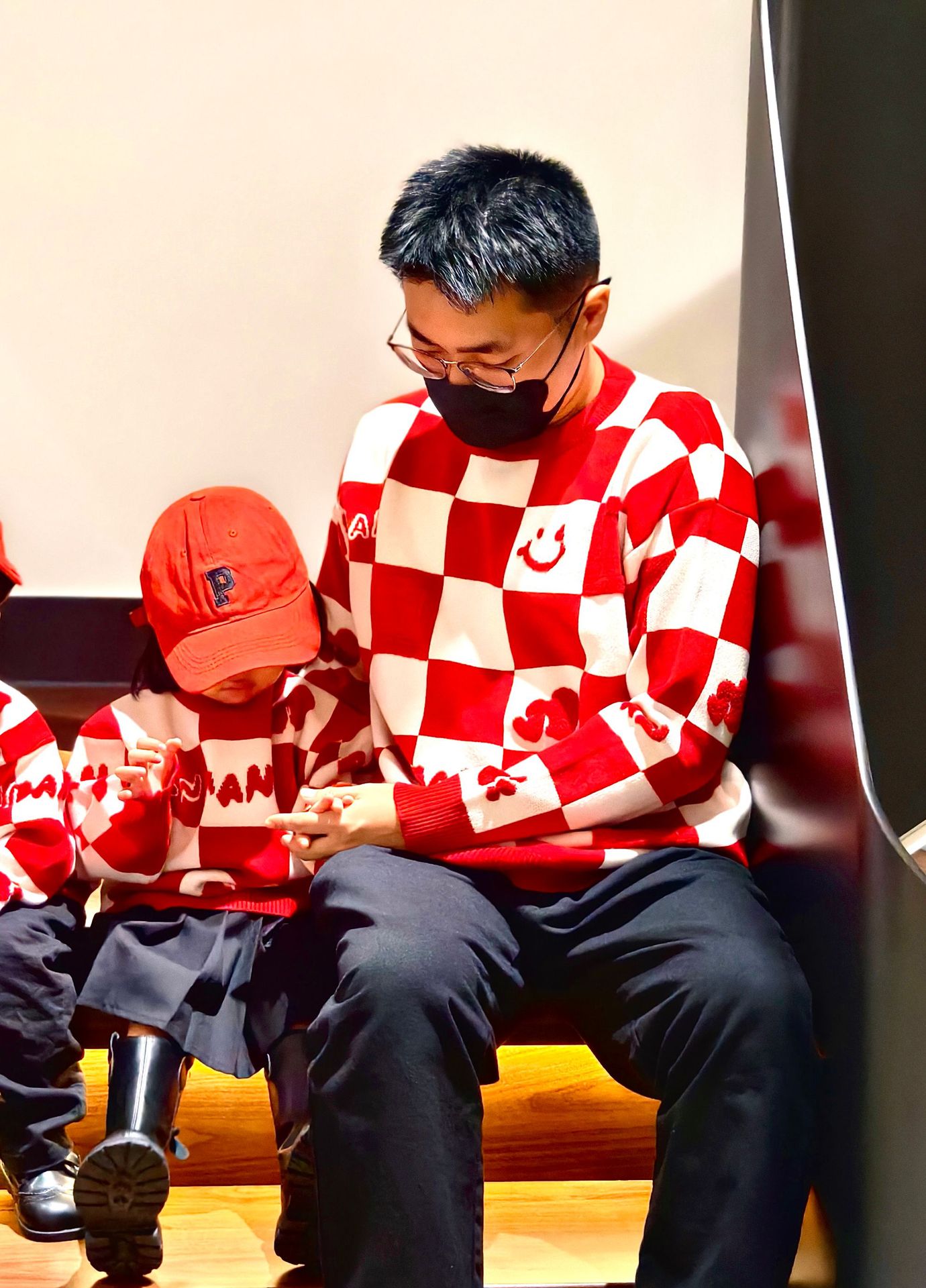 Родина и ребенок в красном любовном свитере