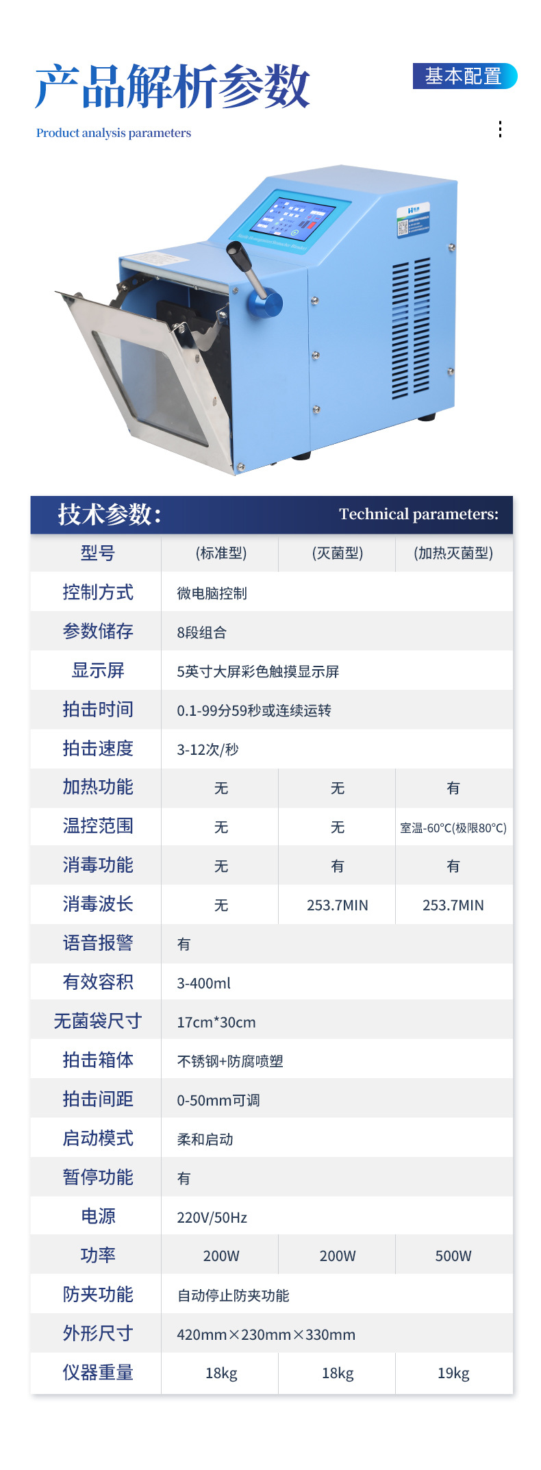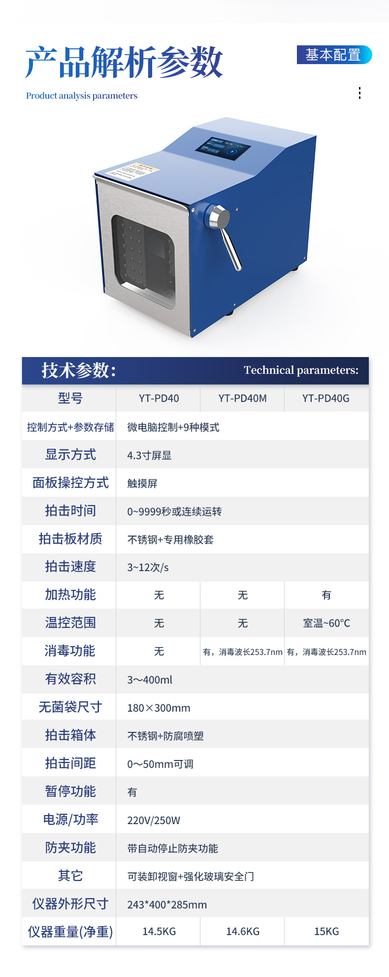 Стандартный настольный гомогенизатор PD40; PD40M Стерилизованный ламинарный гомогенизатор; PD40G Нагревательный и стерилизующий гомогенизатор с функцией взбивания; Стандартный тип P400; Тип стерилизации P400M; P400MG нагревательный стерилизационный тип; Герметичная стойка для образцов; открывалка для сумок; Средняя сумка (100 шт./пакет)