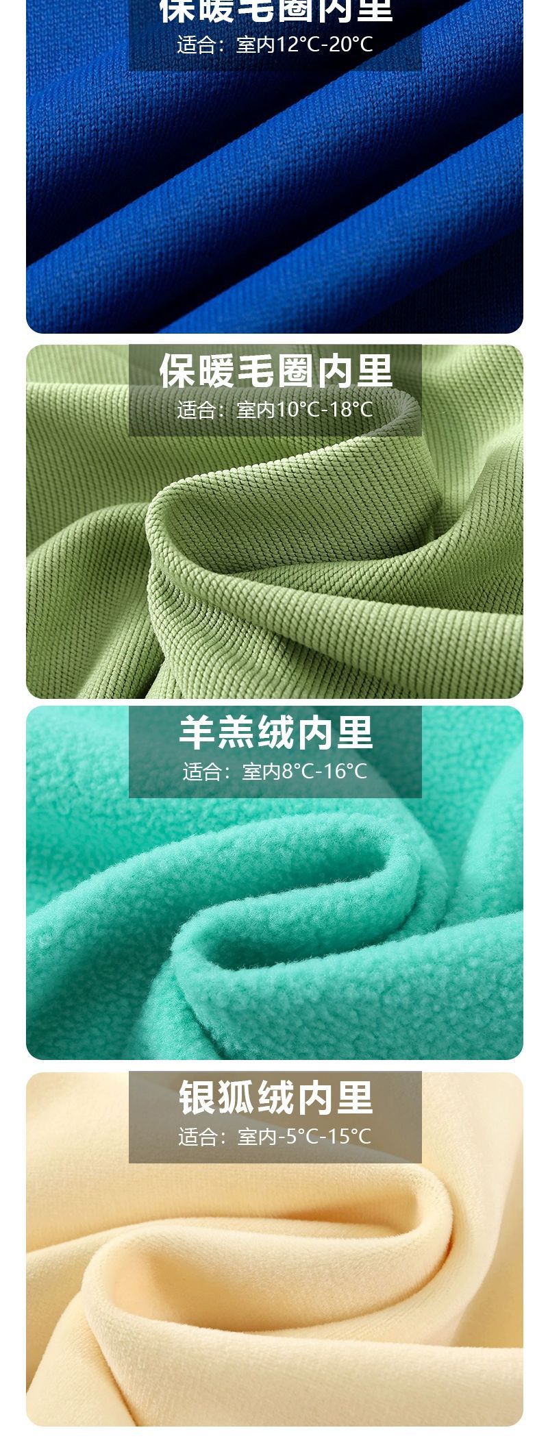 Тонкий круглый вырез из искусственного хлопка (подкладка из твила); Тонкий круглый вырез из полиэстера (махровая подкладка); махровый воротник из чистого хлопка (маленькая махровая подкладка); Пуловер из полиэстера и хлопка (махровая подкладка); пуловер из чистого хлопка (пуловер из чистого хлопка)