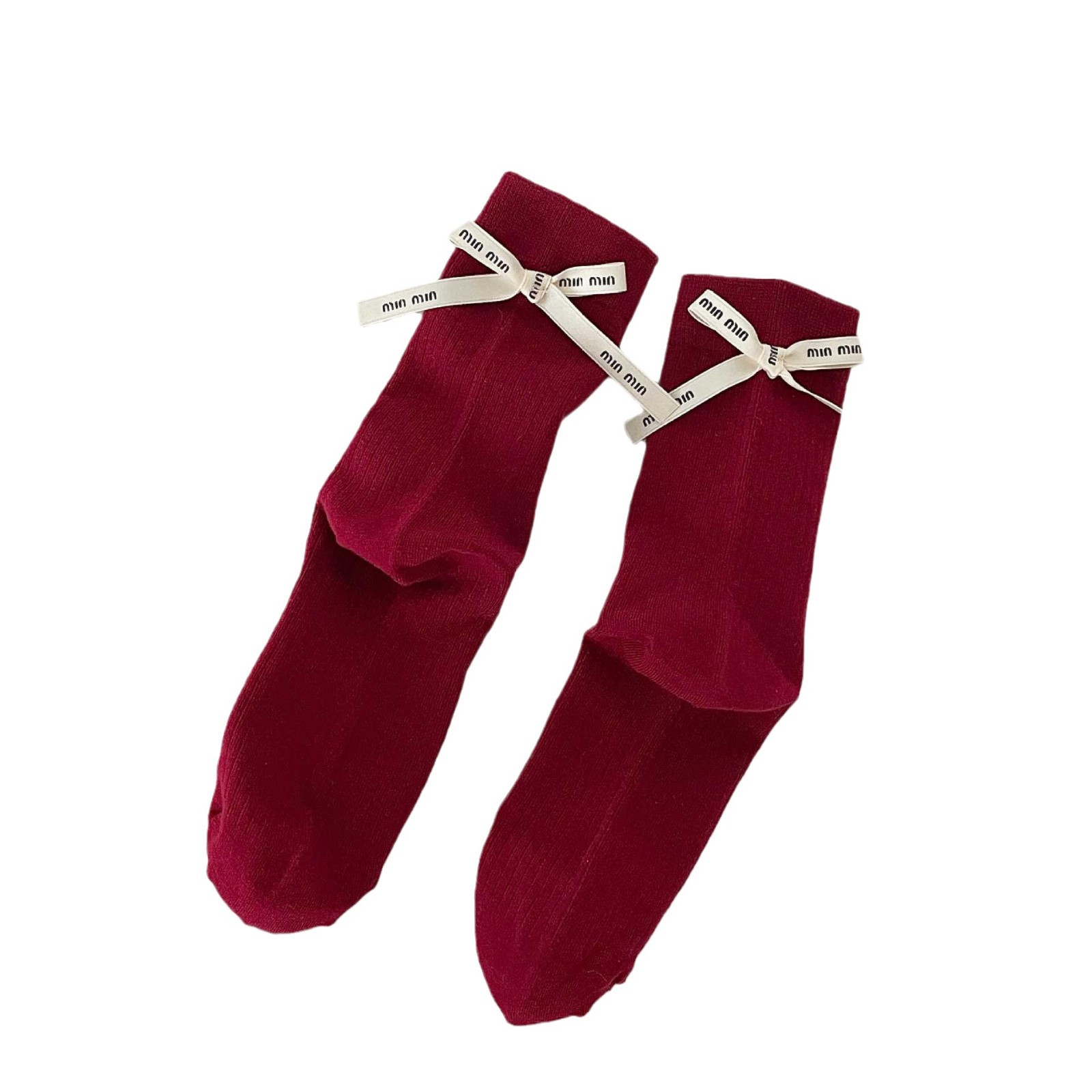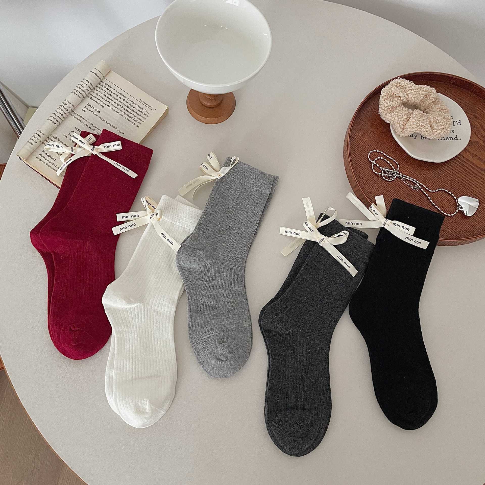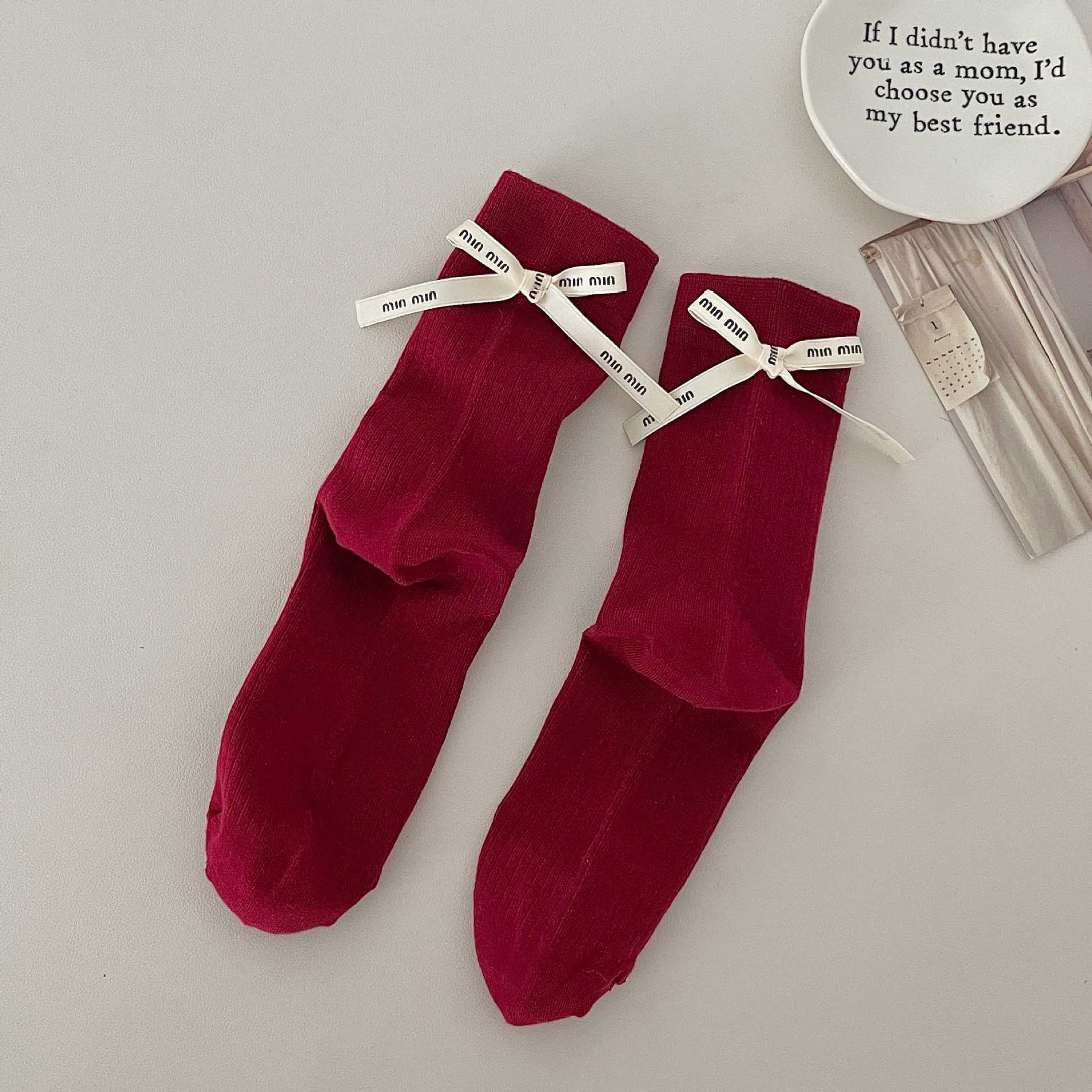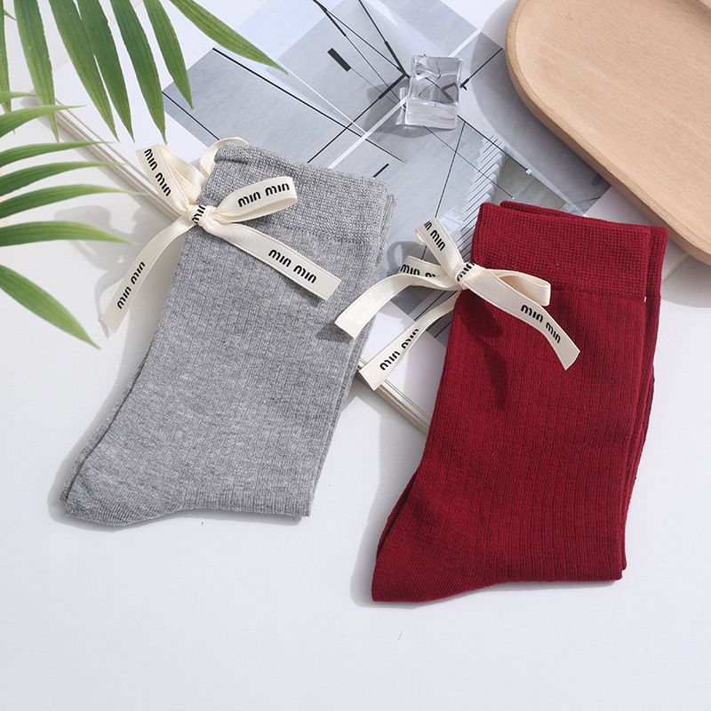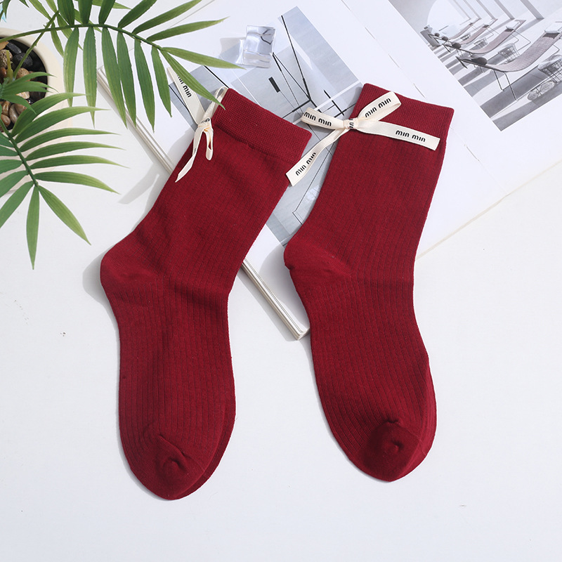 Весенние и летние носки до середины икры Xiaohongshu Instagram с бантом, однотонные, из чистого хлопка, красные, аксессуары, женские носки, праздничные носки на год рождения по китайскому зодиаку