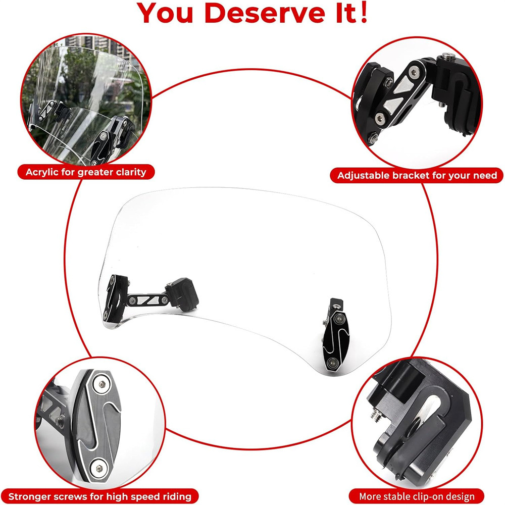 【可调式通用摩托车挡风玻璃】我们的摩托车挡风玻璃加长件可以安装在摩托车挡风玻璃的上边缘,以增加挡风玻璃的高度