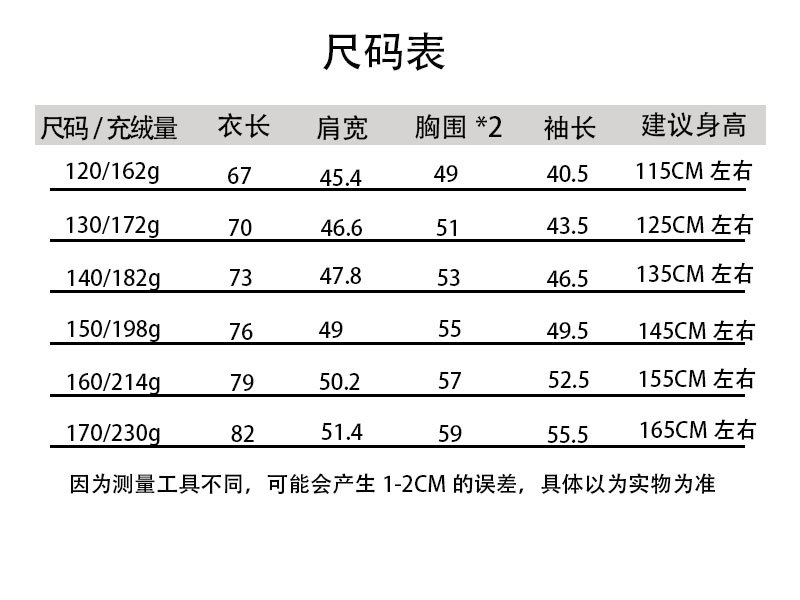 120cm; 130cm; 140cm; 150cm; 160cm; 170cm