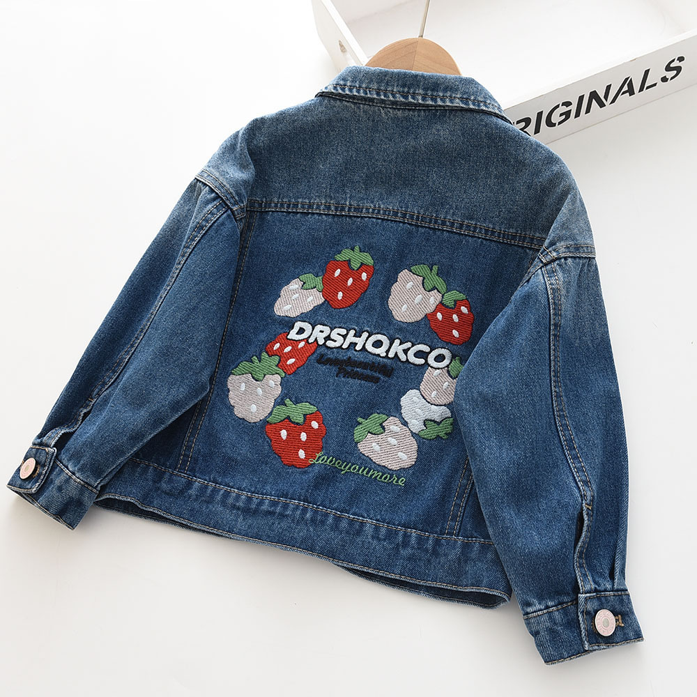 Джинсовая куртка с длинными рукавами для девочек с вышивкой клубники на спине, джинсовая куртка с лацканами, новинка осени 2022 года, модель 0716-08