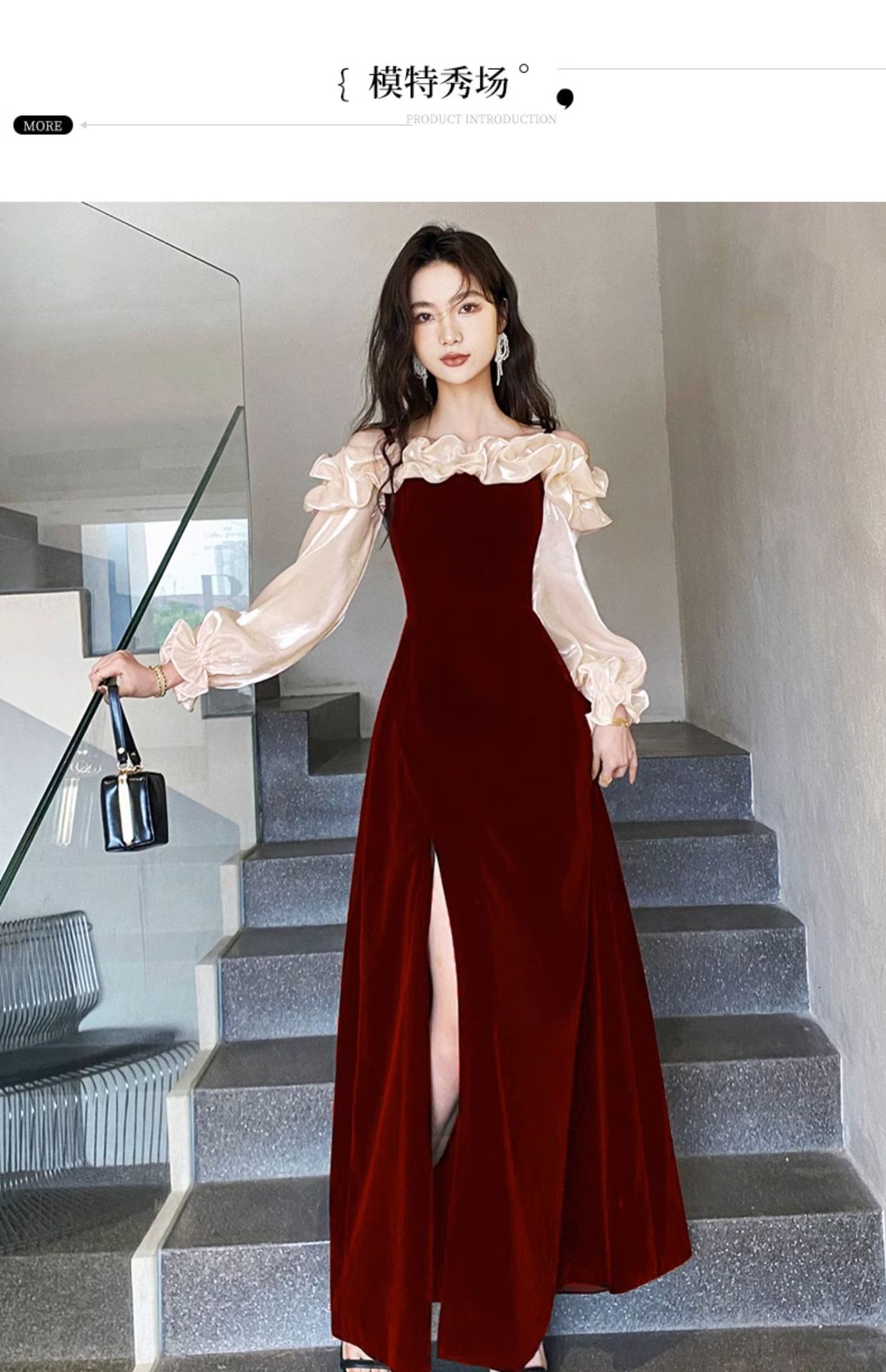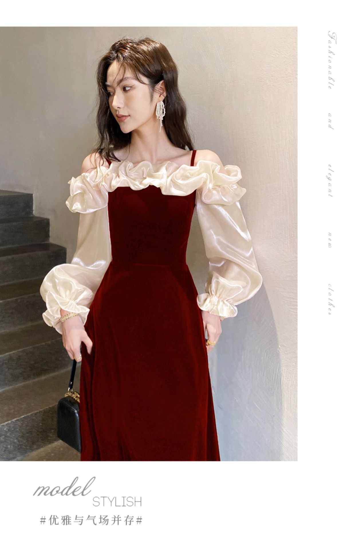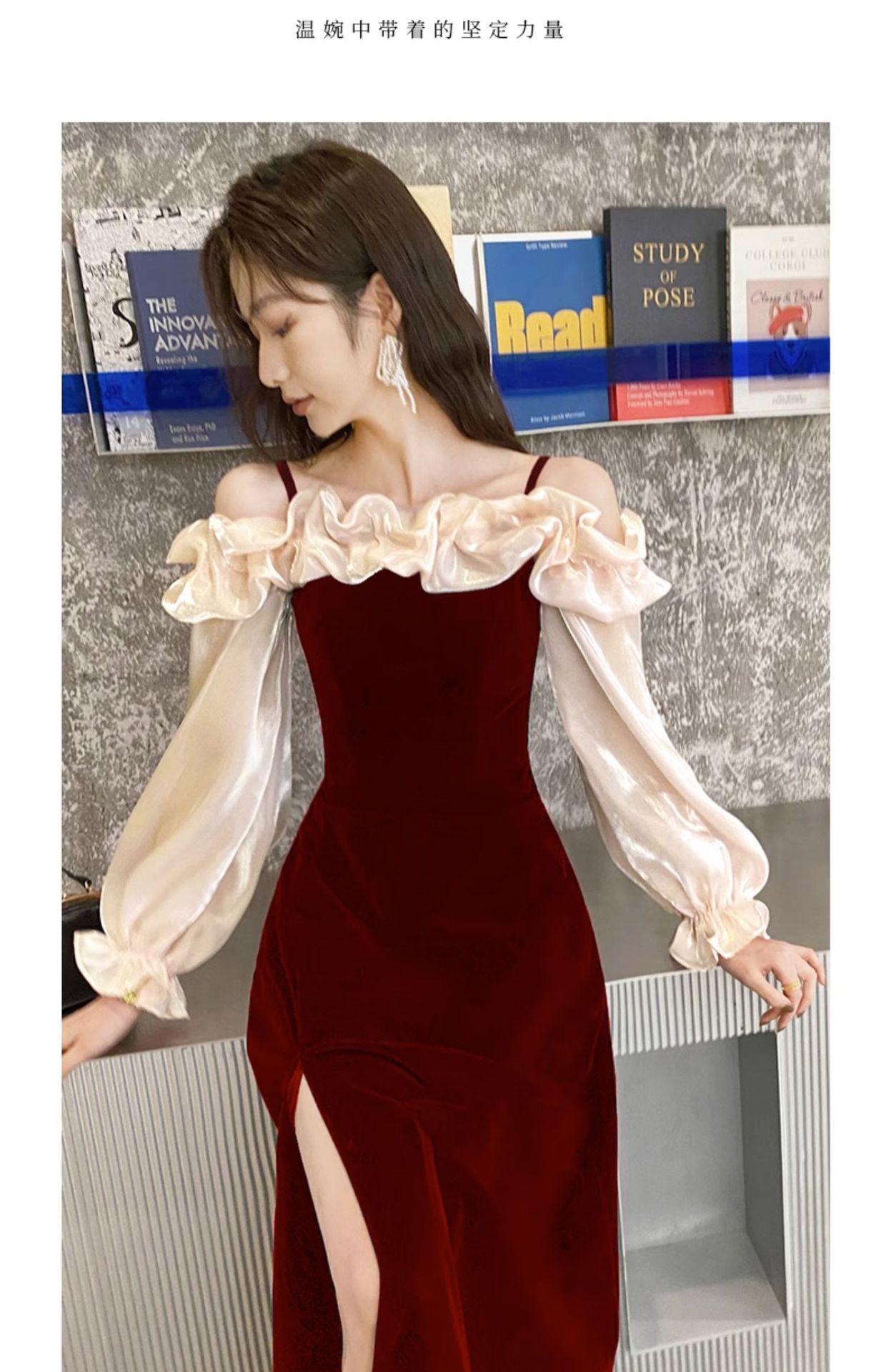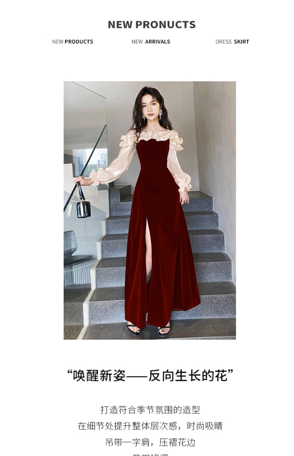 Чисто желание плечо и талия тонкие женские осенние и зимние новые темпераменты с открытыми листьями лотоса, сшитыми золотыми бархатными платьями