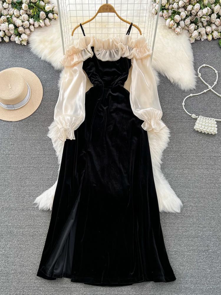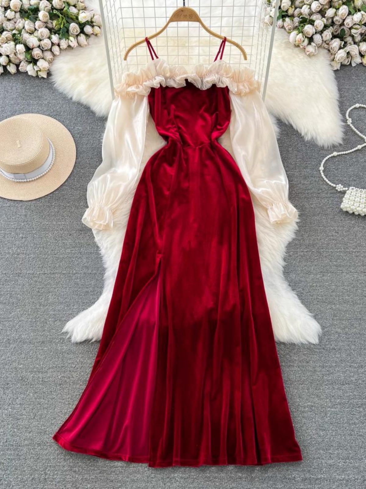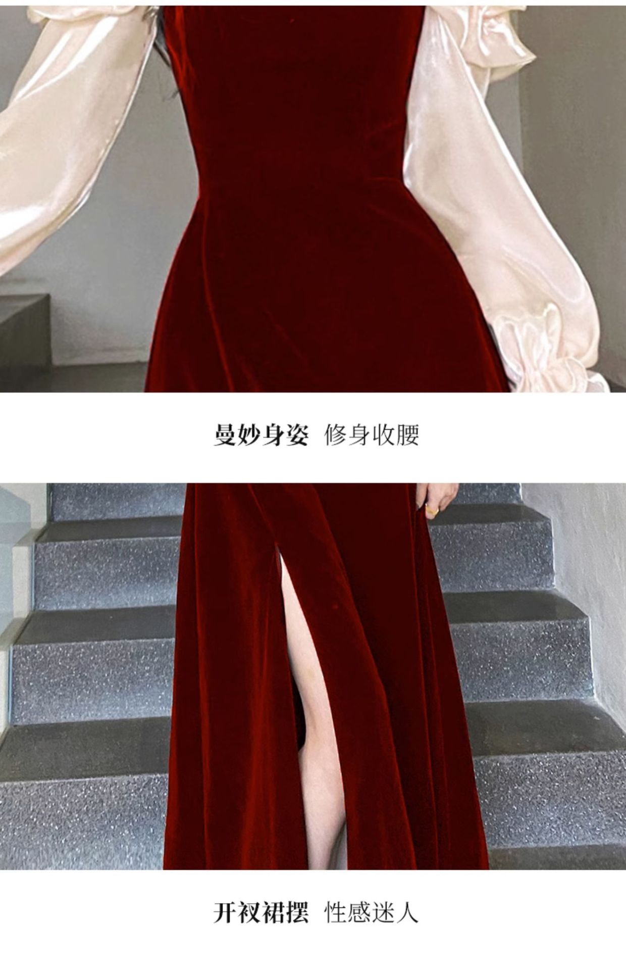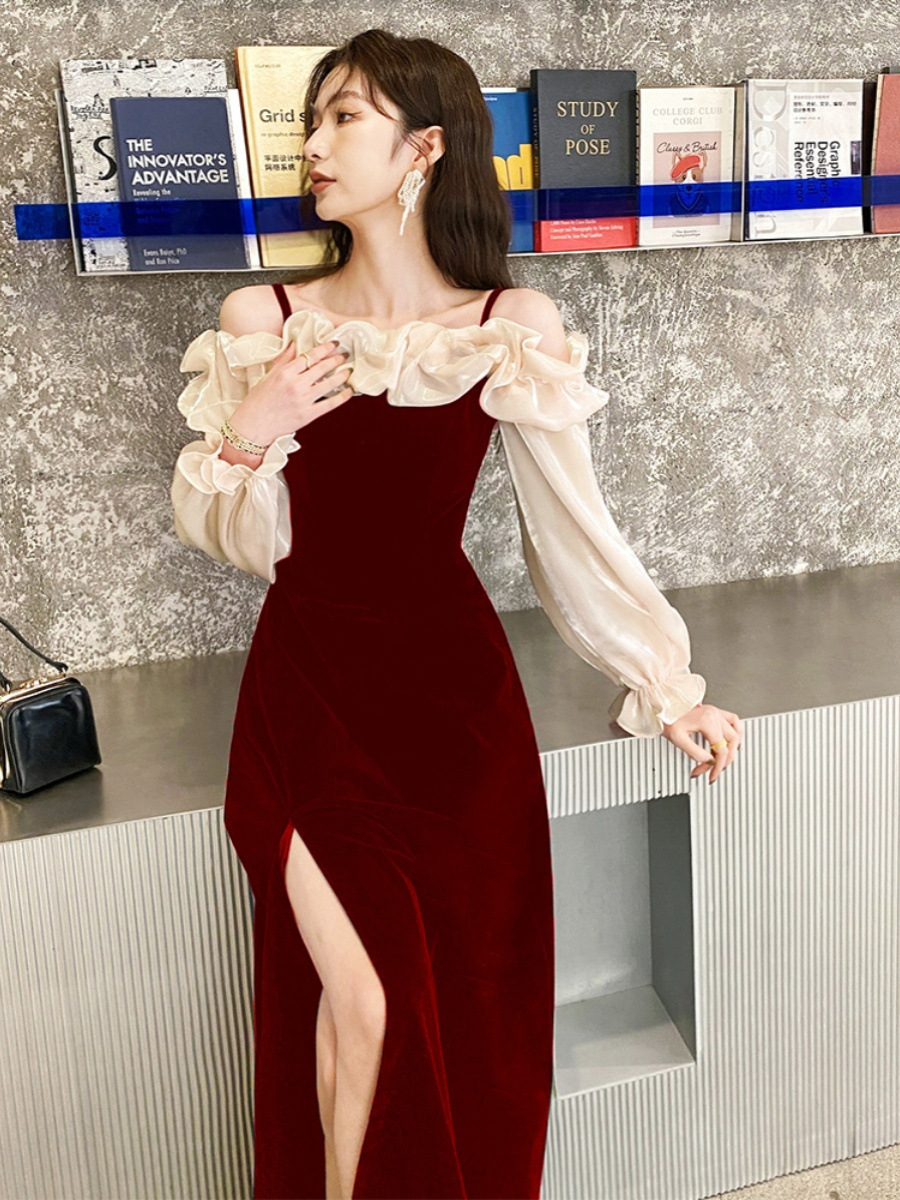 Чисто желание плечо и талия тонкие женские осенние и зимние новые темпераменты с открытыми листьями лотоса, сшитыми золотыми бархатными платьями