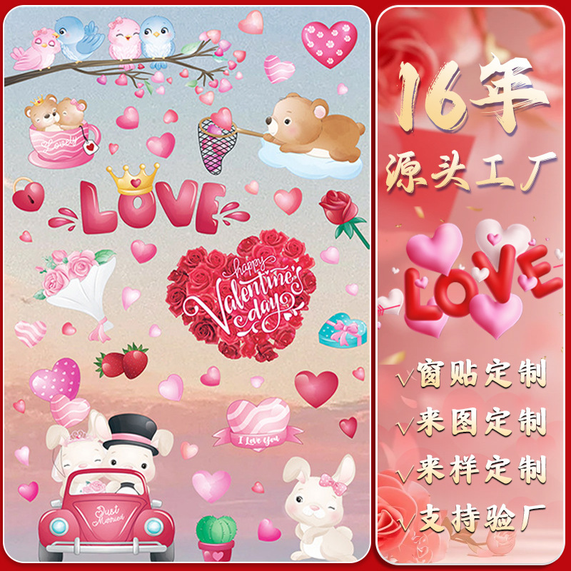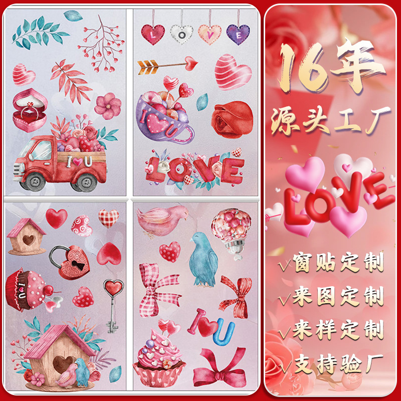 Трансграничные наклейки на стену ко Дню святого Валентина и наклейки на окна по индивидуальному заказу, оптовая продажа электростатических обоев «сделай сам», по индивидуальному заказу с фотографиями и образцами, реклама логотипа