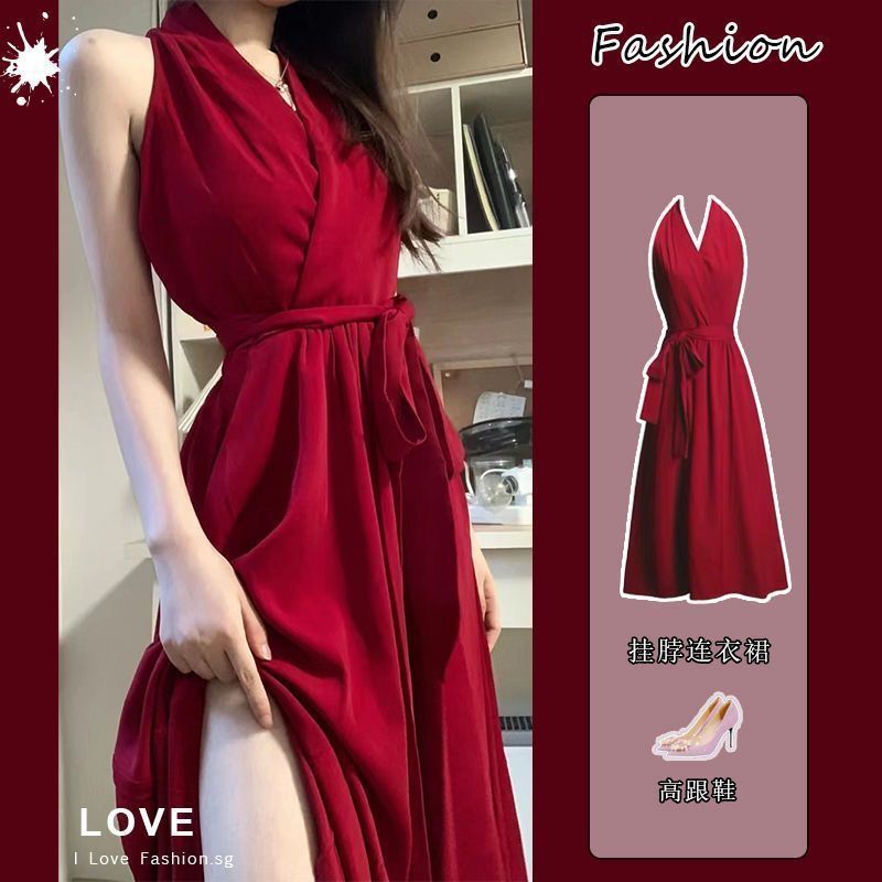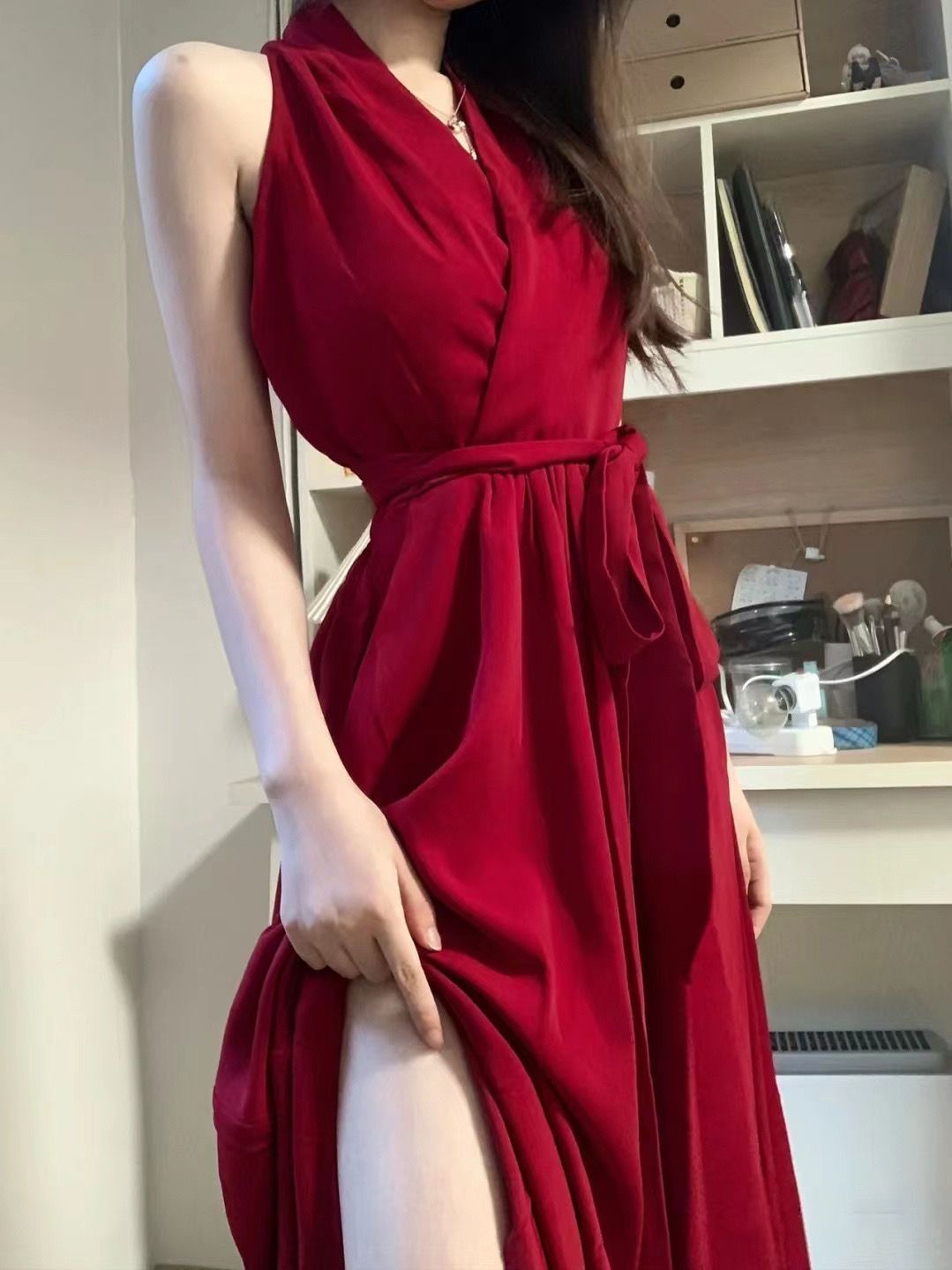Чистый ветер, красное платье на шею, женское 2024 Ранняя весна