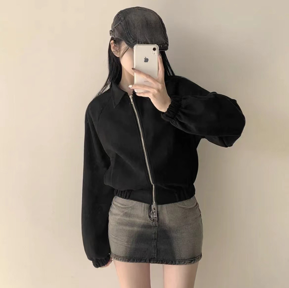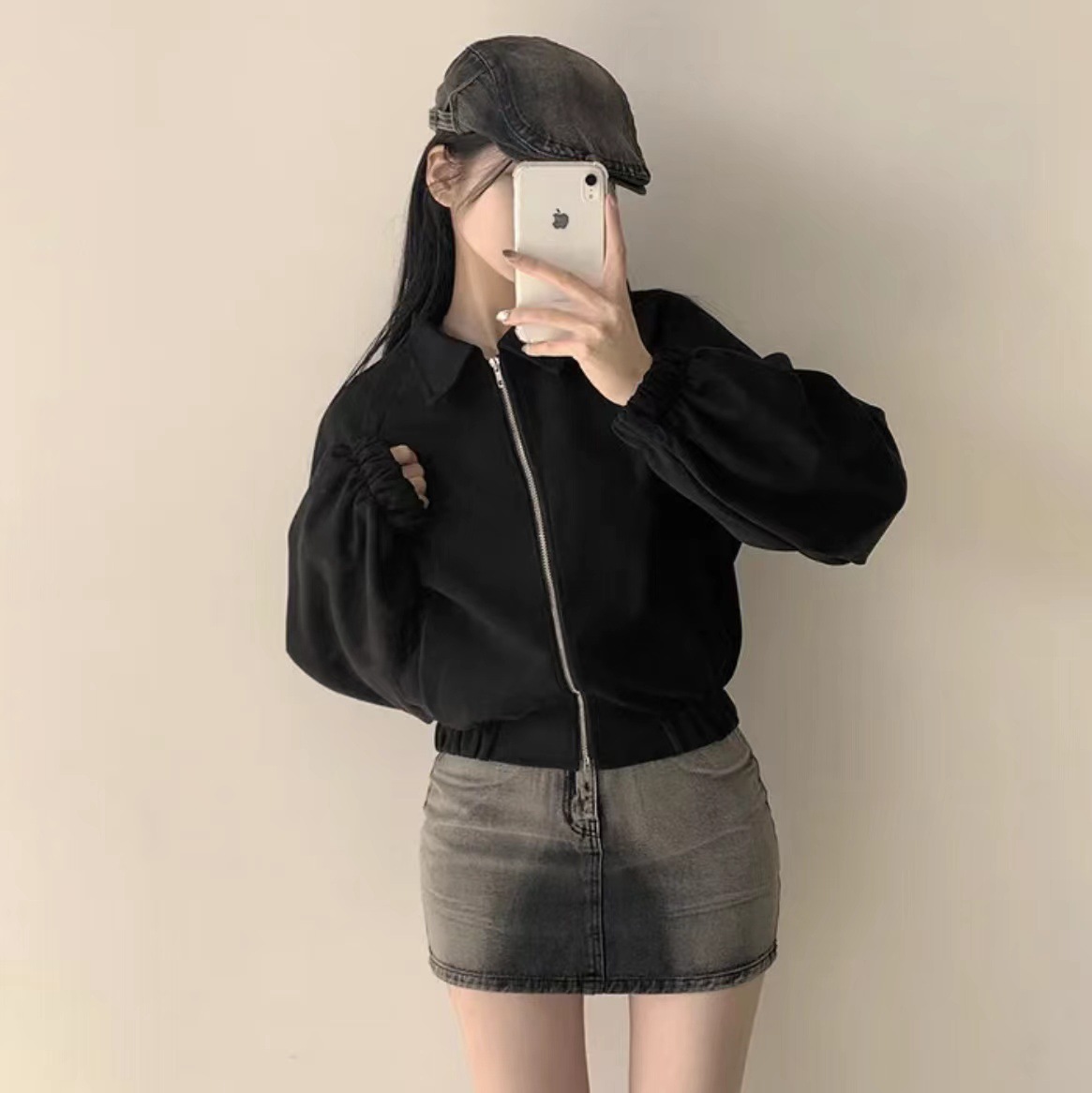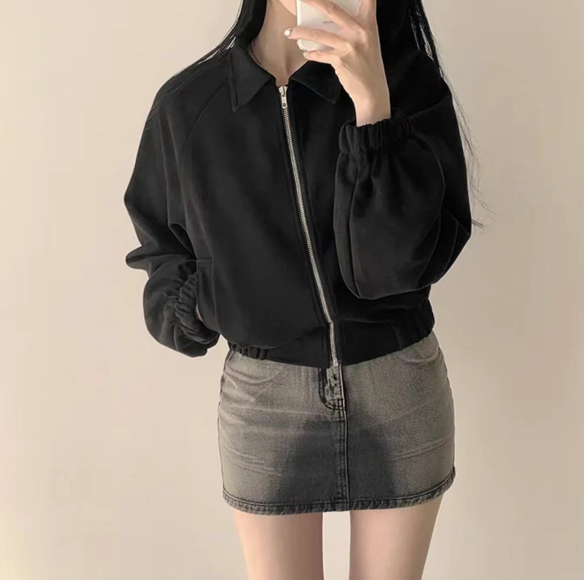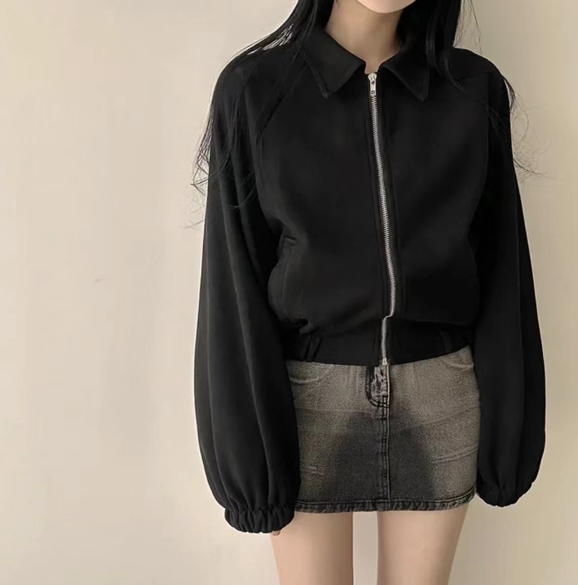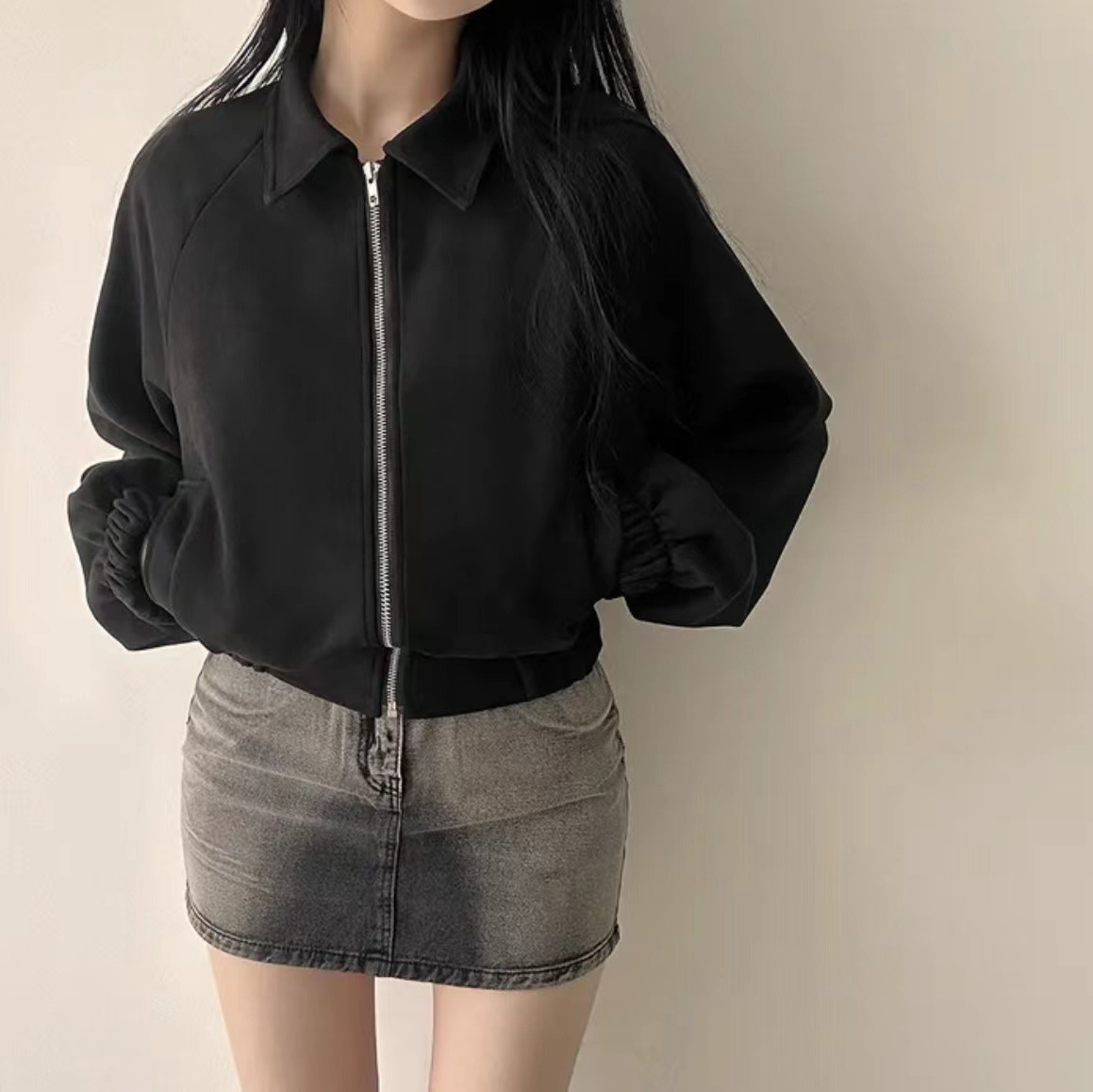 Корейская chic осень французская ретро-молния с молнией с воротником